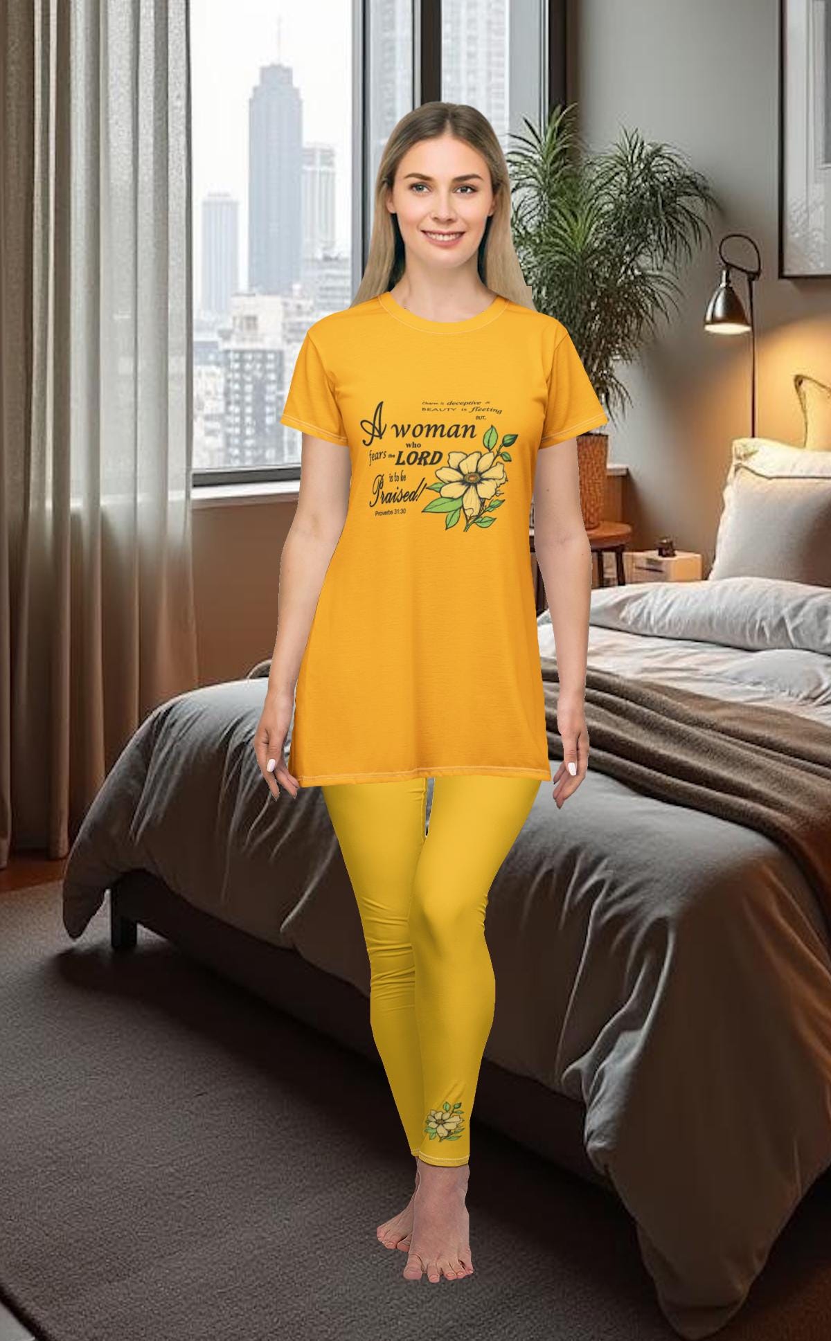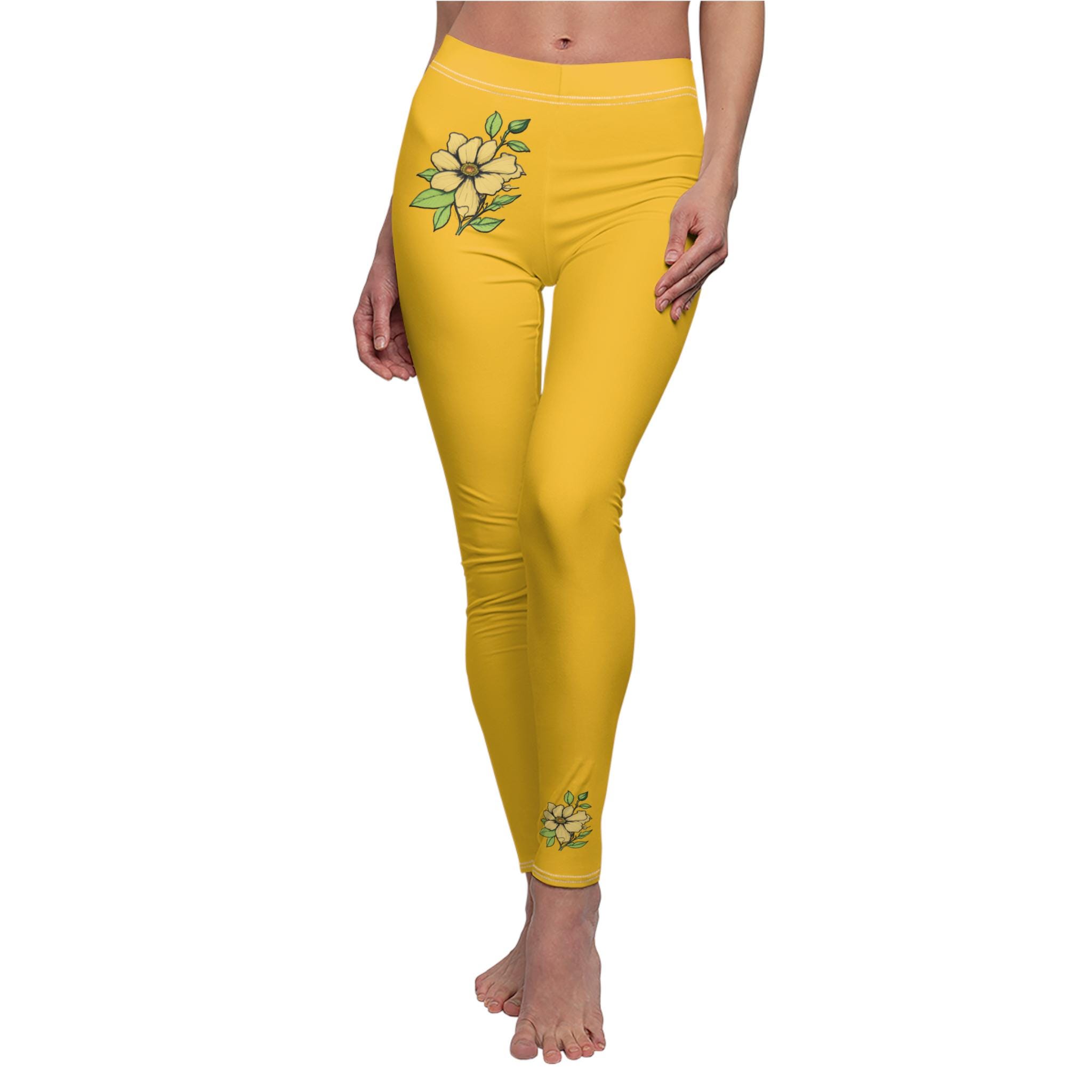 Solid Color Yellow Floral High Waisted Leggings for Women | Soft Yoga Pants with Minimal Flower Design | Stylish Workout & Lounge Wear
