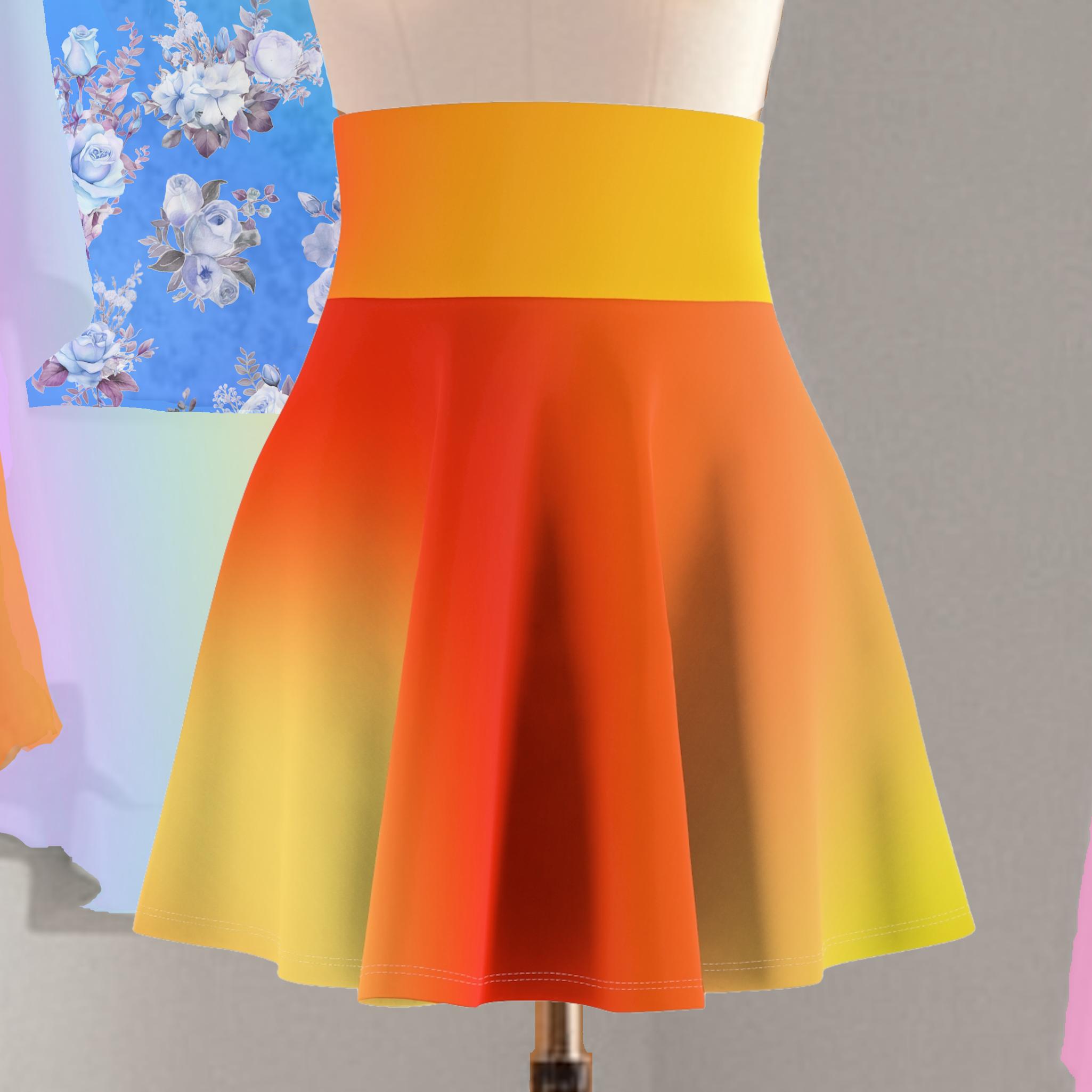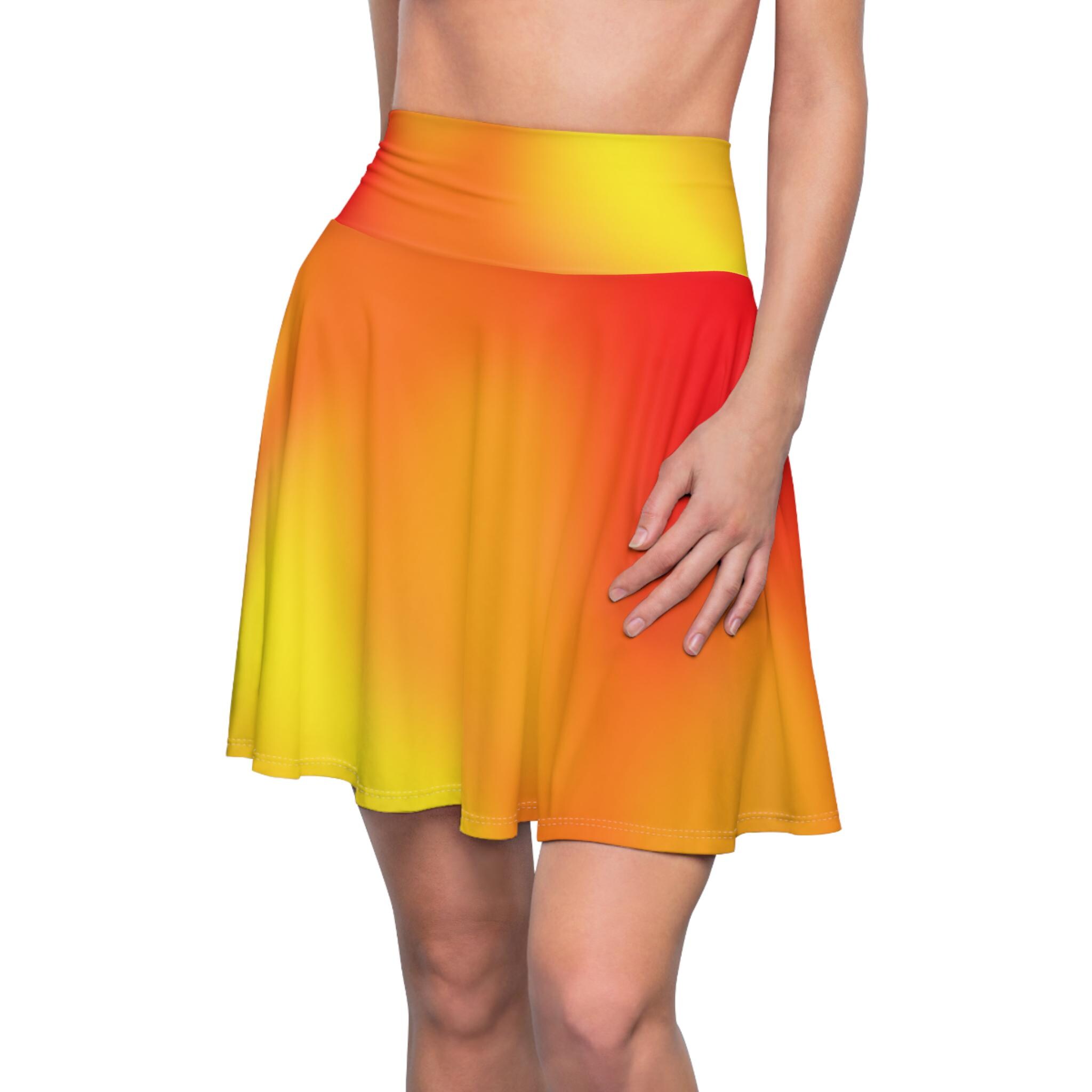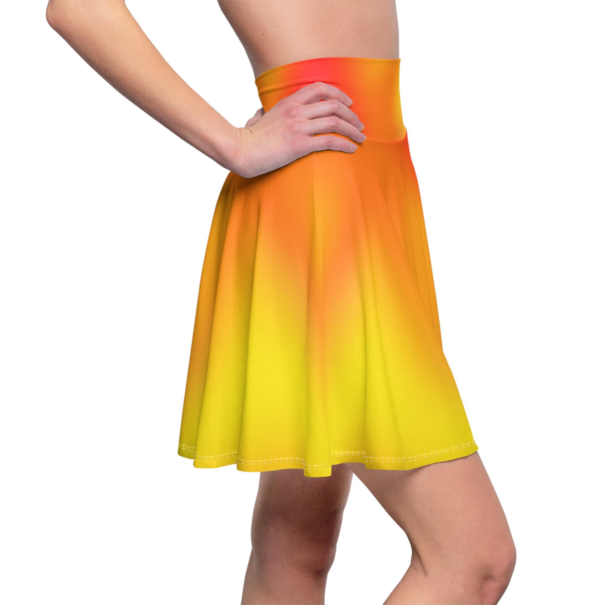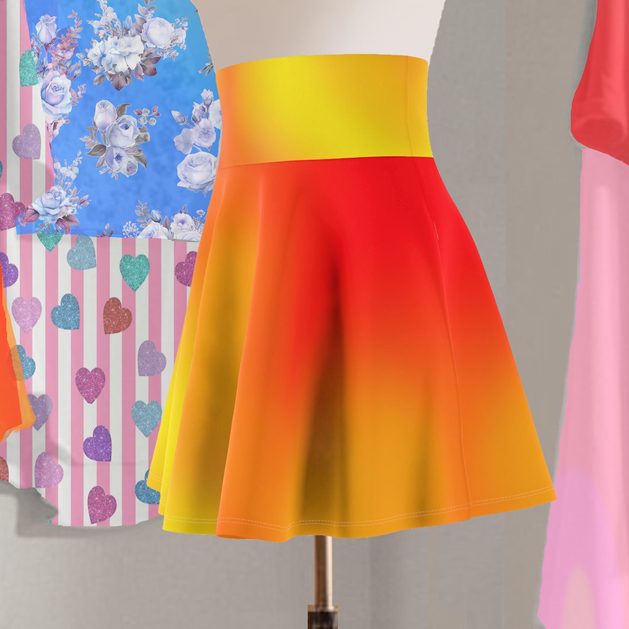 Introducing our stylish and versatile gradient colored skater skirt! This playful piece features warm hued tones that effortlessly transition from light to dark, creating a stunning ombre fire effect. Made from high-quality materials, this skirt is not only fashionable but also comfortable to wear. Perfect for adding a pop of color to your wardrobe, this skater skirt is a must-have for any fashion-forward individual. Get ready to stand out from the crowd in this eye-catching and unique piece! A versatile fit AOP skater skirt with a cozy, soft touch and a casual look. Inspired by the freedom of creativity, it will instantly become your everyday favorite.