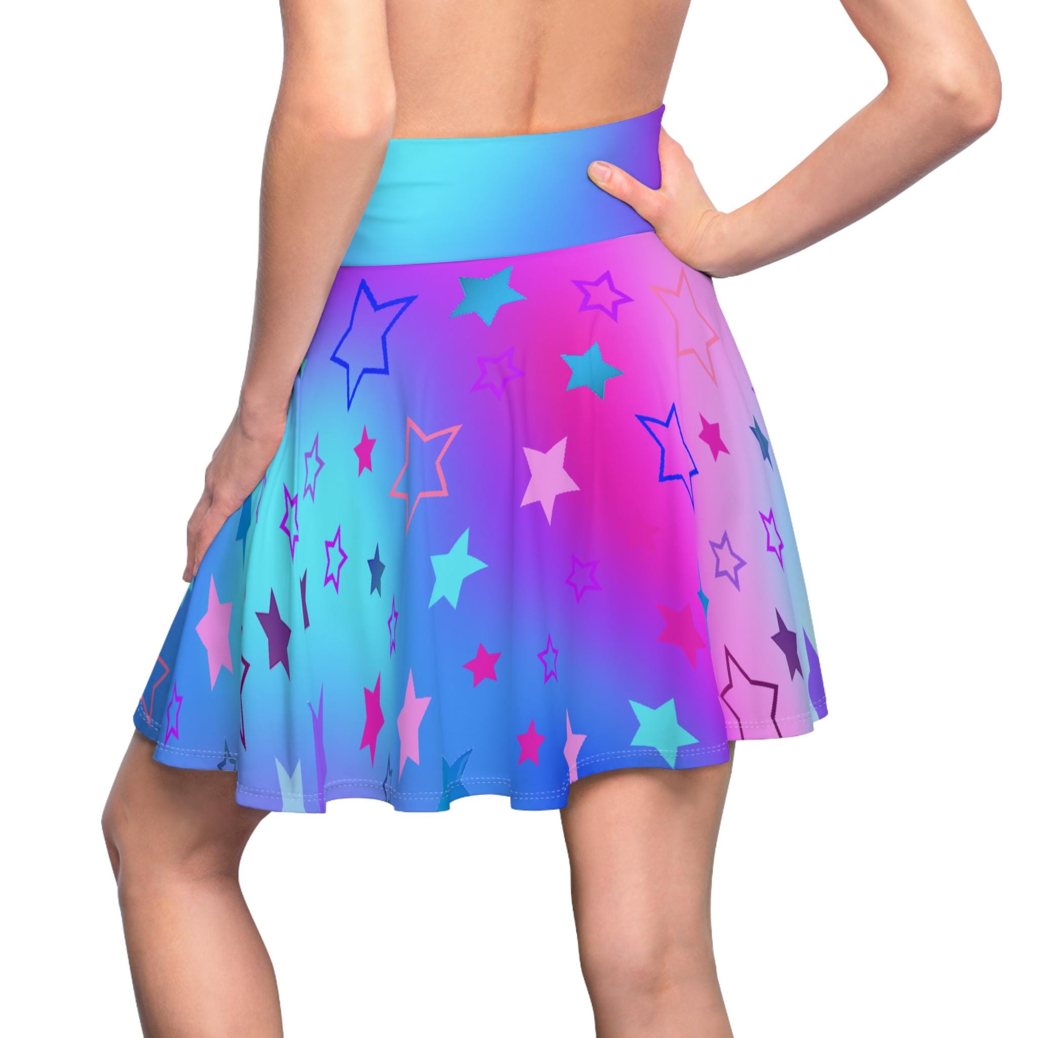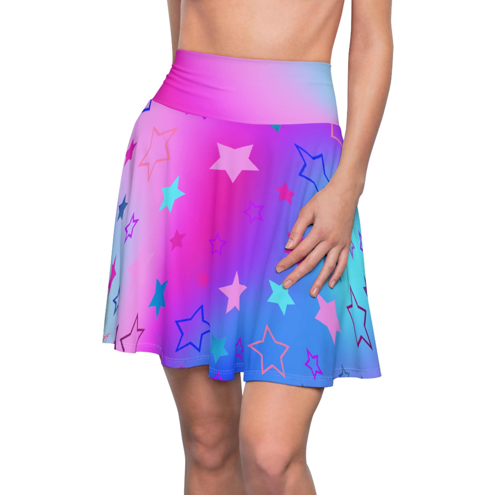 Add a touch of celestial charm to your wardrobe with this unique skater skirt featuring a mesmerizing display of stars against a cool toned, pink, purple, and blue gradient background. Perfect for adding a playful and whimsical element to your outfit, this skirt is sure to turn heads wherever you go. Made with high quality materials and a comfortable fit, this piece is a must-have for any fashion forward individual looking to make a statement. Suitable for both casual and dressed up occasions, this skater skirt is versatile and stylish, making it a wonderful addition to your collection. A versatile fit flared mini skirt with a cozy, soft touch and a casual look. Inspired by the freedom of creativity, it will instantly become your everyday favorite.
