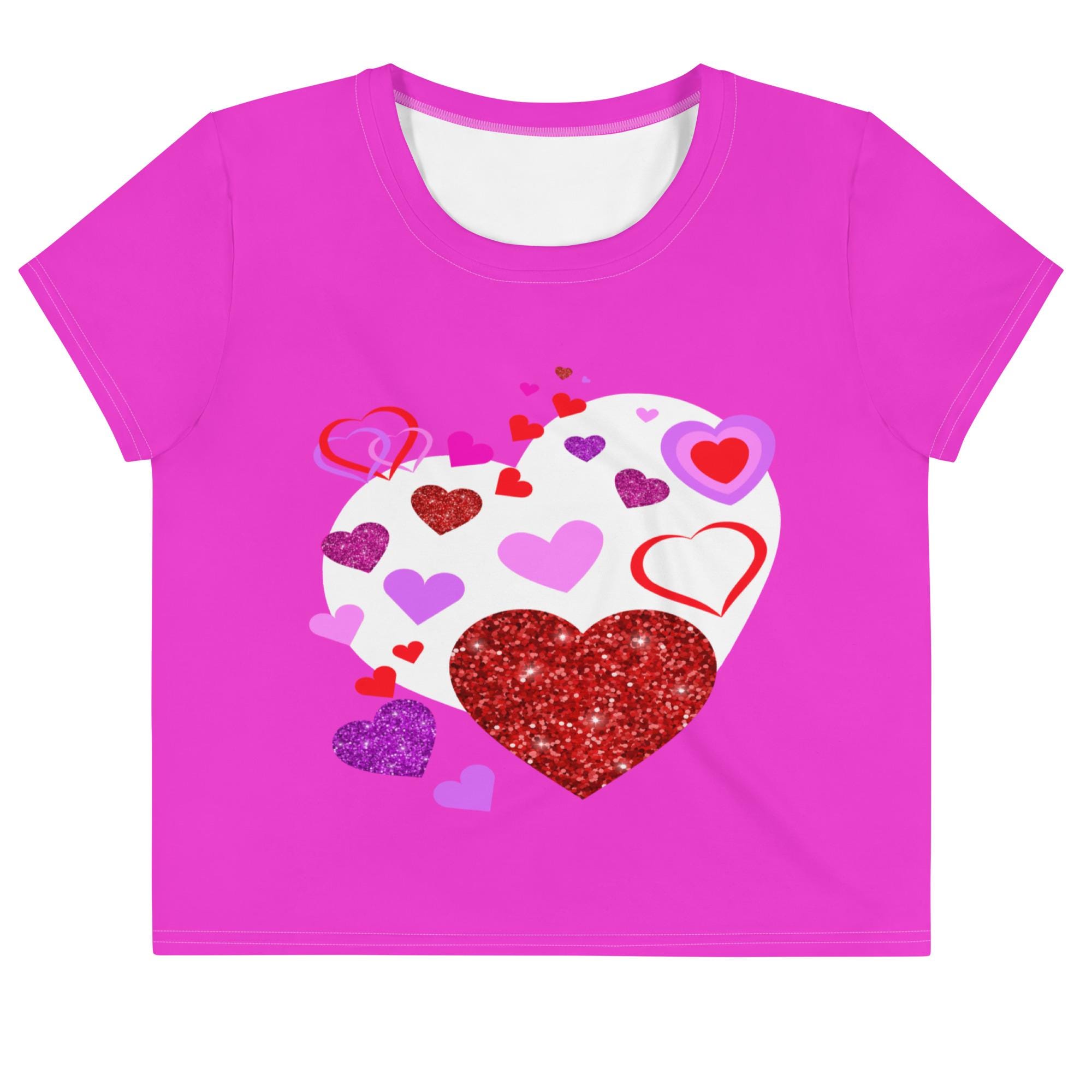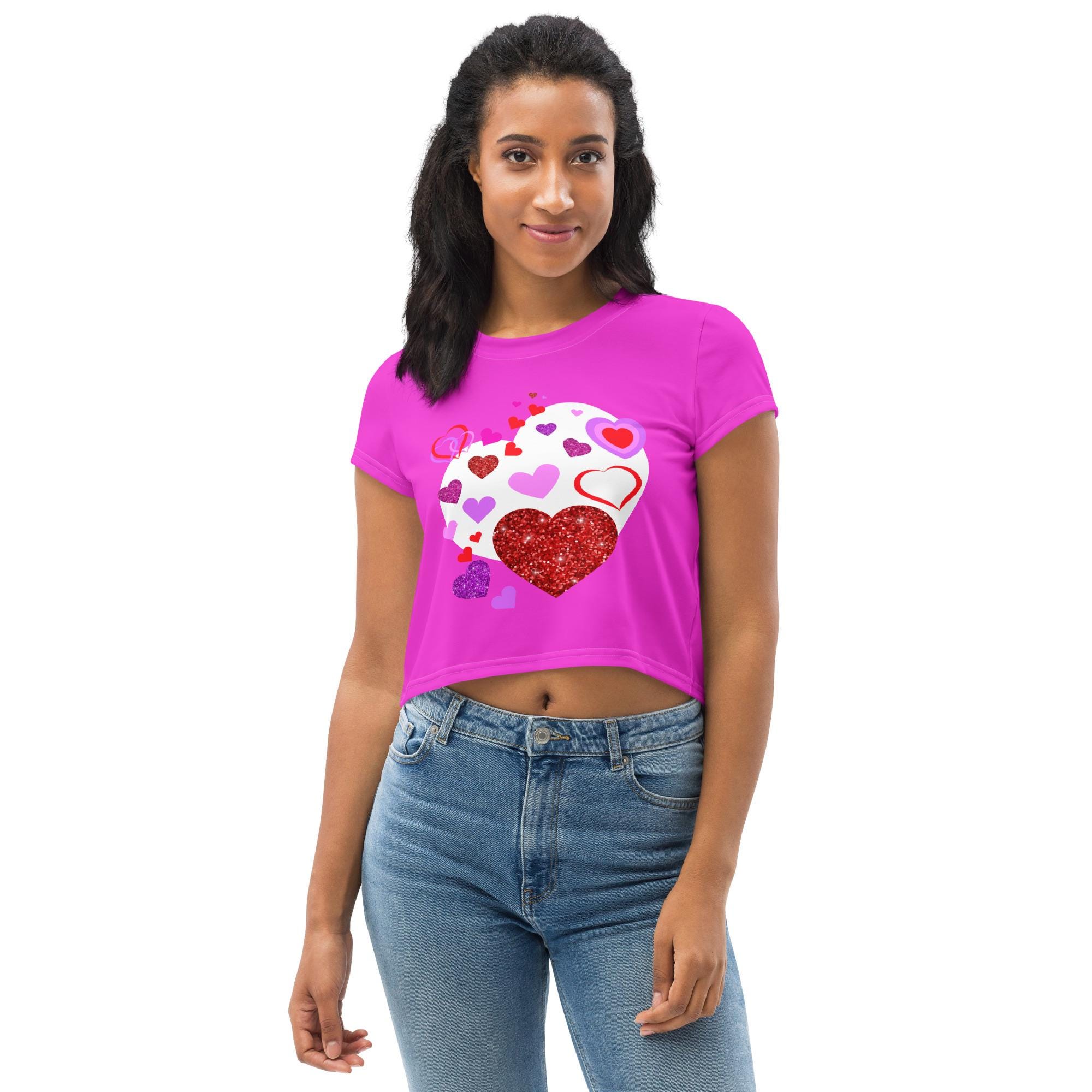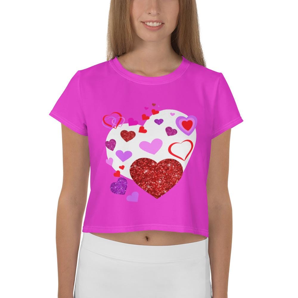 Introducing our adorable hot pink magenta crop tee with heart design! This stylish top is perfect for adding a pop of color to your wardrobe. The bright hot pink and magenta hues are sure to make you stand out in a crowd, while the heart design adds a fun and playful touch. Made from high-quality materials, this crop tee is not only fashionable but also comfy to wear all day long. Pair it with your favorite jeans or skirt for a cute and trendy look that will turn heads wherever you go. A must-have addition to any fashionista's collection! The original all-over design is definitely worth showing off, so don't hesitate to own one of these tees - they're meant to be adored.
