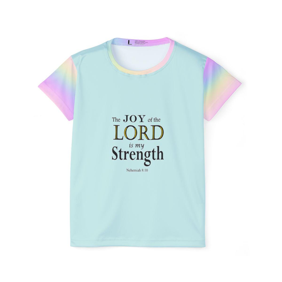 Introducing our unique and uplifting women's jersey t-shirt featuring a motivating Bible verse of strength set against a vibrant rainbow gradient all-over print background. The uplifting message is also spiritually inspiring. This comfortable and lightweight t-shirt is perfect for your active lifestyle while spreading positivity and faith wherever you go. Whether you're looking for a meaningful gift or a special piece for yourself, this shirt is sure to inspire and brighten your day. Add this unique piece to your workout wardrobe today and let the power of scripture fuel your fitness journey!