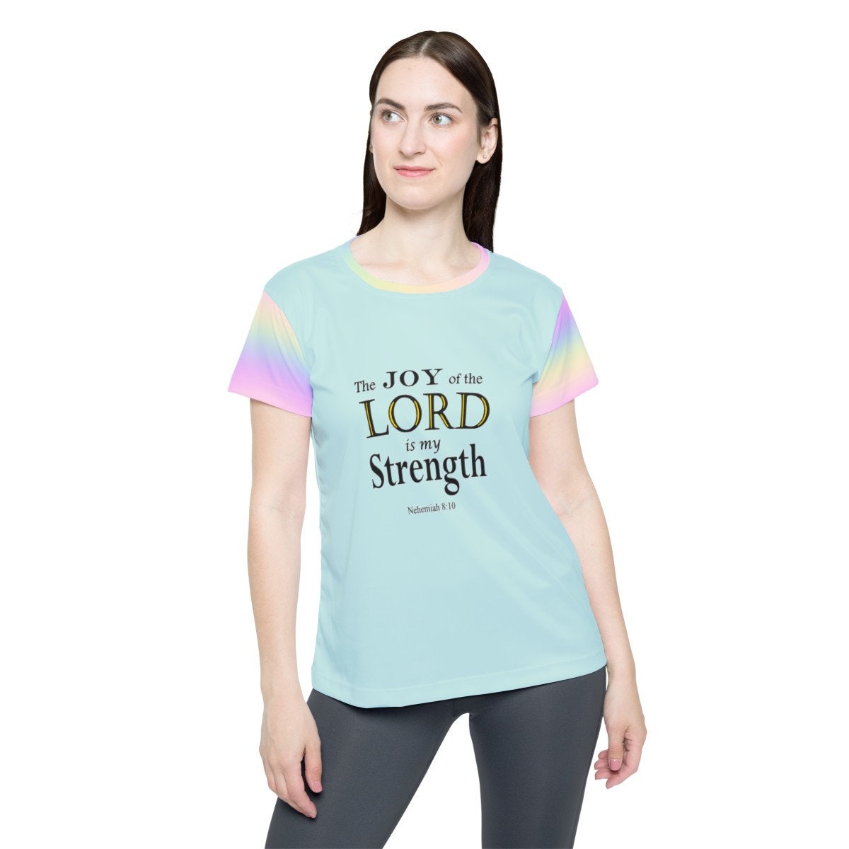 Christian Activewear Tee: Pastel Rainbow Bible Verse, Women's Workout Top