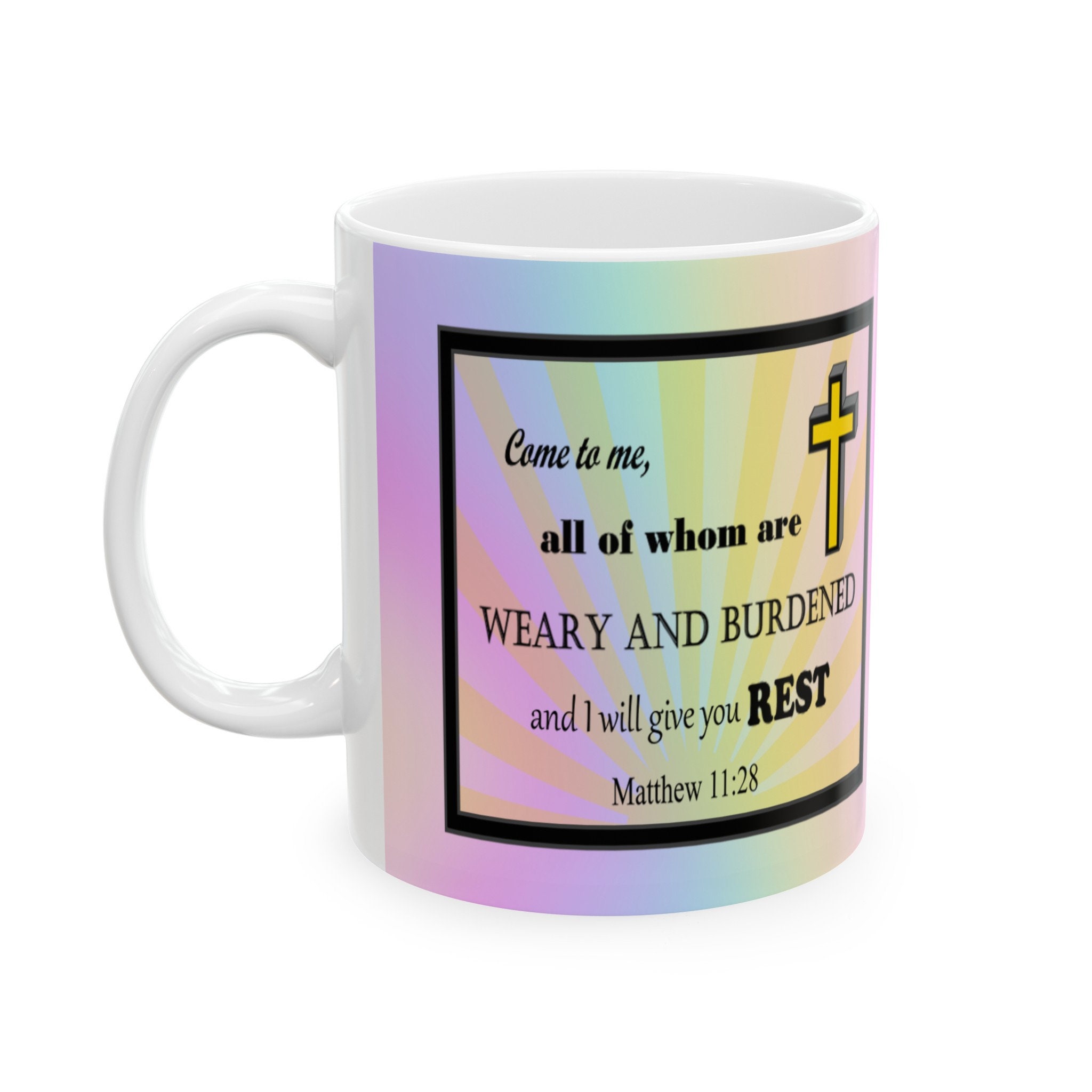 Imagine starting your day with a comforting sip of coffee and a powerful verse reminding you of strength, hope, or resilience. It's like a mini-devotional moment in the midst of your busy day, providing a touch of spiritual grounding and positivity. Add a touch of joy and inspiration to your morning routine with this beautiful ceramic coffee mug! Featuring a stunning design of a rainbow background and an inspirational Bible verse, this mug is sure to uplift your spirits with every sip. Made with high-quality ceramic, this mug is both durable and stylish, making it the perfect addition to your kitchen or as a thoughtful gift for a loved one. Start your day off on a positive note with this one-of-a-kind piece!
