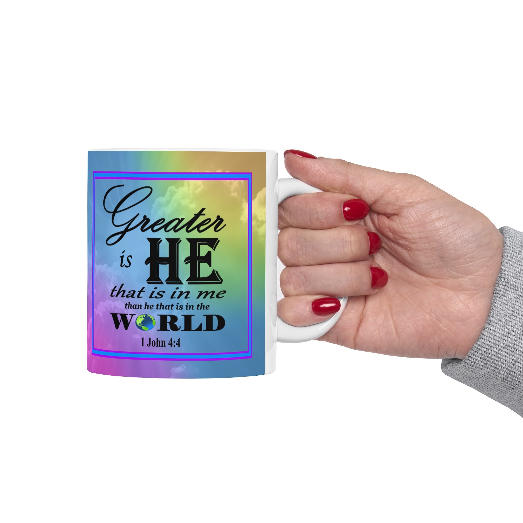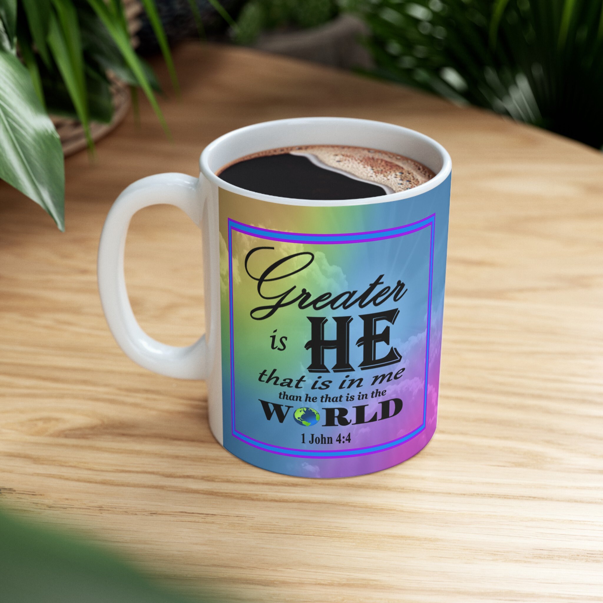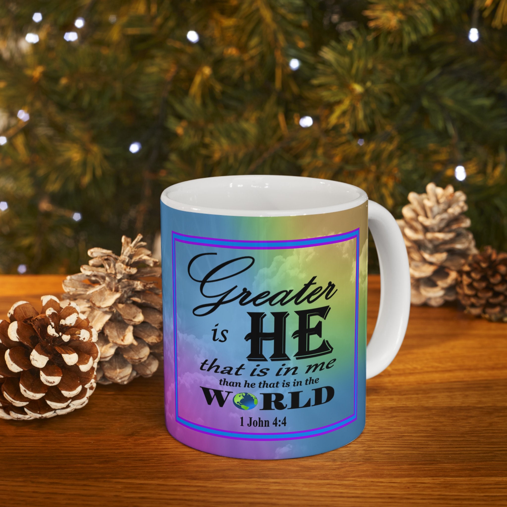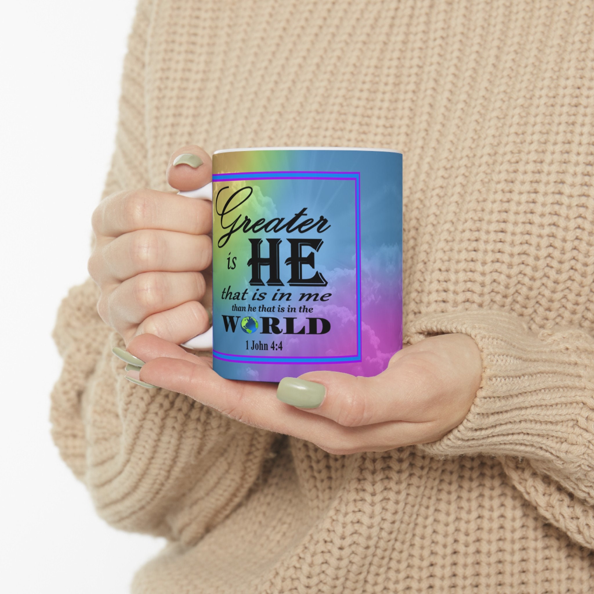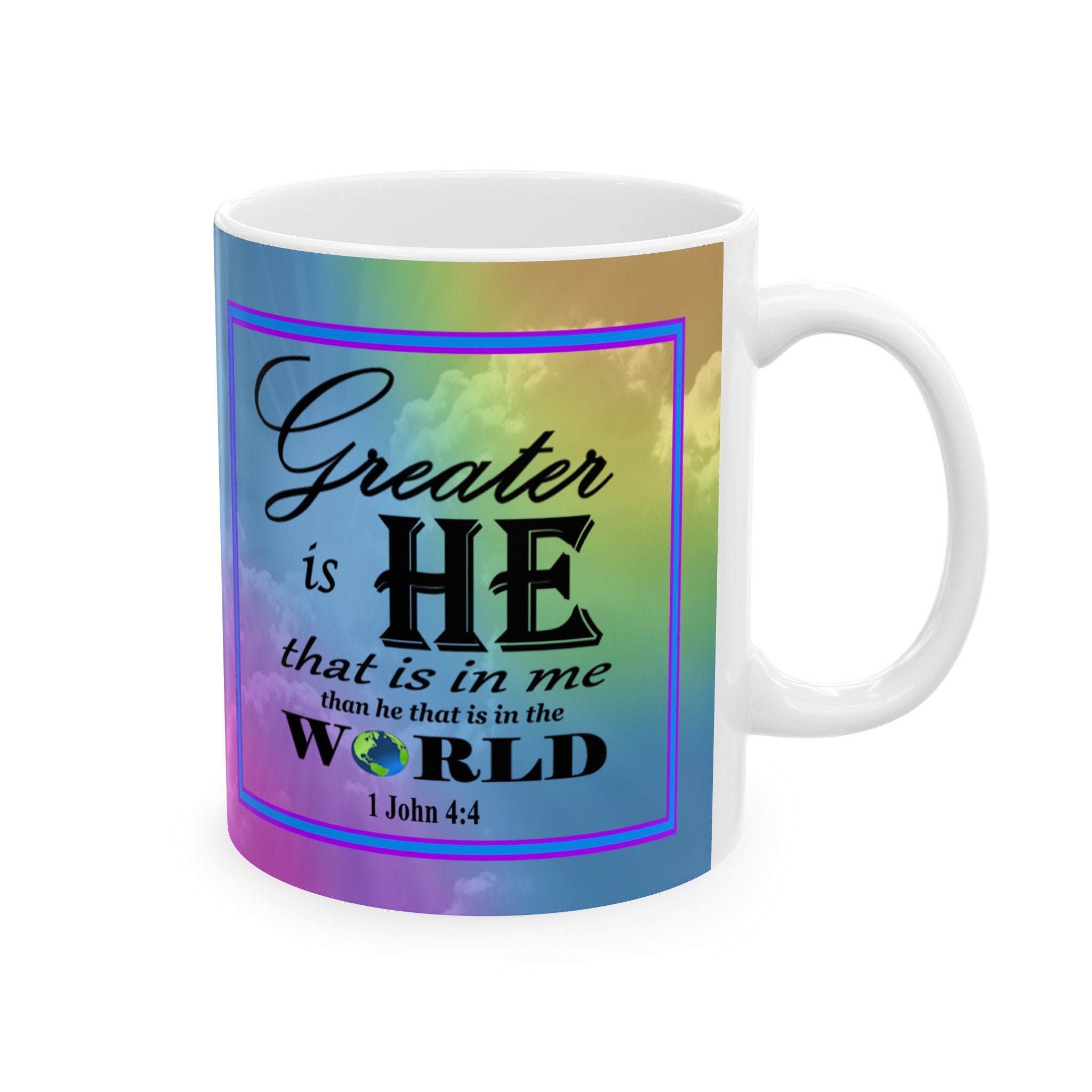 Imagine starting your day with a comforting sip of coffee and a powerful verse reminding you of strength, hope, or resilience. It's like a mini-devotional moment in the midst of your busy day, providing a touch of spiritual grounding and positivity. Add a touch of joy and inspiration to your morning routine with this beautiful ceramic coffee mug! Featuring a stunning design of a rainbow background and an inspirational Bible verse, this mug is sure to uplift your spirits with every sip. Made with high-quality ceramic, this mug is both durable and stylish, making it the perfect addition to your kitchen or as a thoughtful gift for a loved one. Start your day off on a positive note with this one-of-a-kind piece!