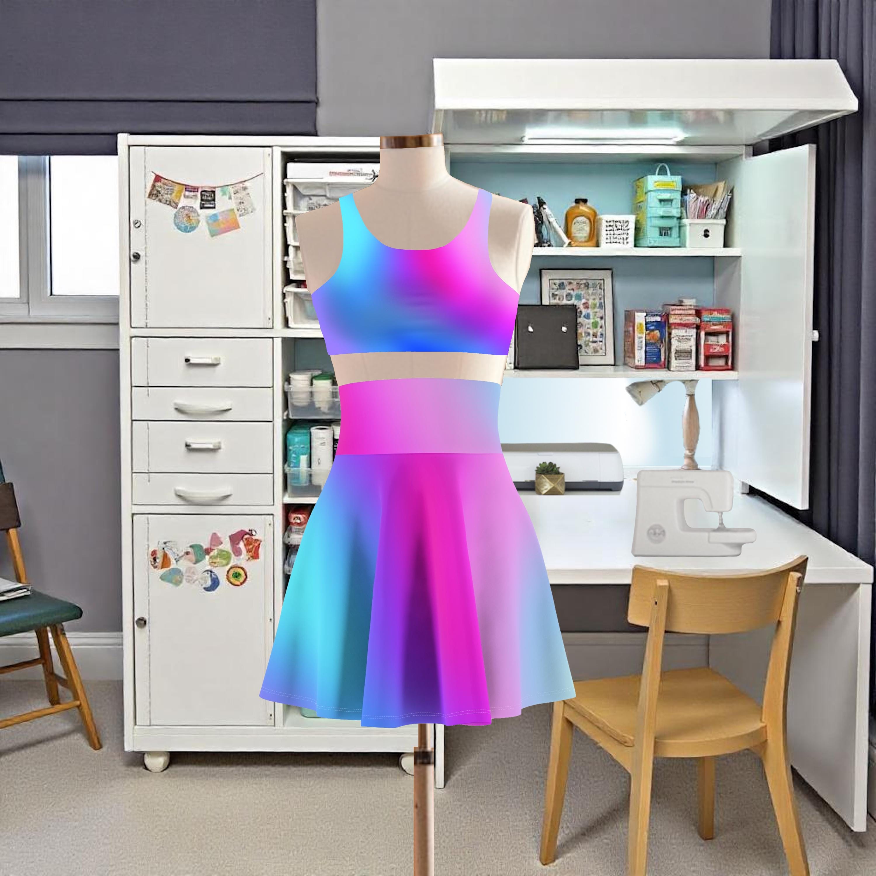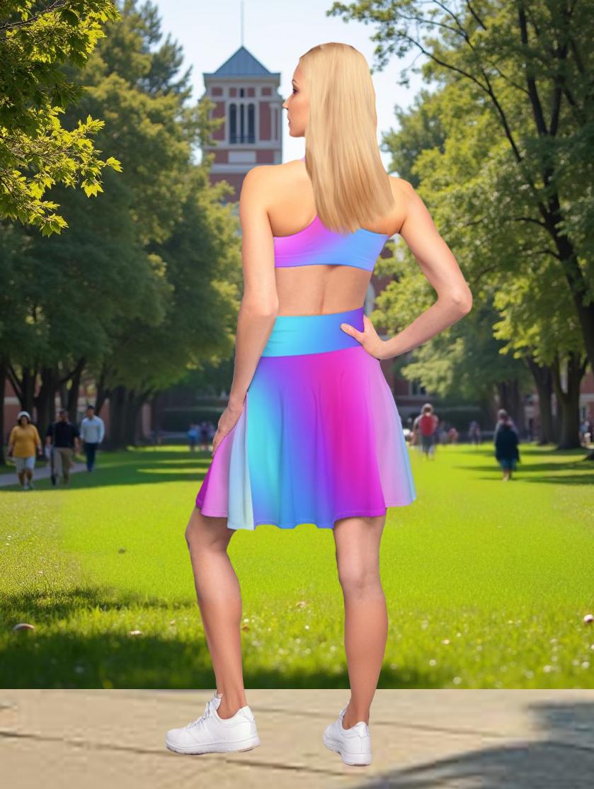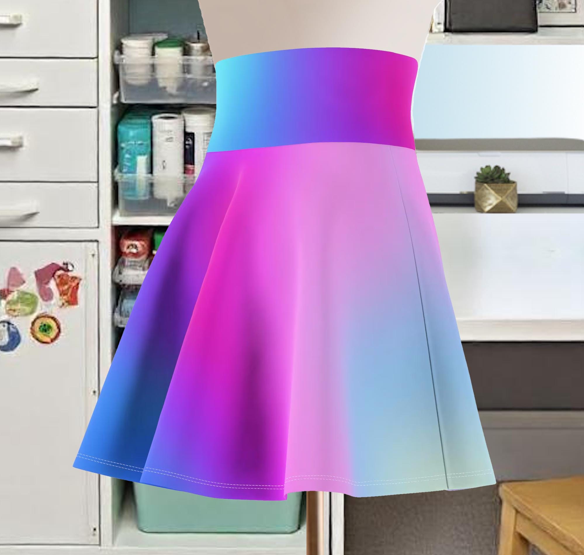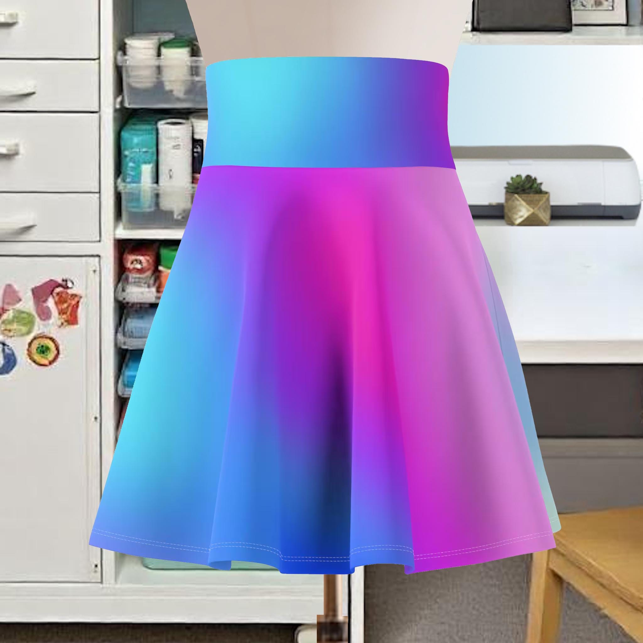 Add a pop of color to your wardrobe with this stunning ombre skater skirt featuring a mesmerizing gradient of blue and purple hues. The flowing silhouette and vibrant colors make this skirt perfect for any occasion, whether you're hitting the skate park or heading out for a night on the town. Made with a soft and stretchy fabric, this skater skirt is not only fashionable but comfy to wear as well. Stand out from the crowd and showcase your unique style with this eye-catching piece! A versatile fit AOP skater skirt with a cozy, soft touch and a casual look. Inspired by the freedom of creativity, it will instantly become your everyday favorite.