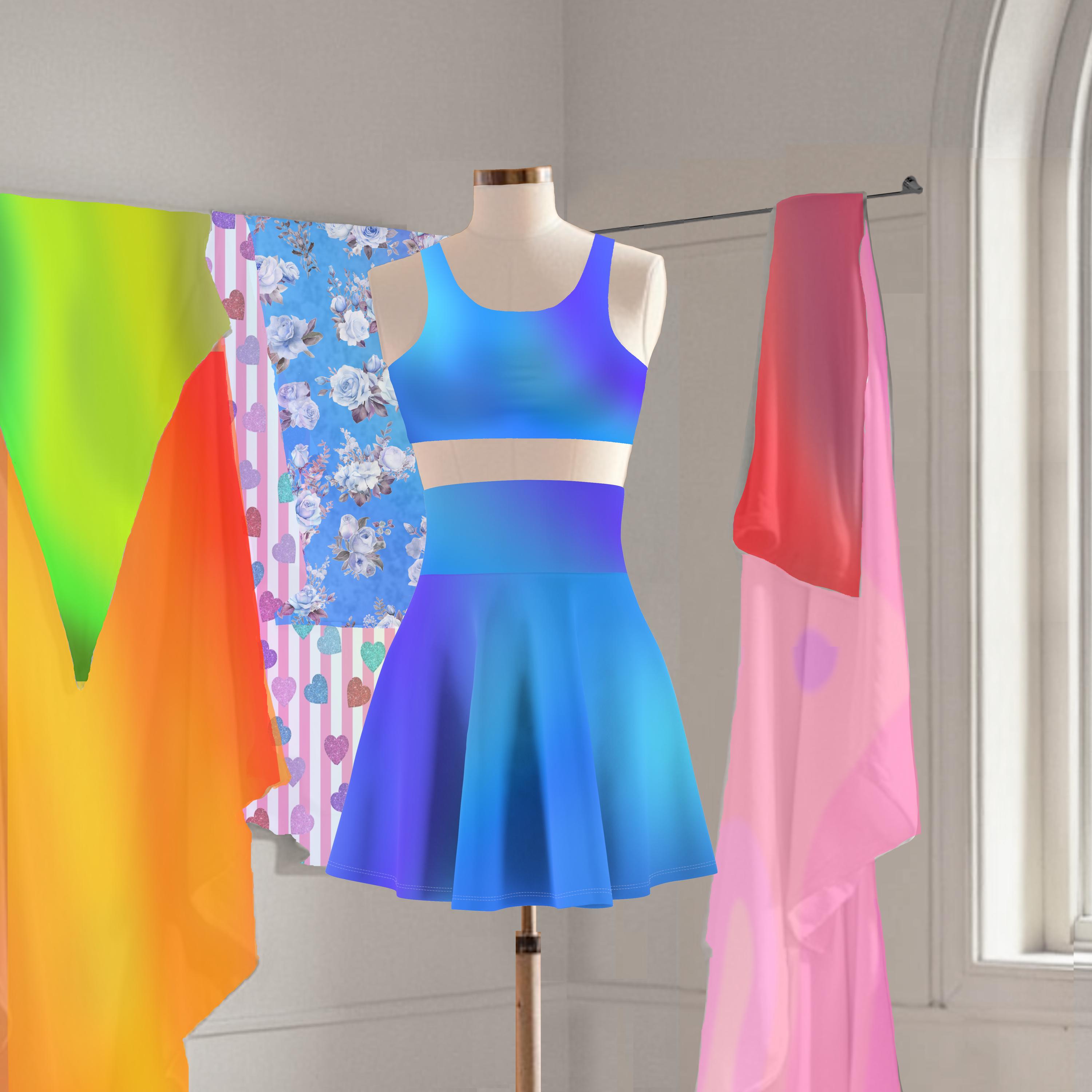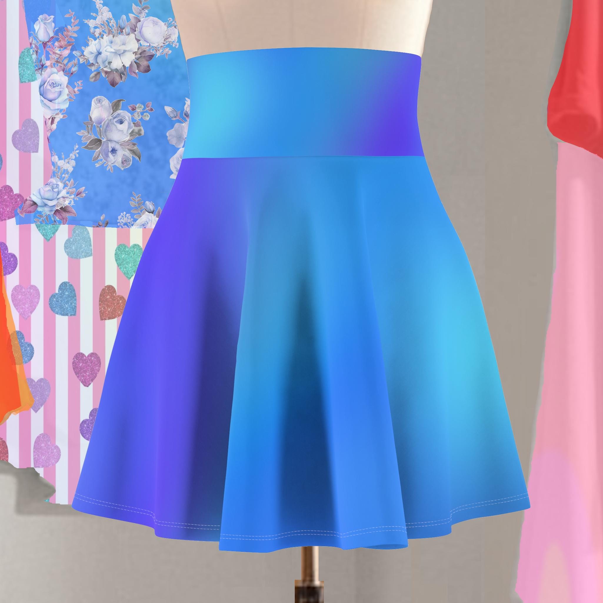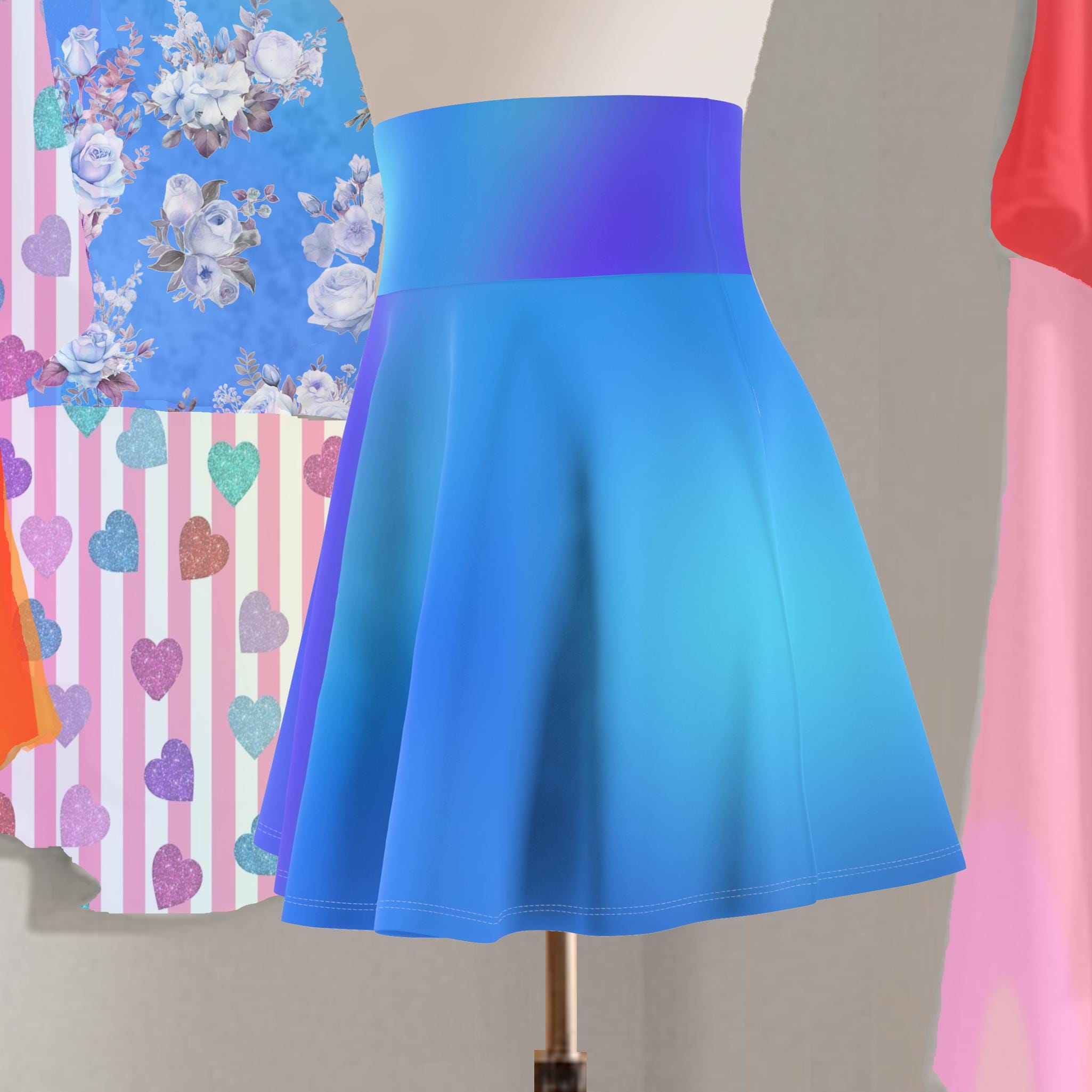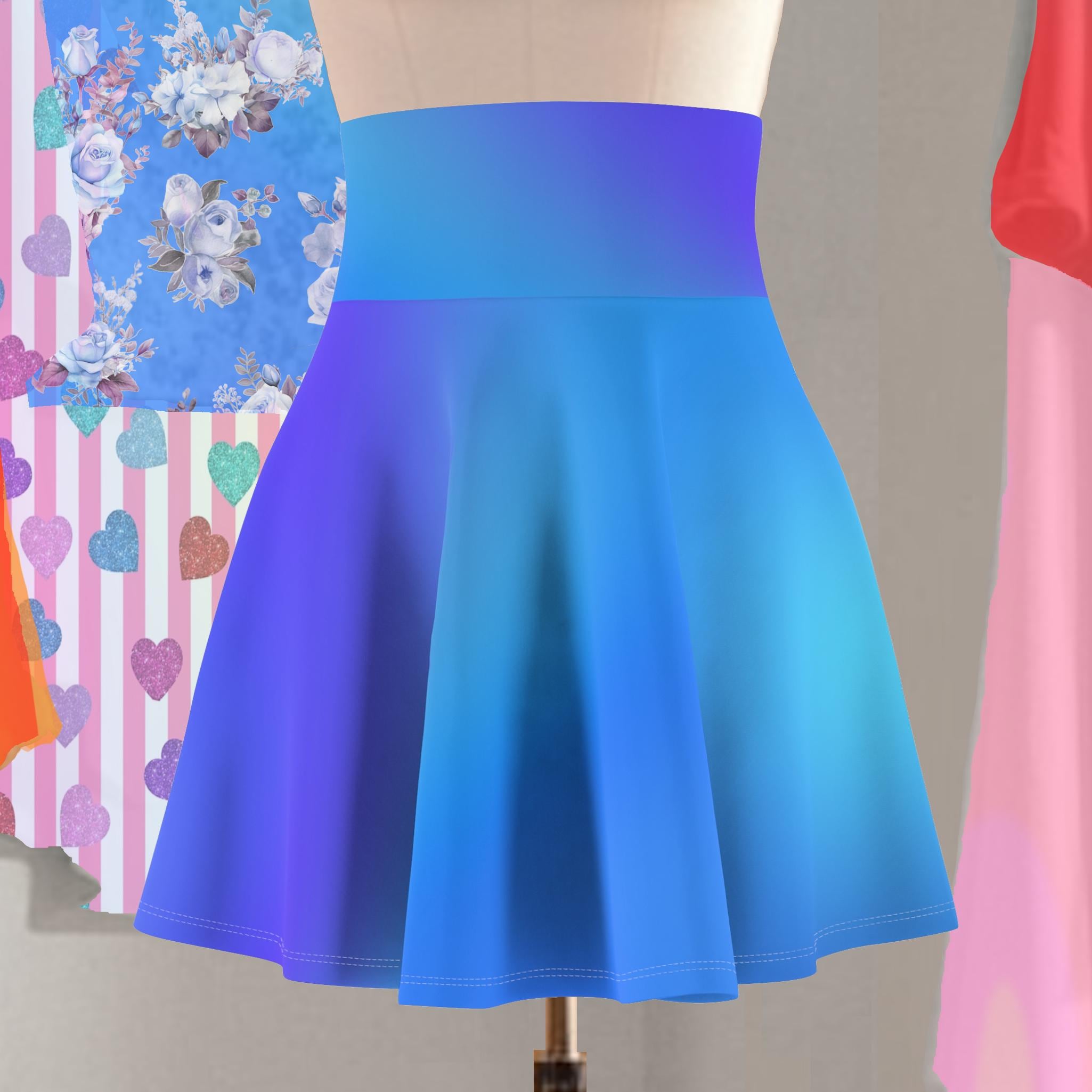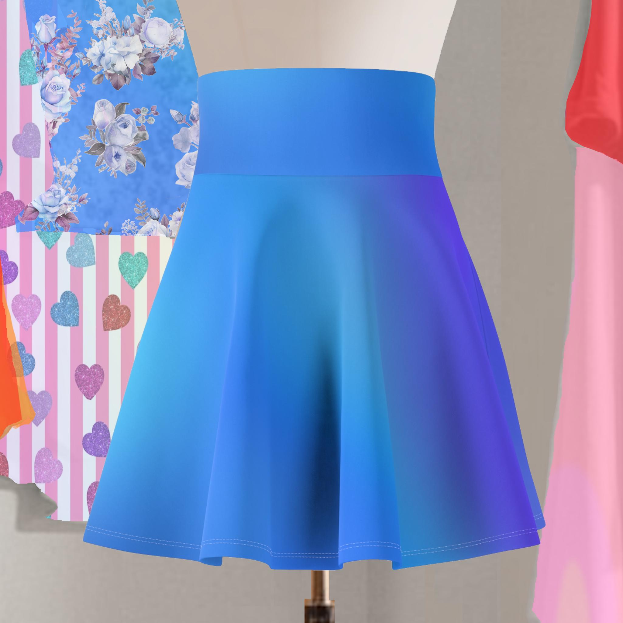 Introducing our stunning blue gradient colored skater skirt, available in multiple colors! This vibrant and stylish skirt features a beautiful ombre effect that transitions seamlessly from one color to another, creating a unique and eye-catching look. Made from high-quality materials, this skirt is both comfortable to wear and easy to mix and match with your favorite tops and accessories. Perfect for adding a pop of color to your wardrobe, this versatile piece is a must-have for any fashion-forward individual. Choose your favorite color combination and stand out from the crowd with this one-of-a-kind gradient colored skater skirt! A versatile fit AOP skater skirt with a cozy, soft touch and a casual look. Inspired by the freedom of creativity, it will instantly become your everyday favorite.