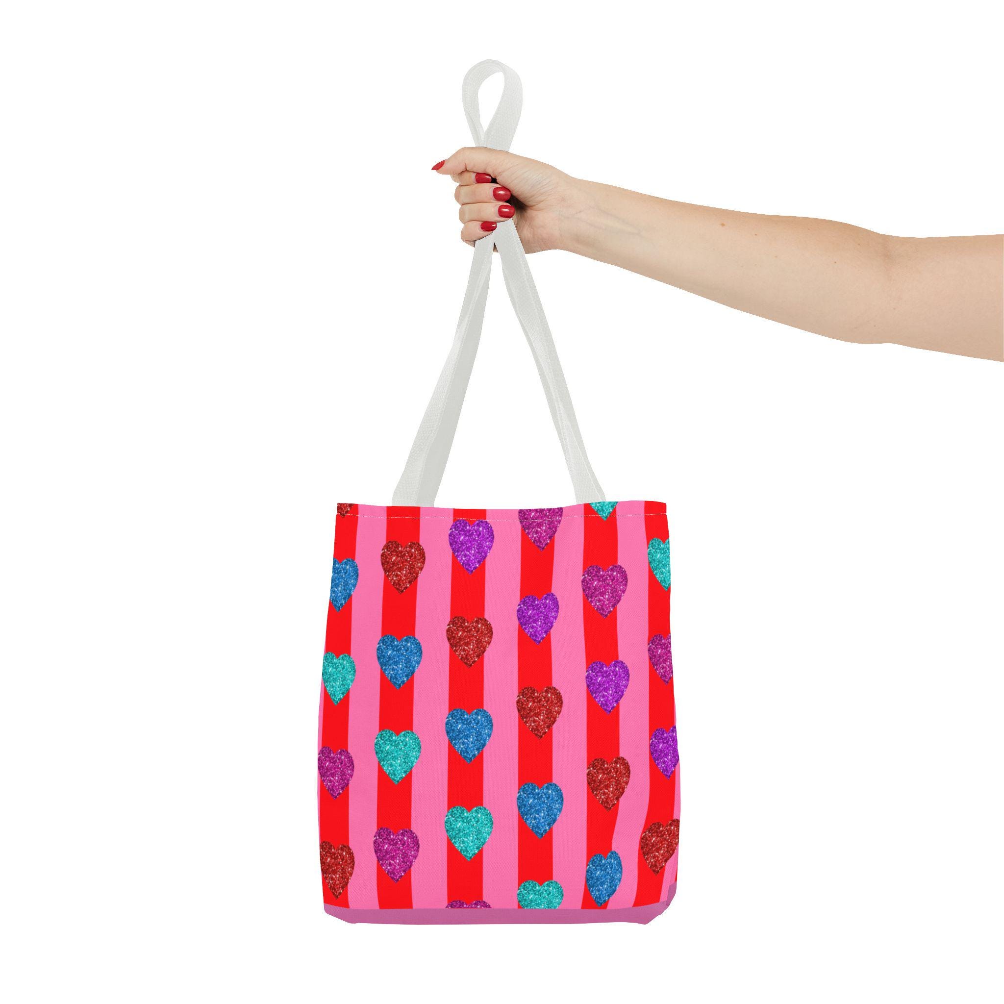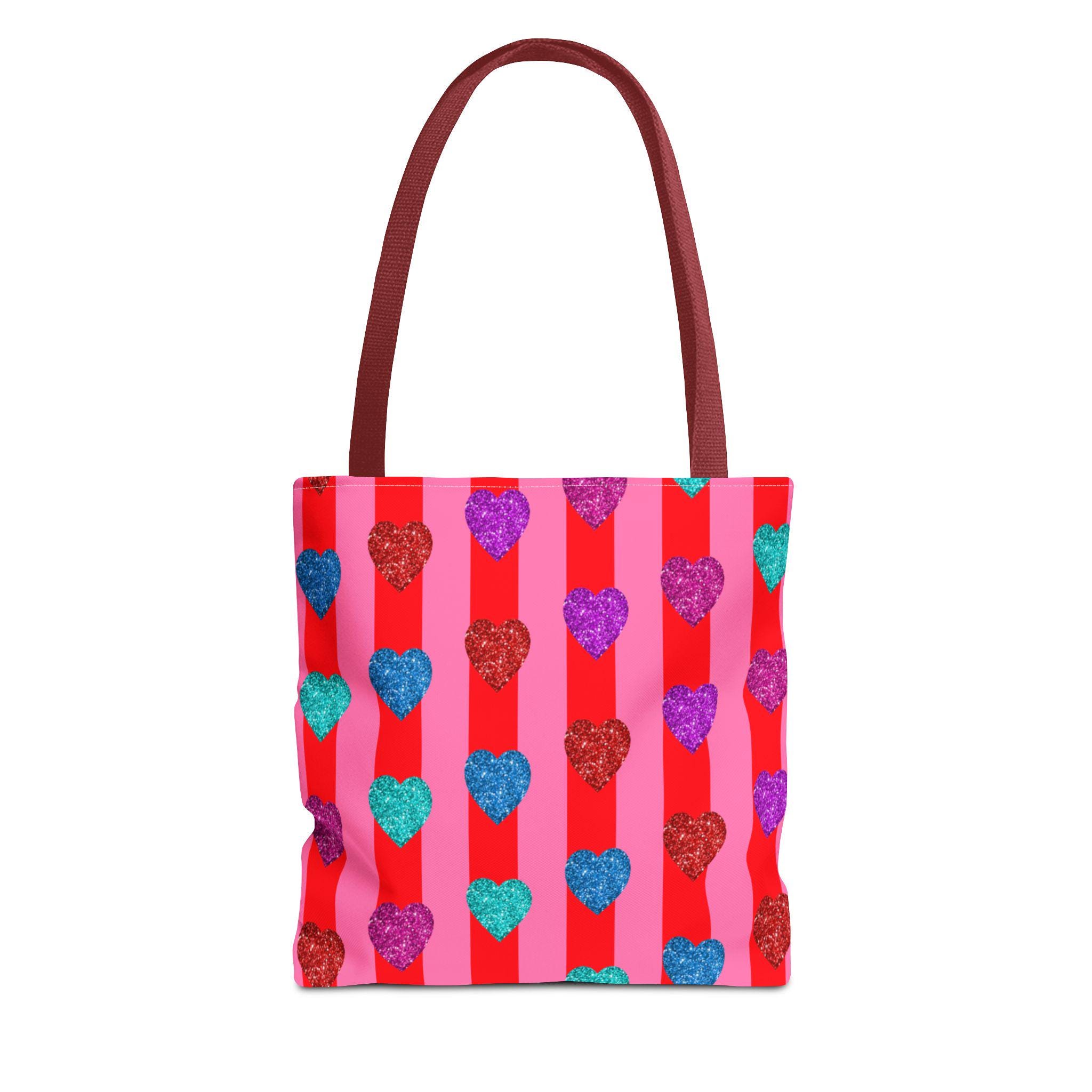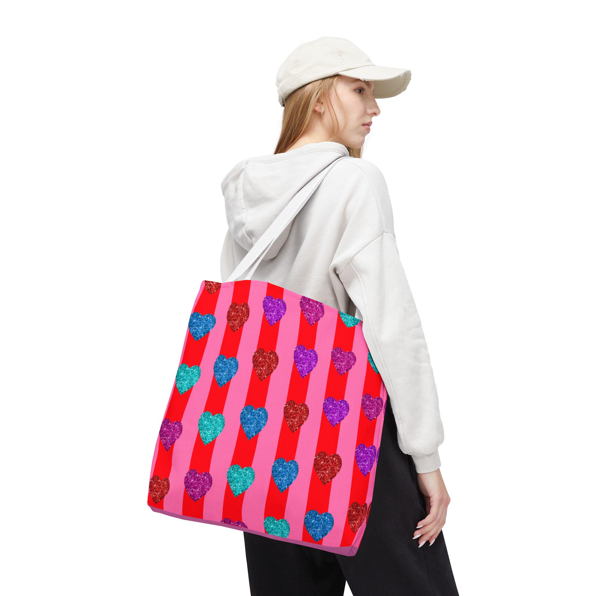 This vibrant Tote Bag features colorful hearts lined up on pink and red stripes, creating a fun and cheerful vibe. Perfect for everyday use, this durable bag is ideal for carrying groceries, books, and other essentials. It is relevant for Valentine's Day, birthdays, and everyday use by those who love colorful designs.