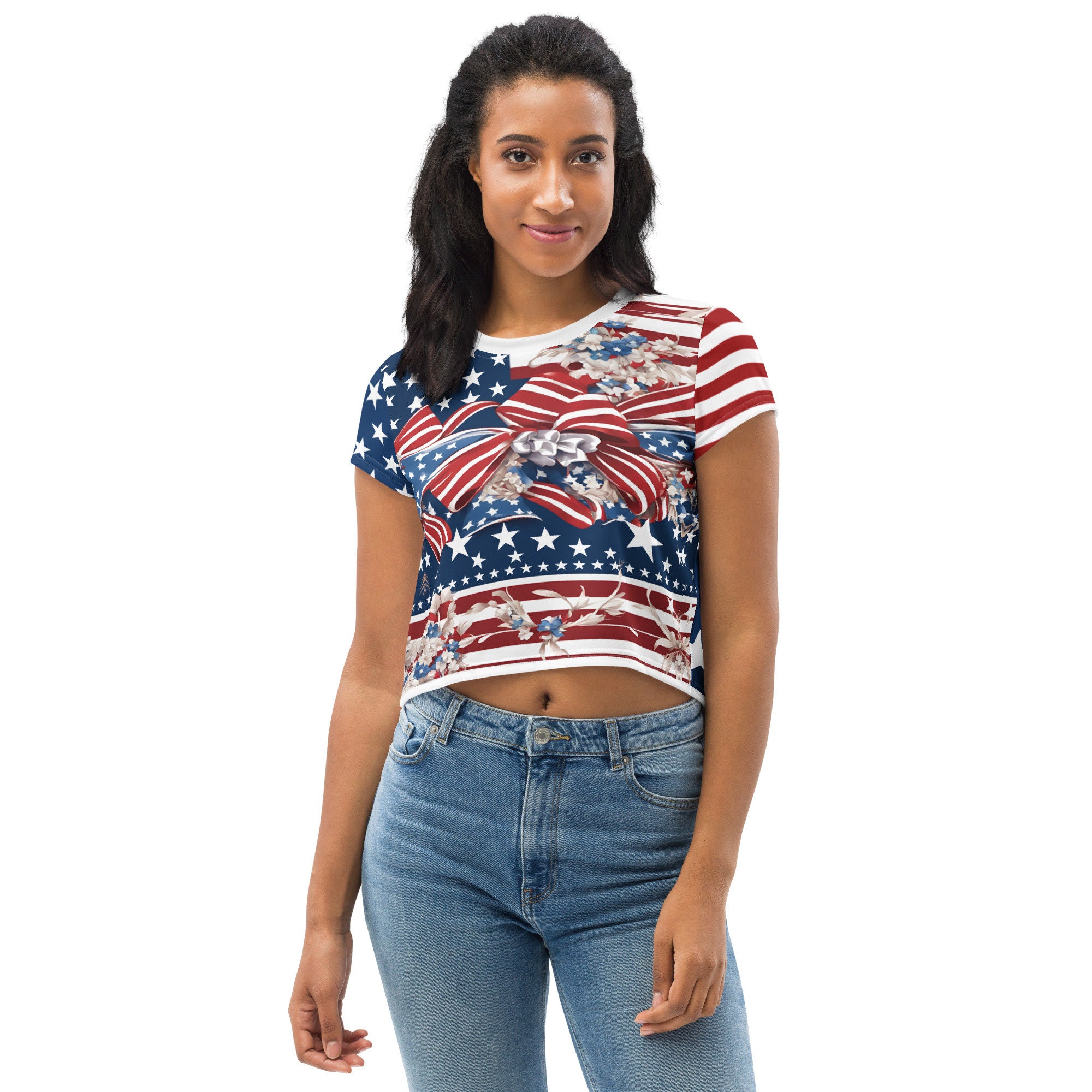 Looking for you next wardrobe favorite? Well, look no further because this crop tee is printed and sewn to fit you just right. Introducing our patriotic USA flag crop tee, perfect for showing off your American pride in style! These trendy crop tops feature vibrant red, white, and blue flag design, adorned with delicate flowers and bows for a touch of feminine charm. Made from soft and comfy fabric, this crop tee is ideal for celebrating holidays, attending parades, or simply adding a pop of patriotism to your everyday wardrobe. Stand out in the crowd with this unique and eye-catching piece that captures the essence of freedom and unity. To top that off, the original all-over design is definitely worth showing off, so don't hesitate to own one of these tees - they're meant to be adored.