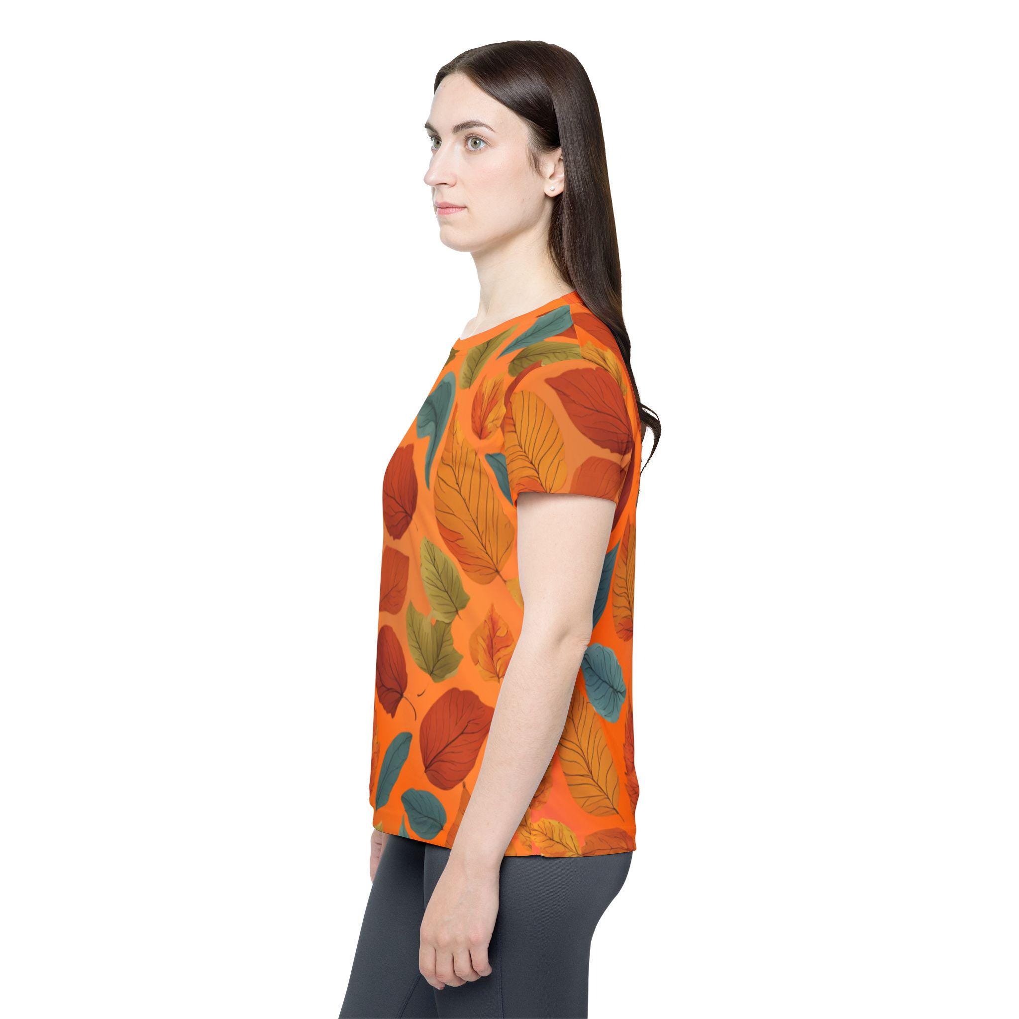 Autumn Vibes: Women's Jersey T-Shirt with Fall Leaves on Orange Background