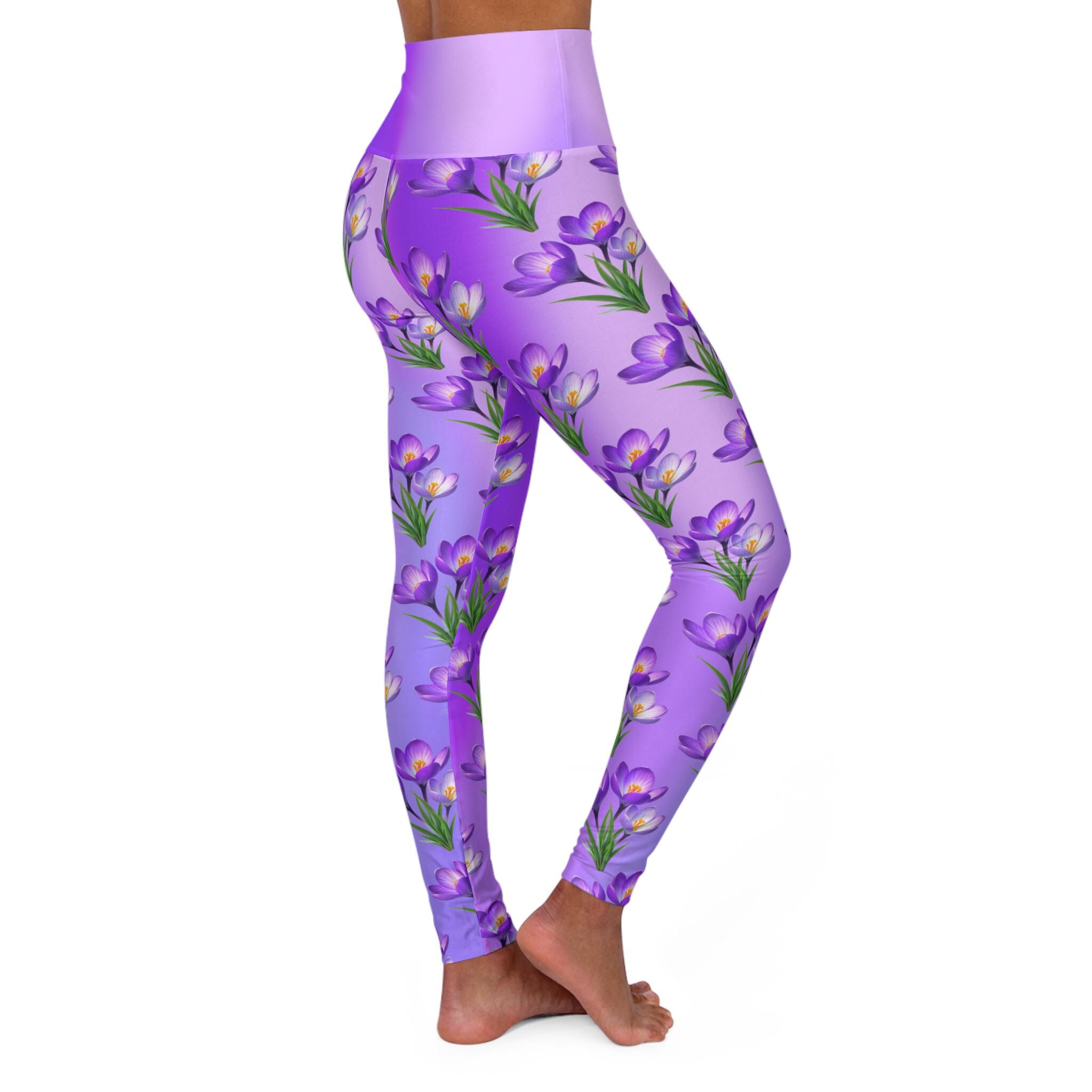 These vibrant purple tulip leggings on a purple gradient background are perfect for yoga practice or lounging at home. The high-waisted design provides a flattering fit and the 4-way stretch fabric allows for maximum freedom of movement. Ideal for yoga enthusiasts and nature lovers, these leggings are great for springtime workouts or everyday wear.