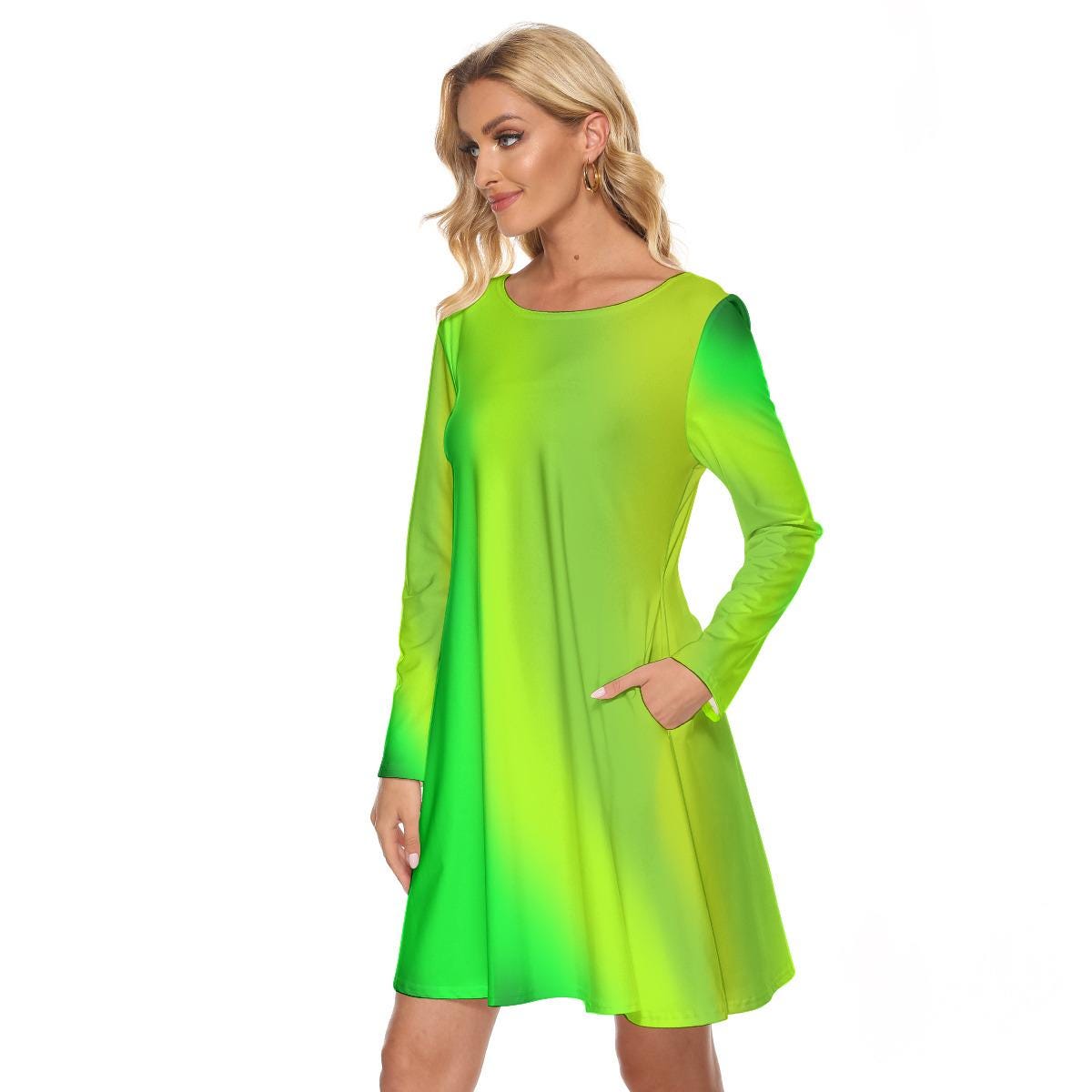 Introducing our stylish and versatile Green long sleeve Women's Crew Neck knee length Dress! Perfect for any occasion, these dresses feature gradient colored backgrounds in multiple colors, adding a unique and eye-catching touch to your outfit. Made with high-quality fabric, these dresses are not only fashionable but also comfortable to wear all day long. Elevate your wardrobe with a piece that effortlessly combines style and comfort!