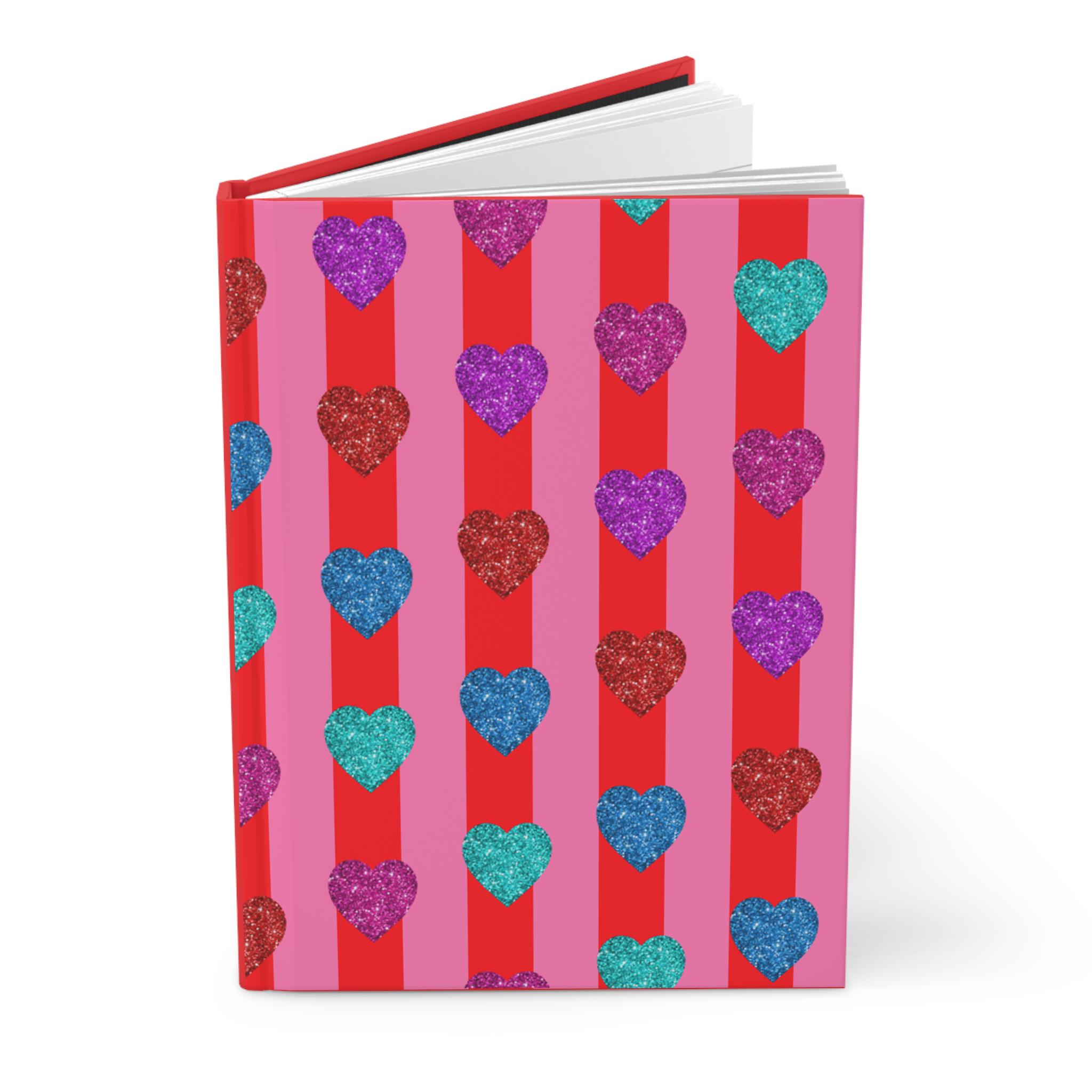 A colorful hearts design on a striped pink and red background adorns this hardcover journal, giving off a cheerful and vibrant vibe. Perfect for jotting down thoughts, doodles, or daily plans. Ideal for those who love to journal and stay organized. Great for Valentine's Day, birthdays, or just because gifting.