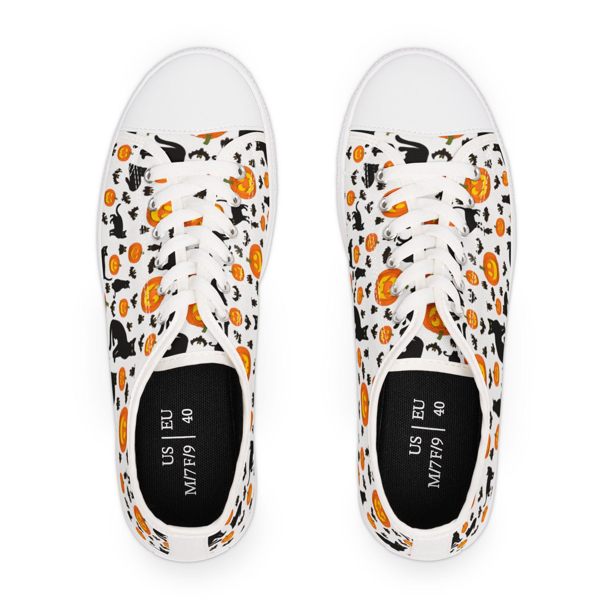 Made from breathable polyester canvas with PU leather accents, these sneakers are designed for durability and style. Inside, hi‑poly deodorant memory foam insoles and a shock-absorbing EVA layer keep every step cushioned, while the sturdy rubber outsole ensures long-lasting wear. Choose from black or white soles and laces, with silver metal eyelets for a polished finish. Lightweight, comfy, and full of Halloween charm—these shoes are ready to carry you through the season in style.