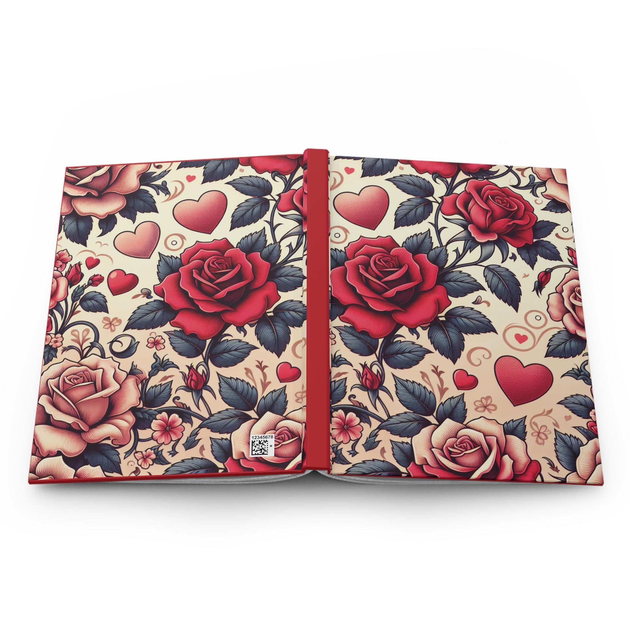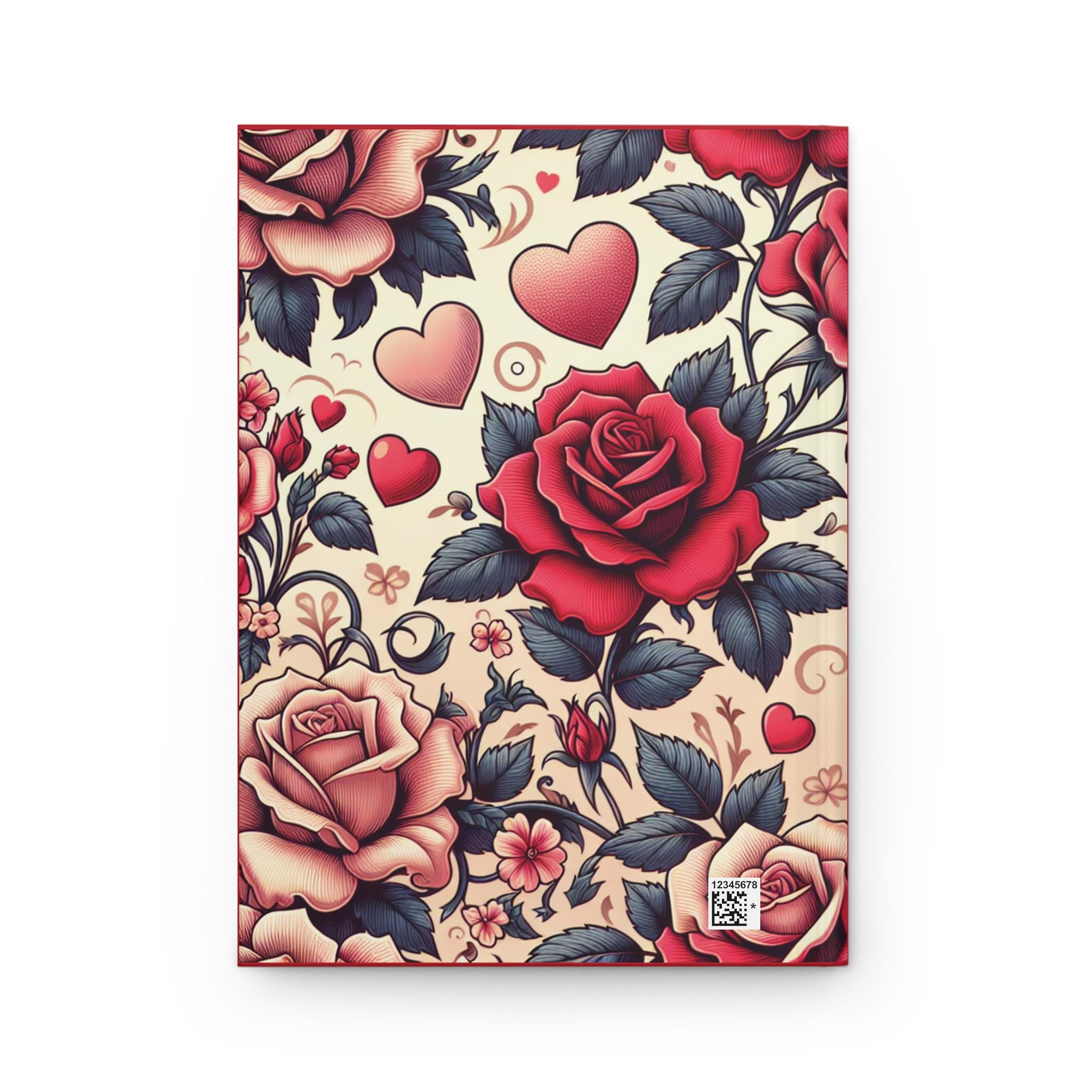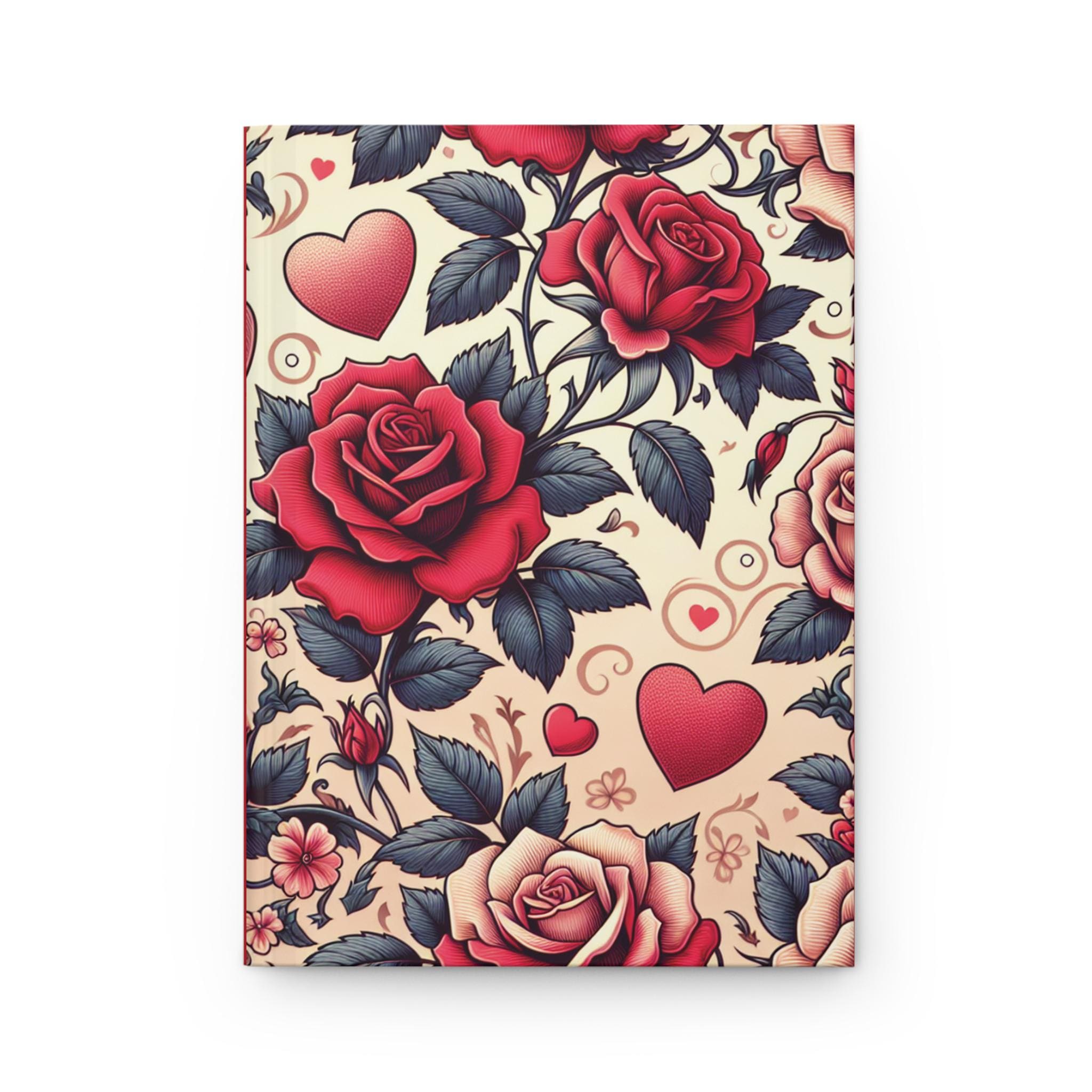 A matte hardcover journal featuring a design of hearts and roses, giving off a romantic and whimsical vibe. Perfect for journaling, note-taking, or sketching. Ideal for those who love to express themselves creatively. Great for Valentine's Day, anniversaries, or birthdays.