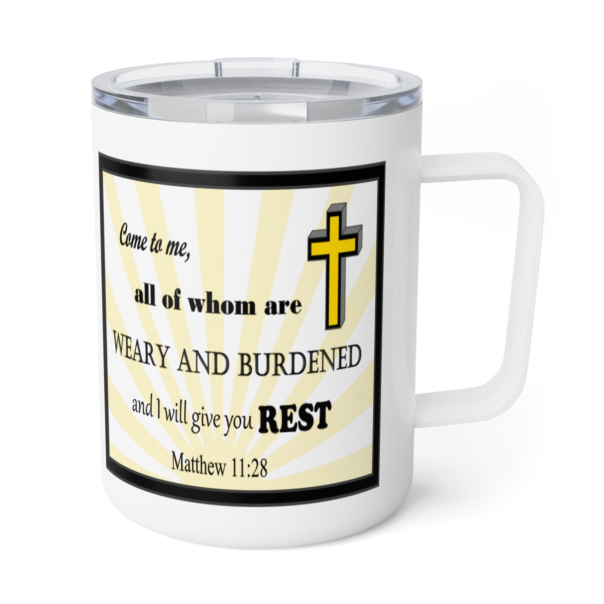 This comforting coffee mug features a bible verse with a cross graphic, creating a peaceful and serene vibe. Perfect for those seeking solace and inspiration while enjoying their favorite hot beverage. Ideal for religious individuals or as a thoughtful gift for Easter, Christmas, or other special occasions.