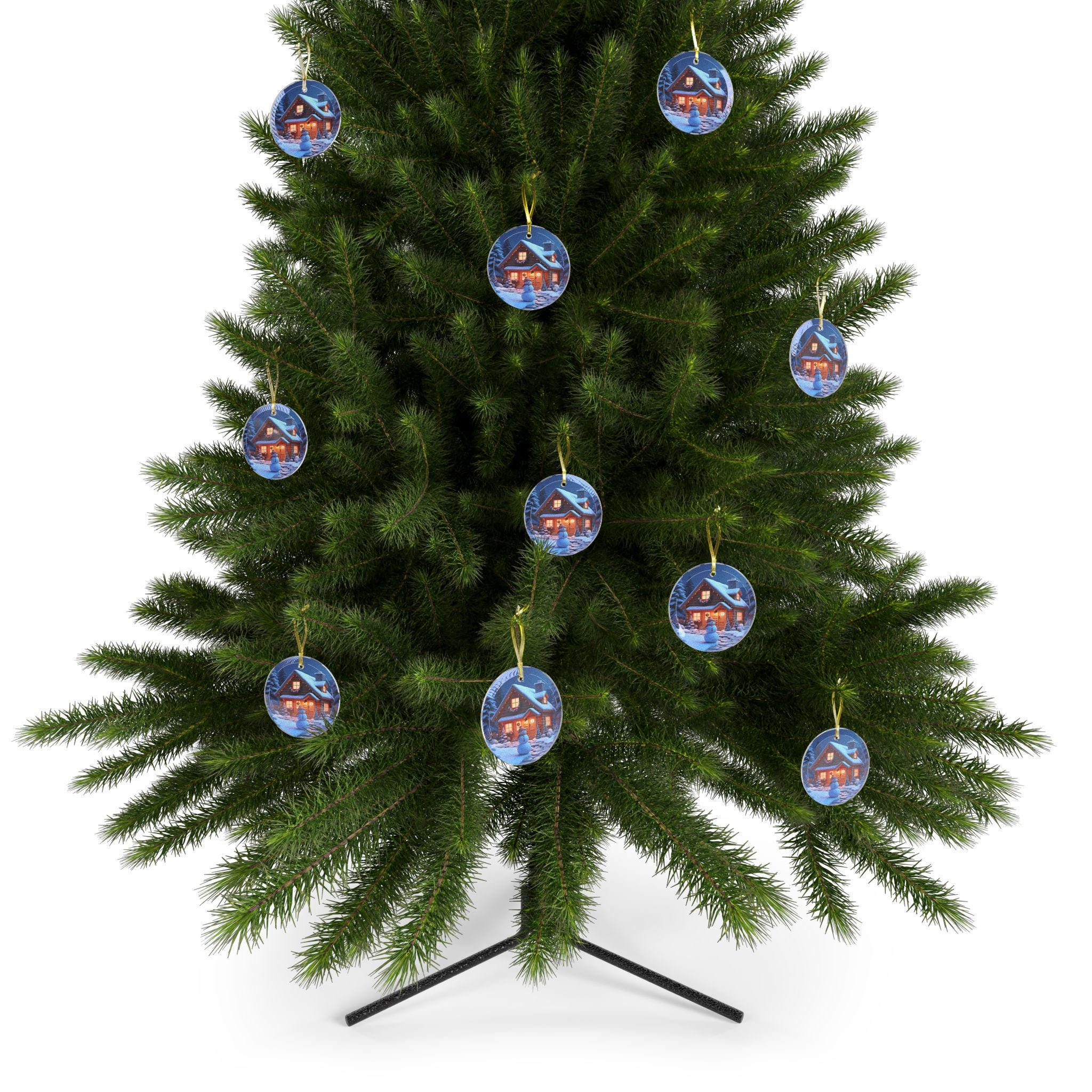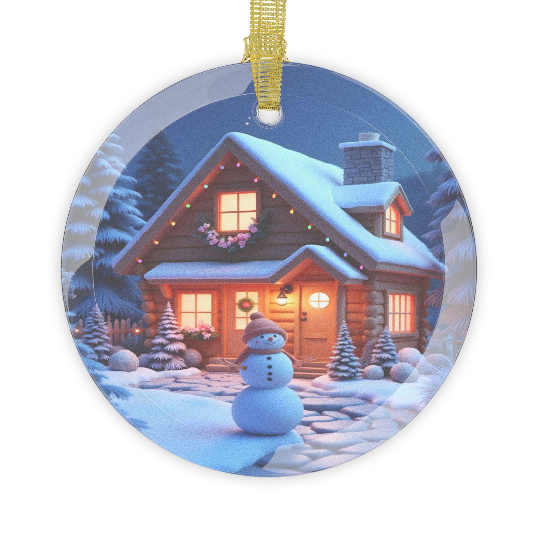 Capture the magic of Christmas with these glass ornaments featuring a Christmas cottage in the woods, complete with Christmas lights and a snowman. Perfect for adding a festive touch to your holiday decor. Ideal for Christmas enthusiasts and collectors. Relevant for Christmas, holiday celebrations, and winter decor.