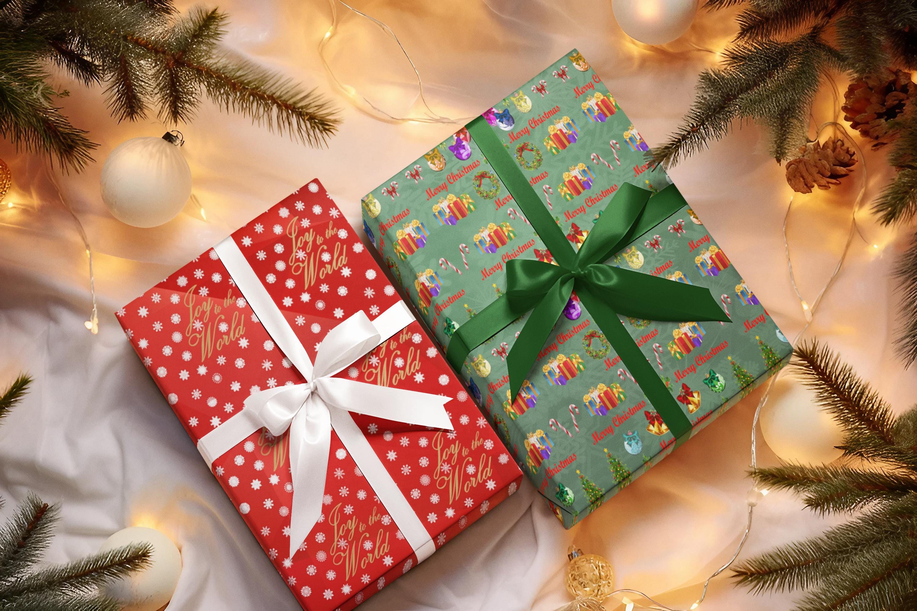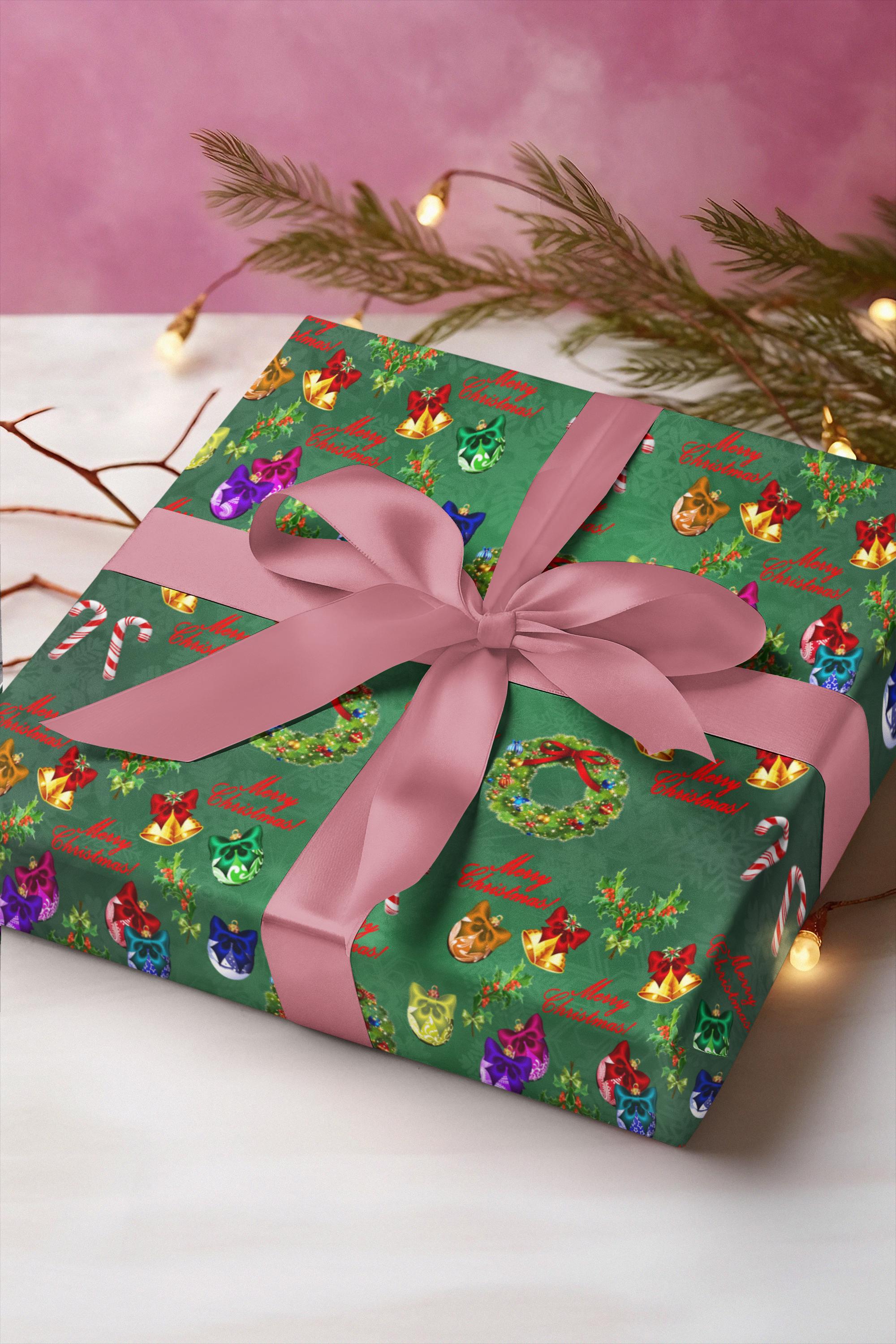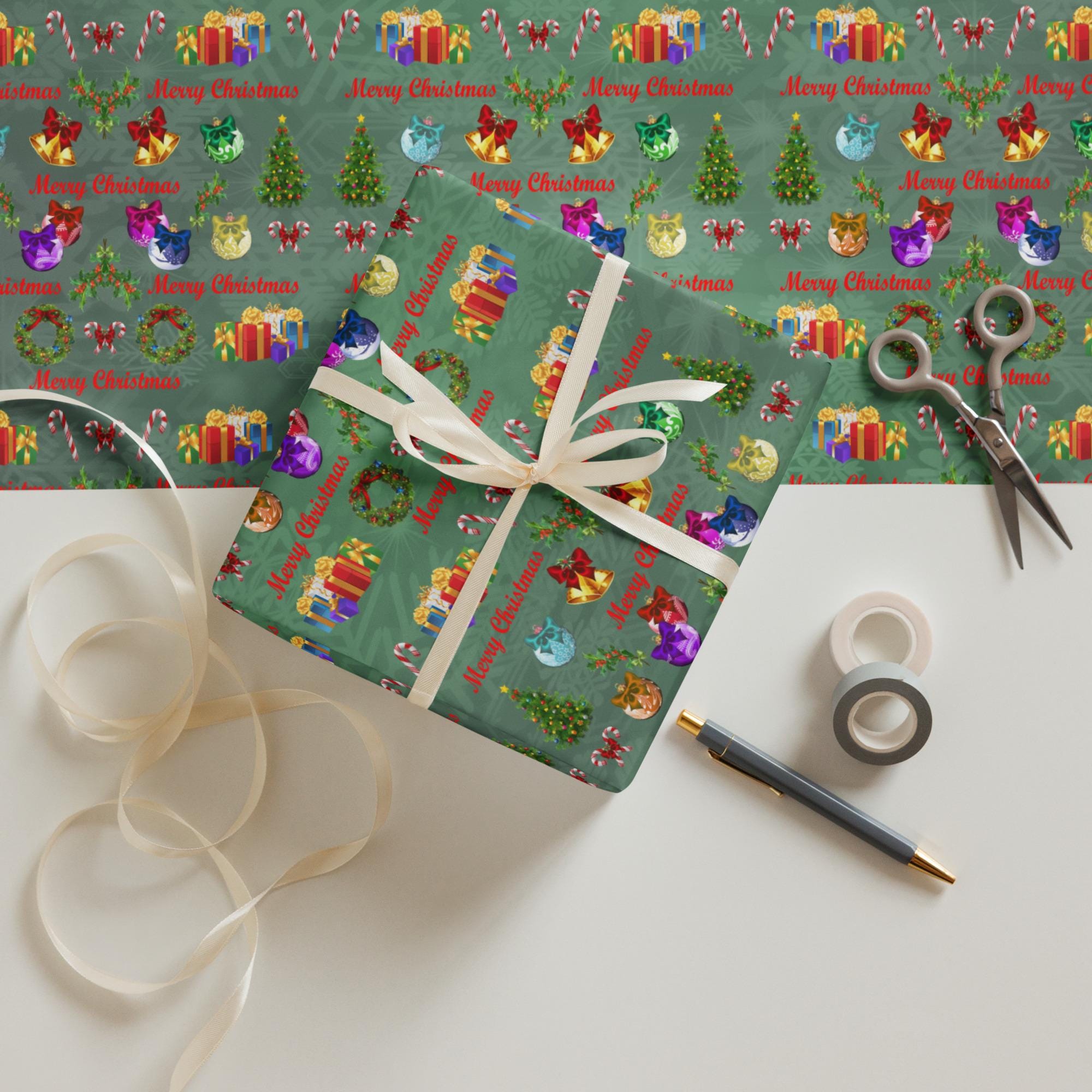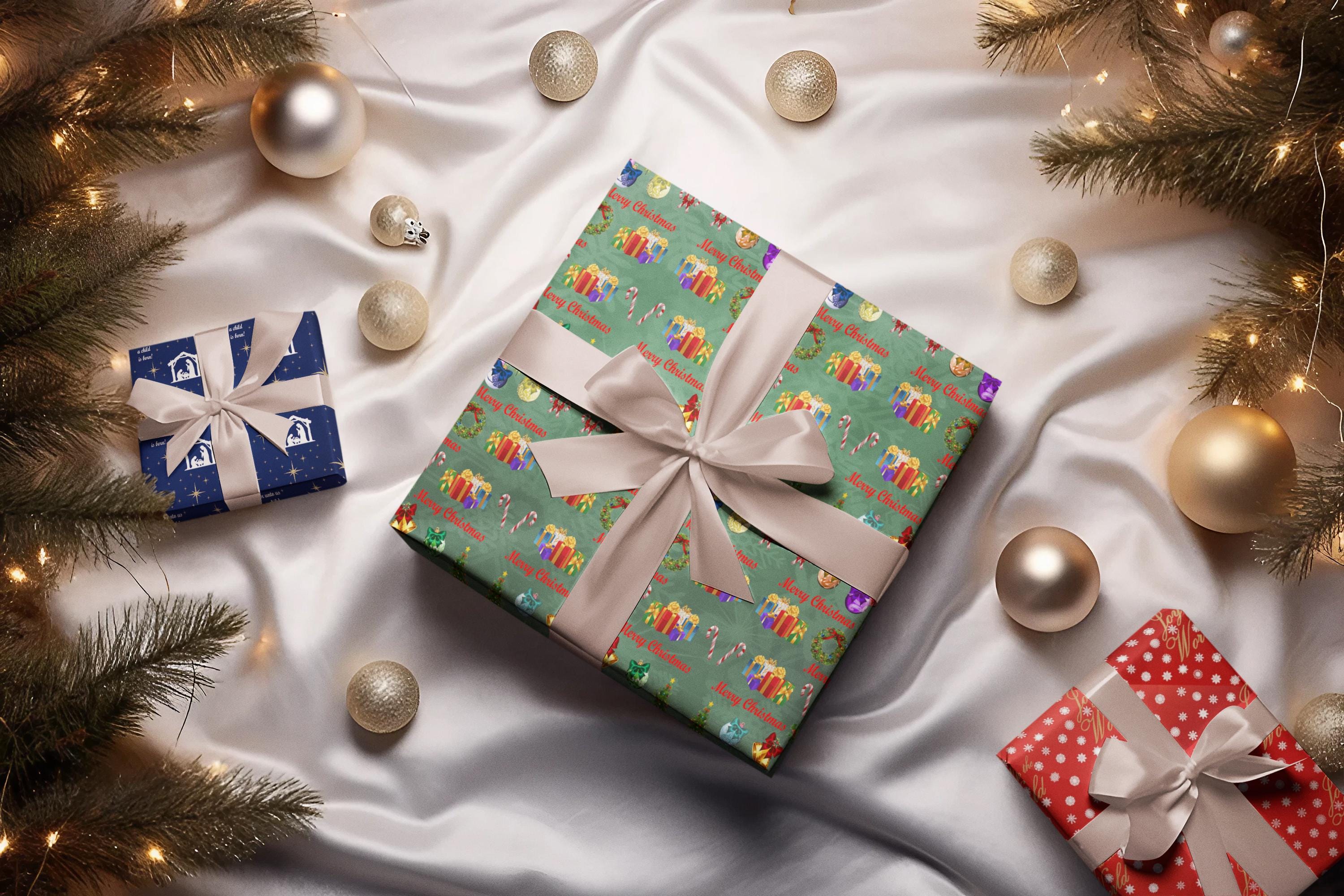 Also included is our colorful Christmas wrapping paper featuring a cheerful "Merry Christmas" design! This vibrant green paper design adds a festive touch to any present, making it perfect for spreading holiday cheer.