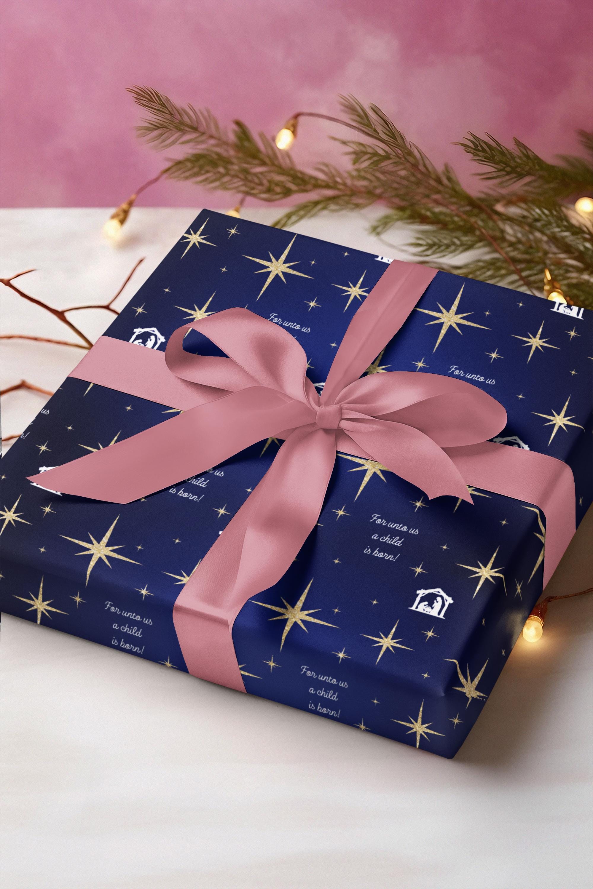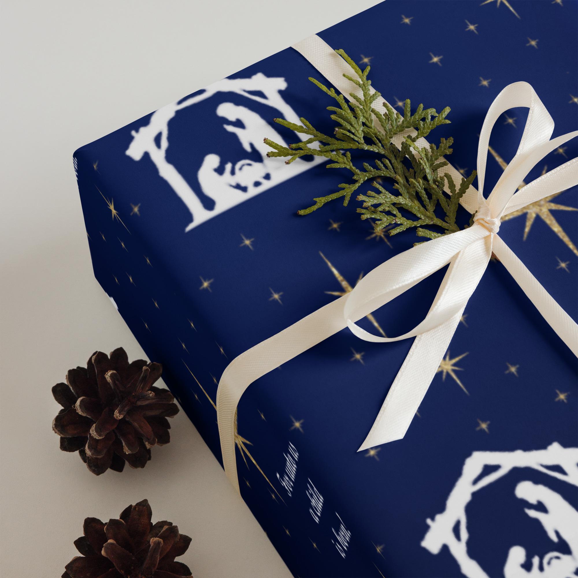 The set includes our beautiful "Nativity". This nativity-themed gift wrap features a stunning navy blue design that celebrates the true meaning of Christmas, and the famous bible verse about about the birth of Jesus.