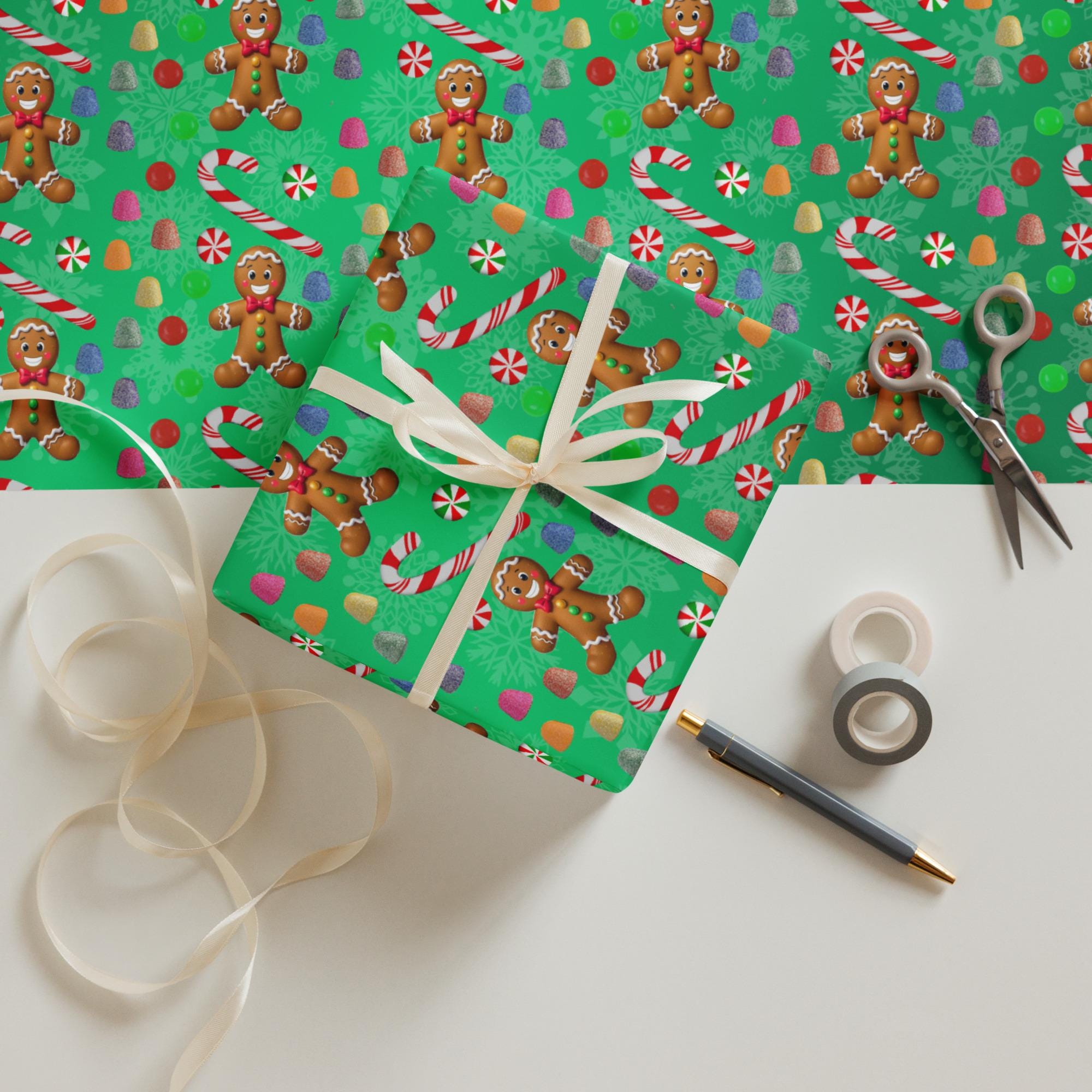 The set includes our whimsical "Gingerbread Man". Transform your gift wrapping into a Christmas candyland with our Gingerbread Man wrapping paper! This charming design showcases an adorable Gingerbread Man surrounded by yummy Christmas goodies.