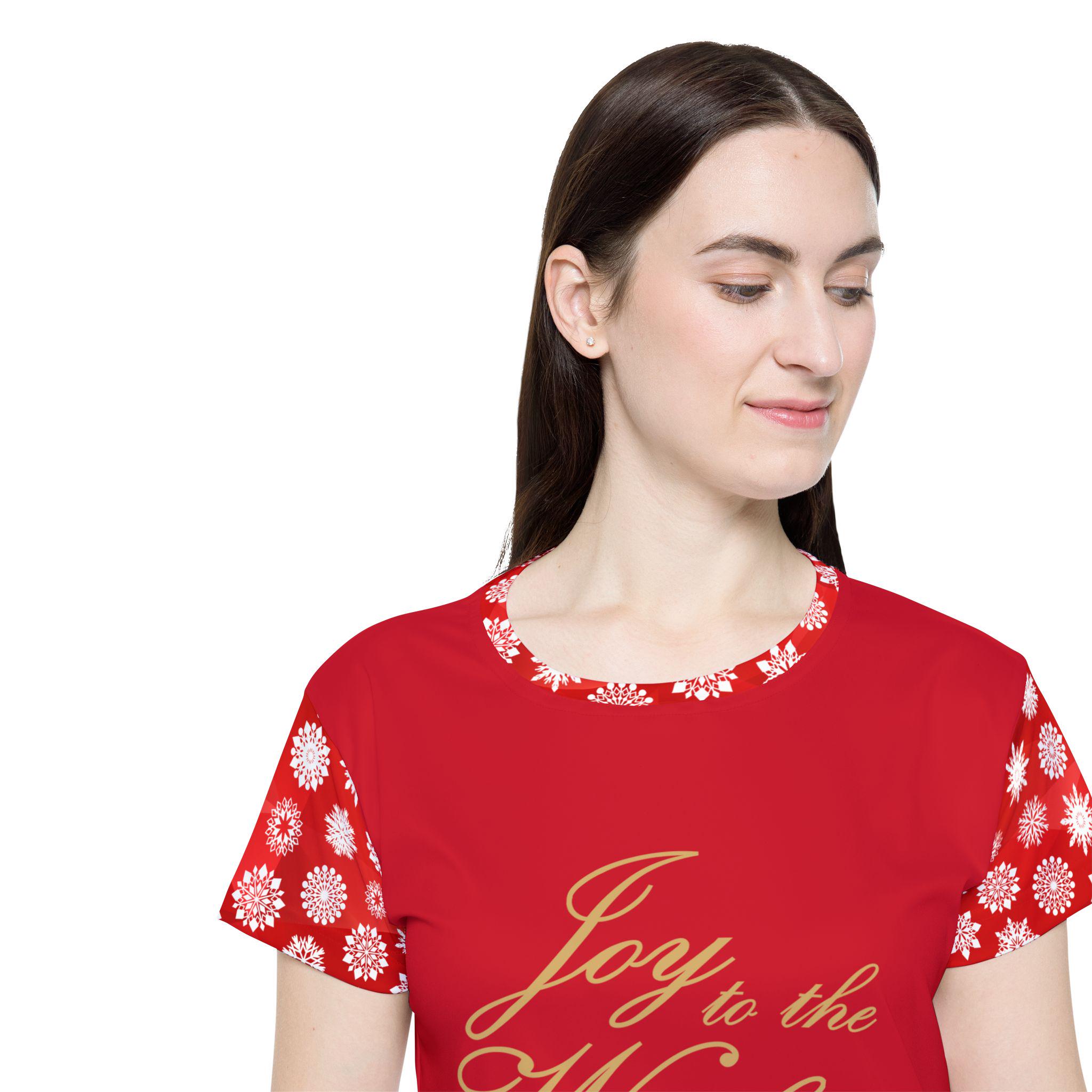 A Women's Sports Jersey featuring the quote 'Joy to the World' in elegant gold on a red background with snowflakes on the sleeves. This jersey exudes holiday cheer and is perfect for the festive season. Ideal for women who love sports and want to add a touch of Christmas spirit to their activewear.