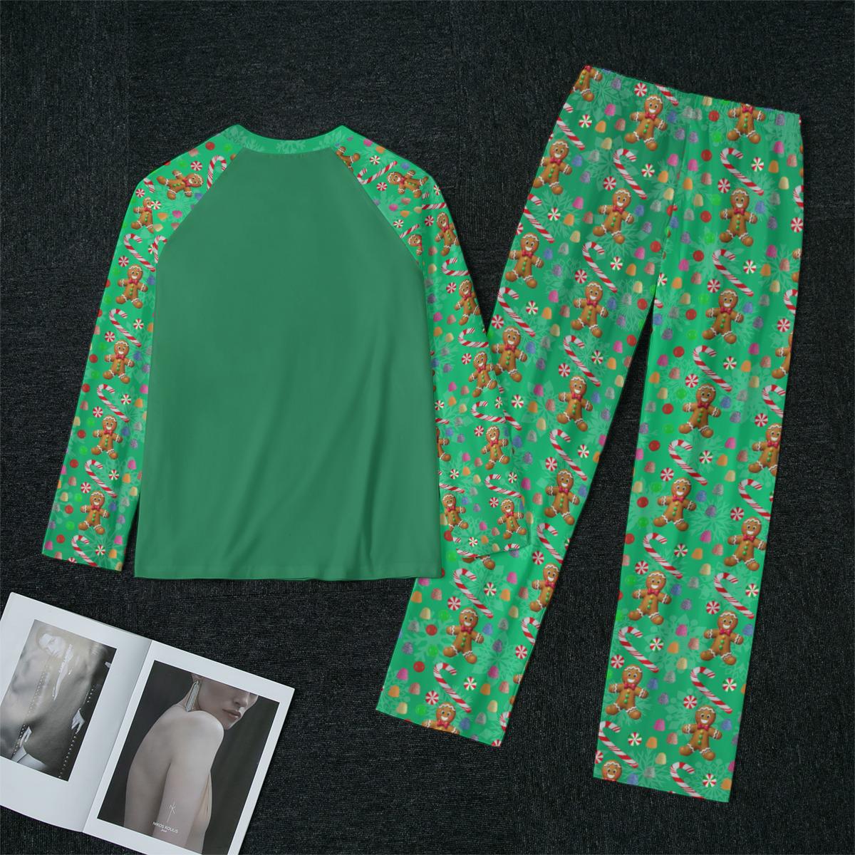 Stay cozy this holiday season with this adorable set of pajamas featuring a charming gingerbread man surrounded by Christmas candy on a festive green background. Perfect for lounging or sleeping, this set is sure to bring some extra cheer to your winter nights. Get into the holiday spirit with these comfy pajamas! Pair it up with other sizes for the whole family!