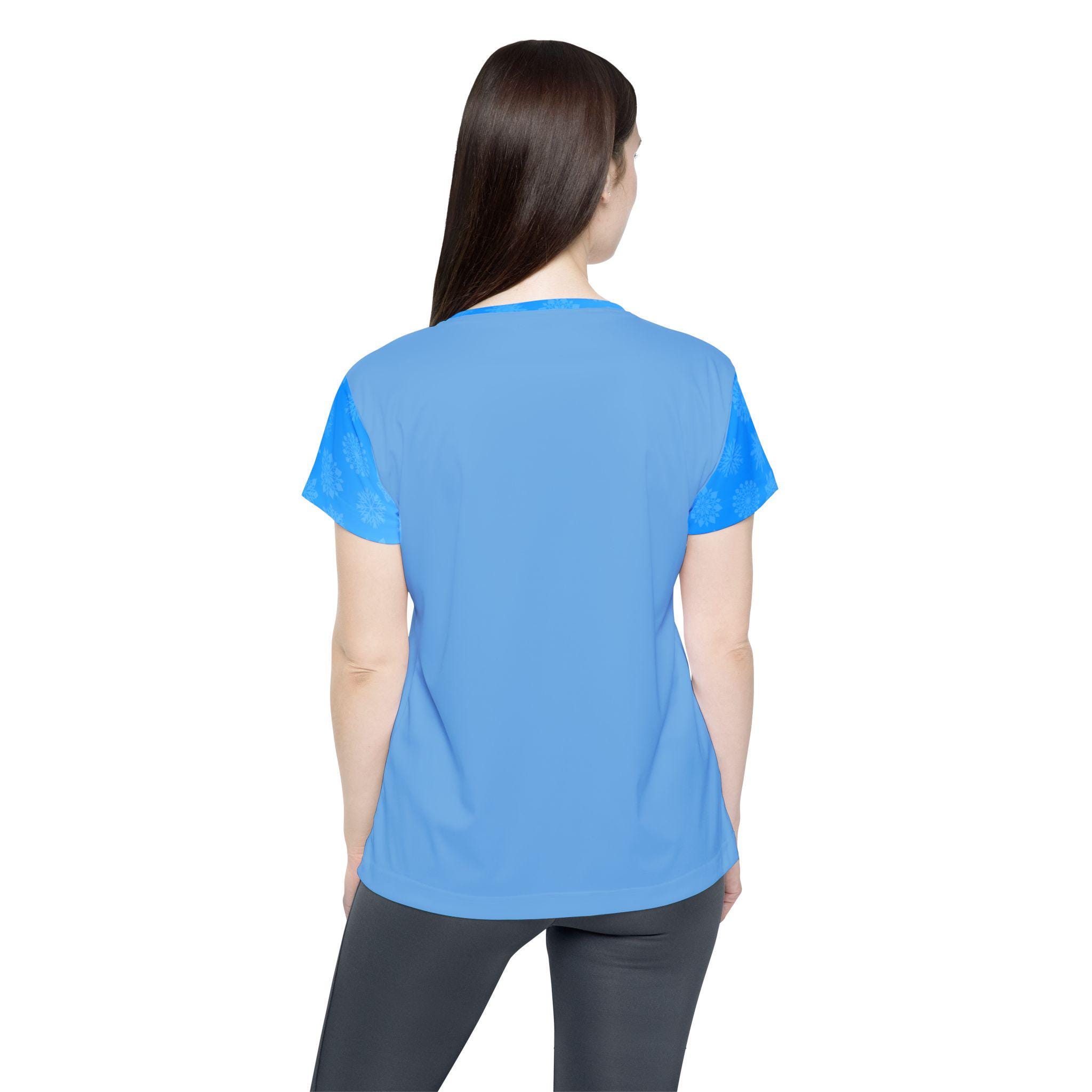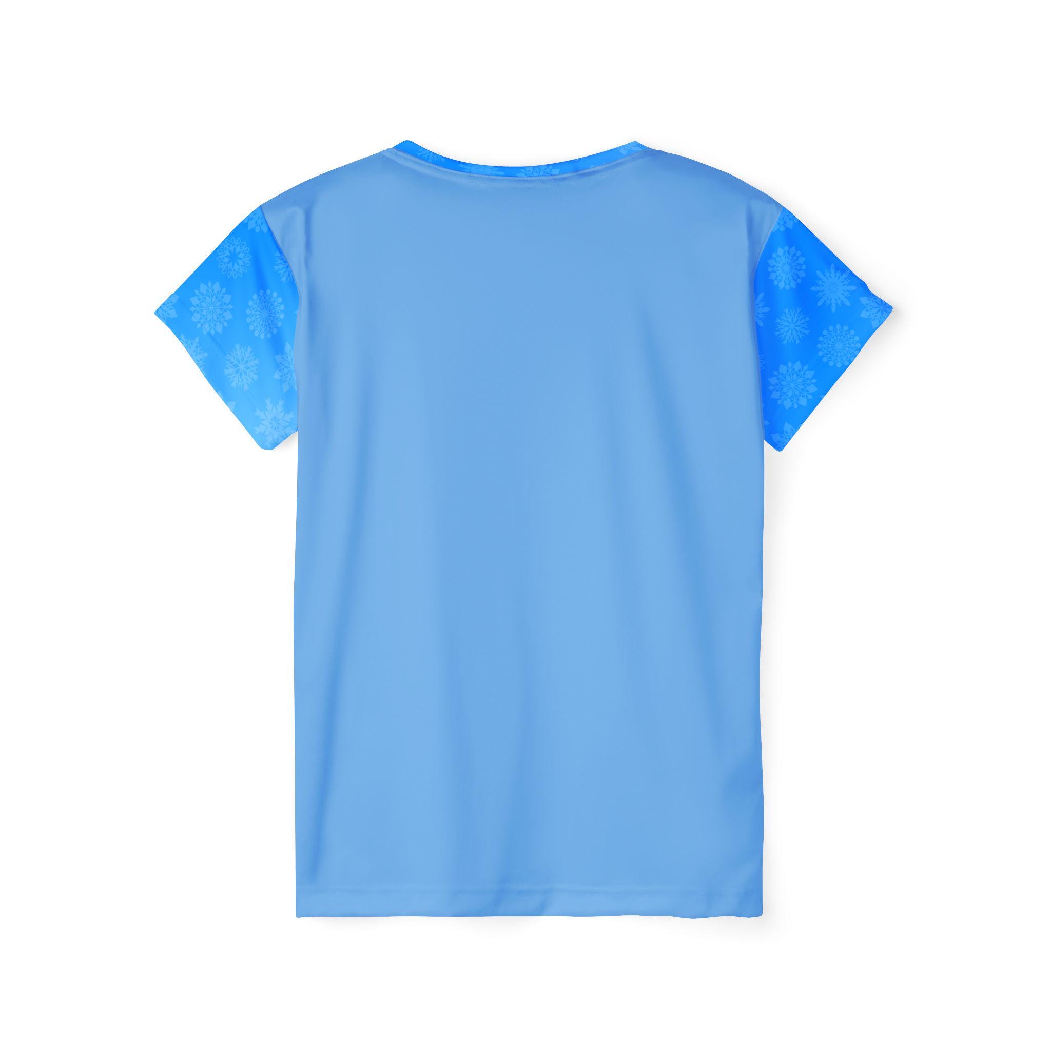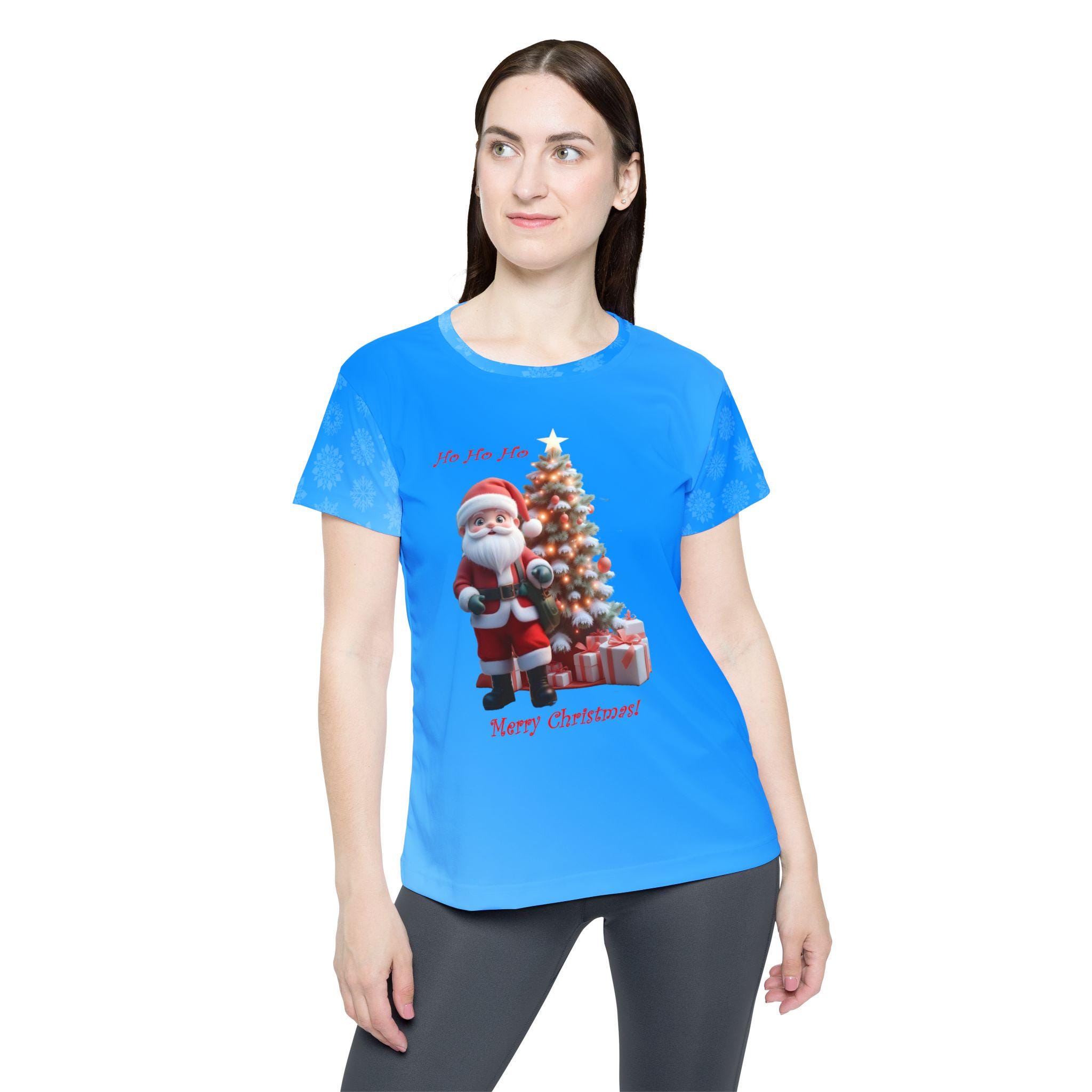 A women's sports jersey featuring a festive design of santa claus on a blue background. This jersey is perfect for the holiday season and for those who love to stay active. It is made of 100% moisture-wicking polyester, ensuring comfort and breathability during physical activities.
