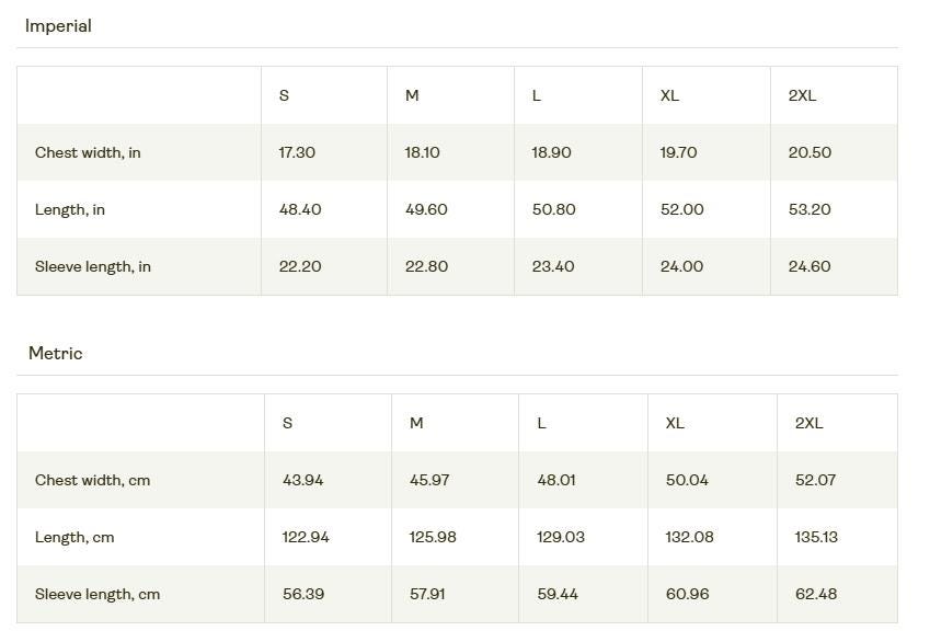 S...48.40 M...49.60 L...50.80 XL...52.00 2XL...53.20