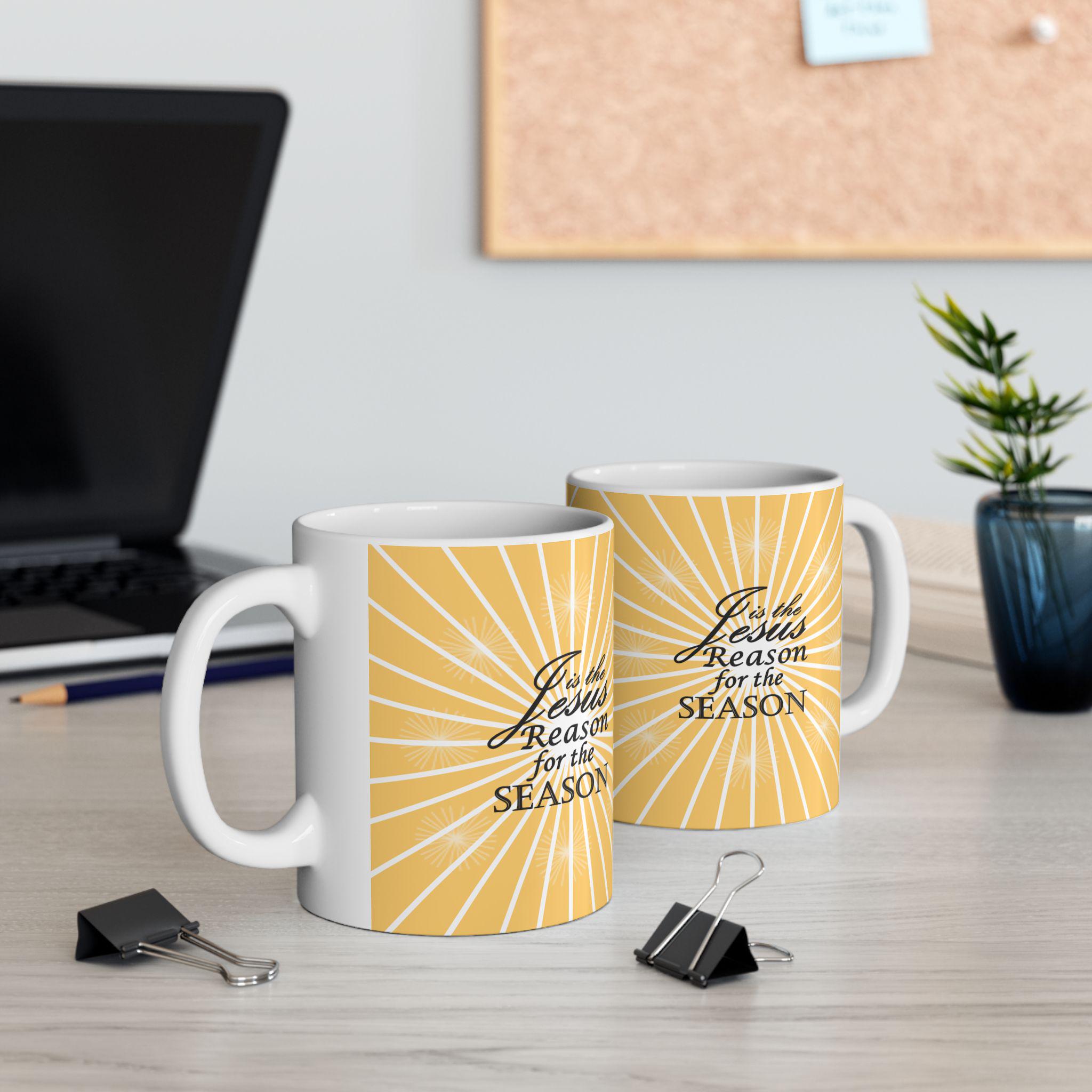A festive ceramic mug featuring a Christmas quote 'Jesus is the Reason for the Season' with light bursting behind it. Perfect for adding a touch of holiday spirit to your morning coffee or tea routine. Ideal for those who celebrate Christmas and want to embrace the true meaning of the season.