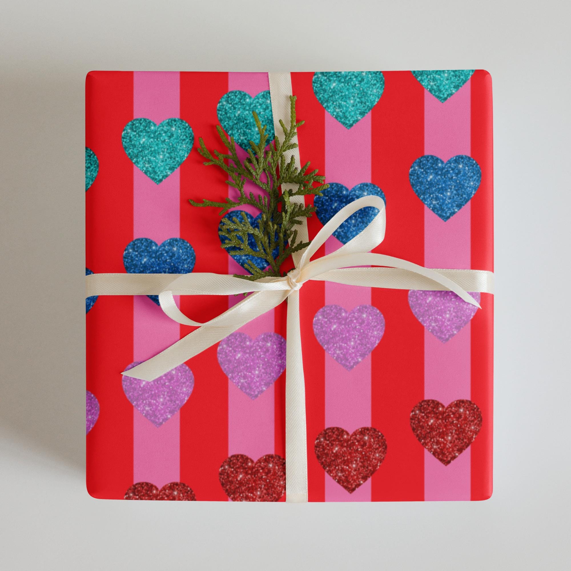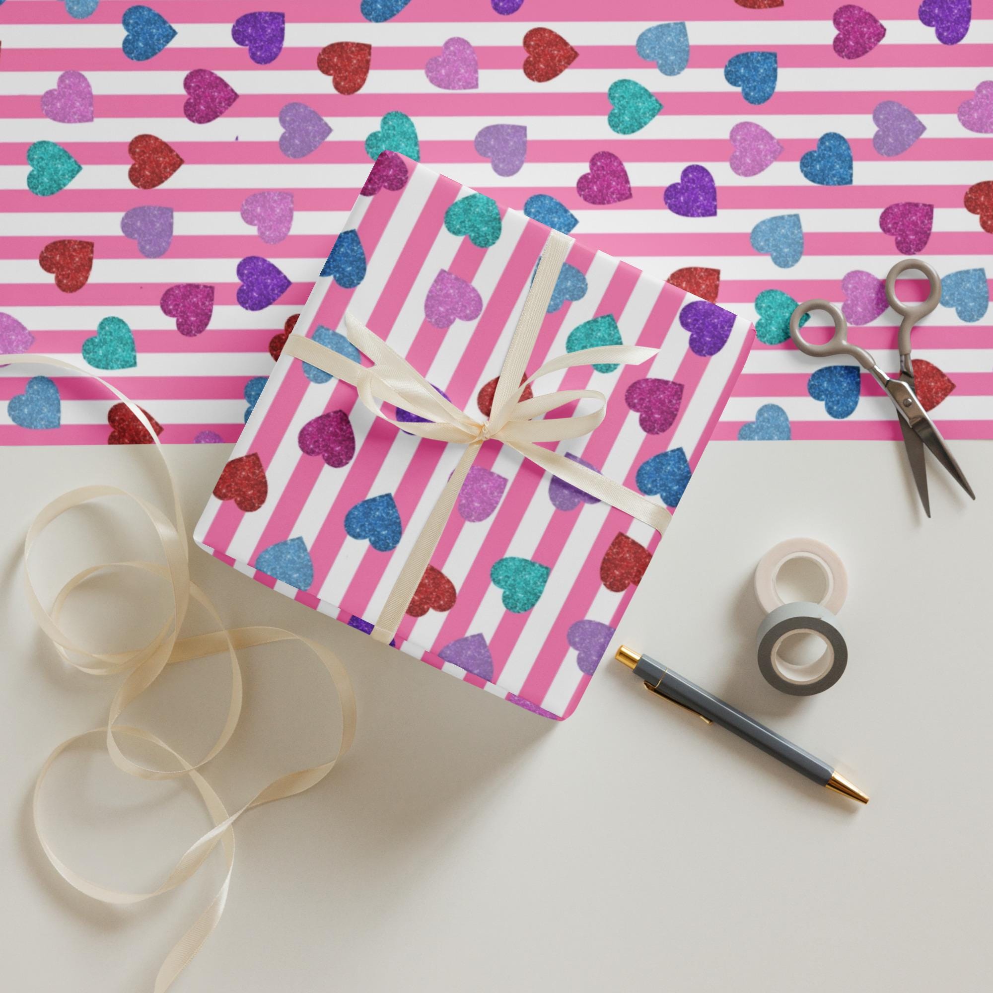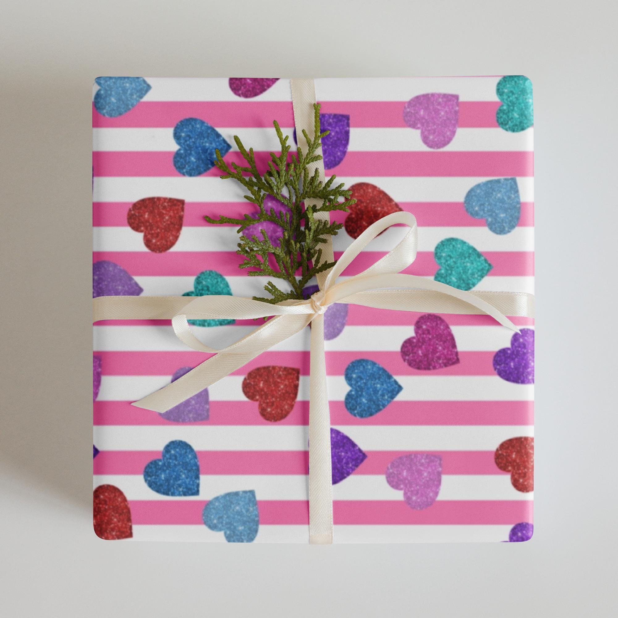 Heart Confetti: Colorful hearts on a charming striped pink and white backdrop. Perfect for adding a pop of romance to your gifts!