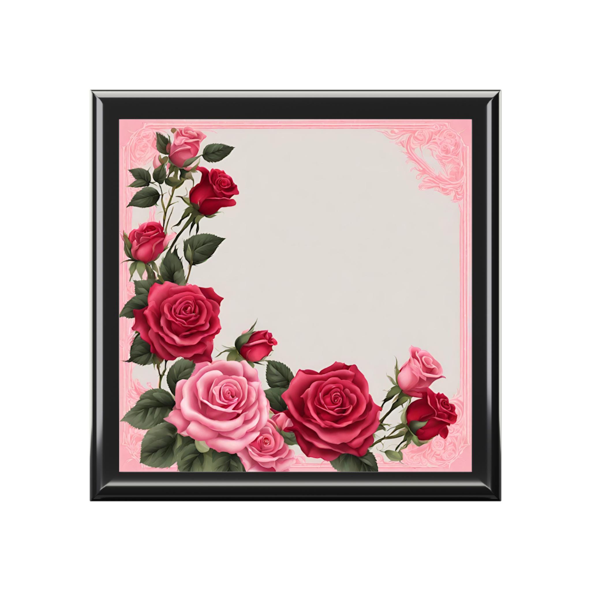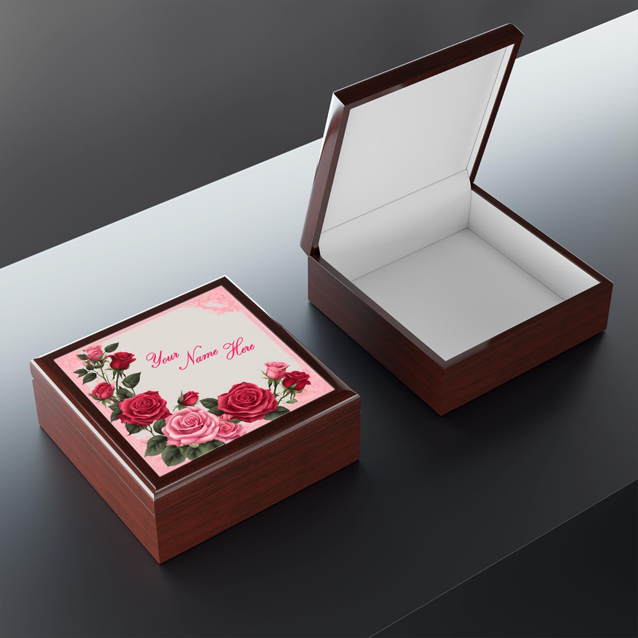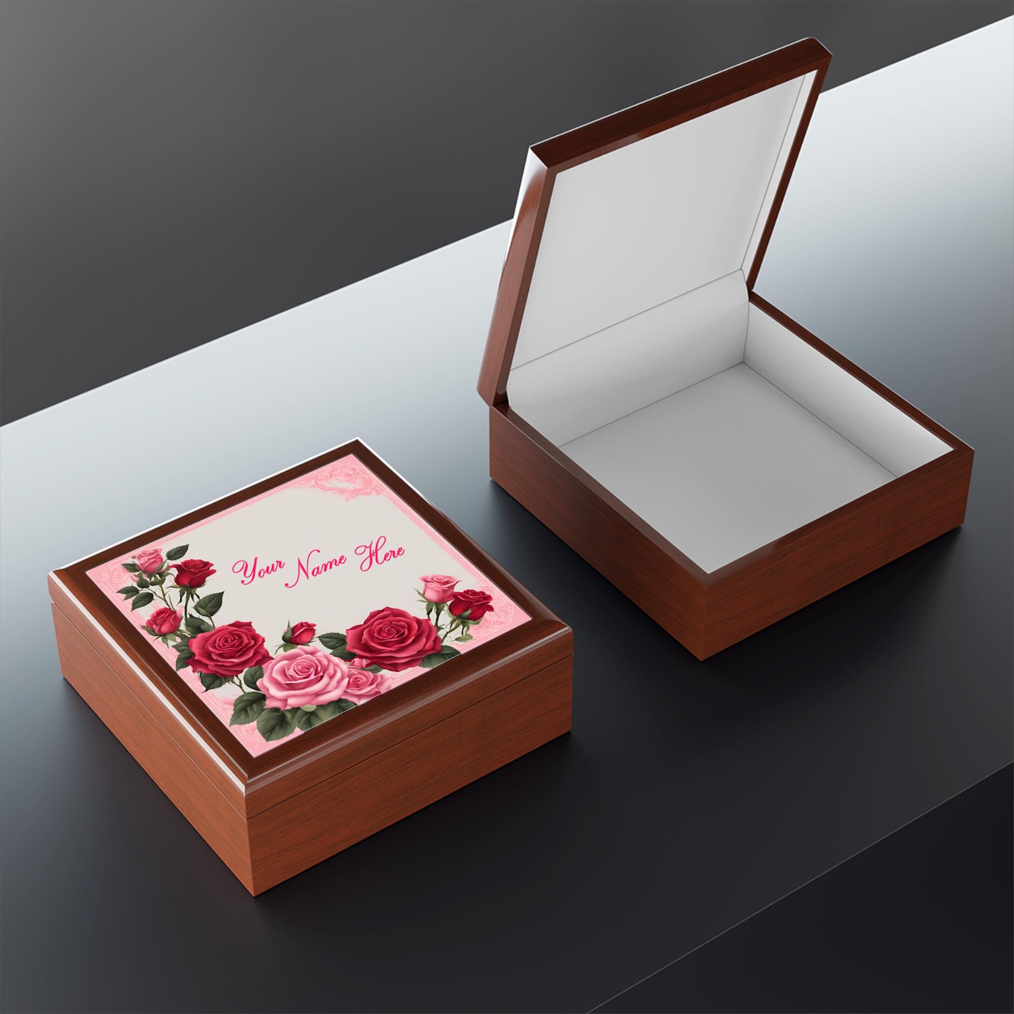 Introducing a beautifully crafted Jewelry Box that serves as a perfect blend of elegance and functionality, personalized with your name. Made from high-quality rubberwood with a glossy finish, this Jewelry Box is not only a stylish storage solution but also a decorative piece for any space. With its soft felt interior lining, it will keep your precious items safe and scratch-free. The charming floral design on the lid, featuring vibrant roses, adds a romantic touch, making it an ideal gift for loved ones. Perfect for special occasions like anniversaries, weddings, or Mother’s Day, this Jewelry Box is a thoughtful present for anyone who cherishes beautiful jewelry and keepsakes. Add a touch of sophistication to your vanity or gift it to a friend, making memories last forever with every piece you store.