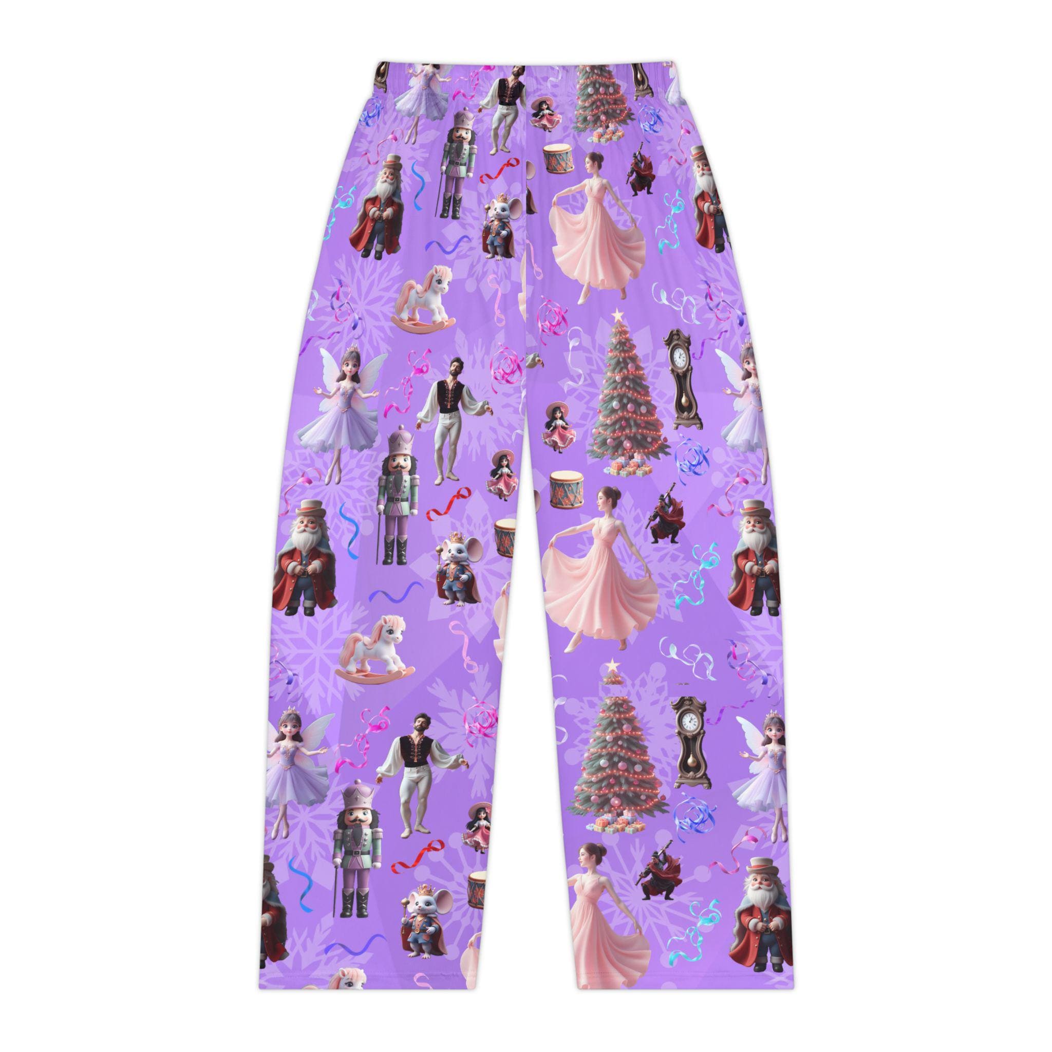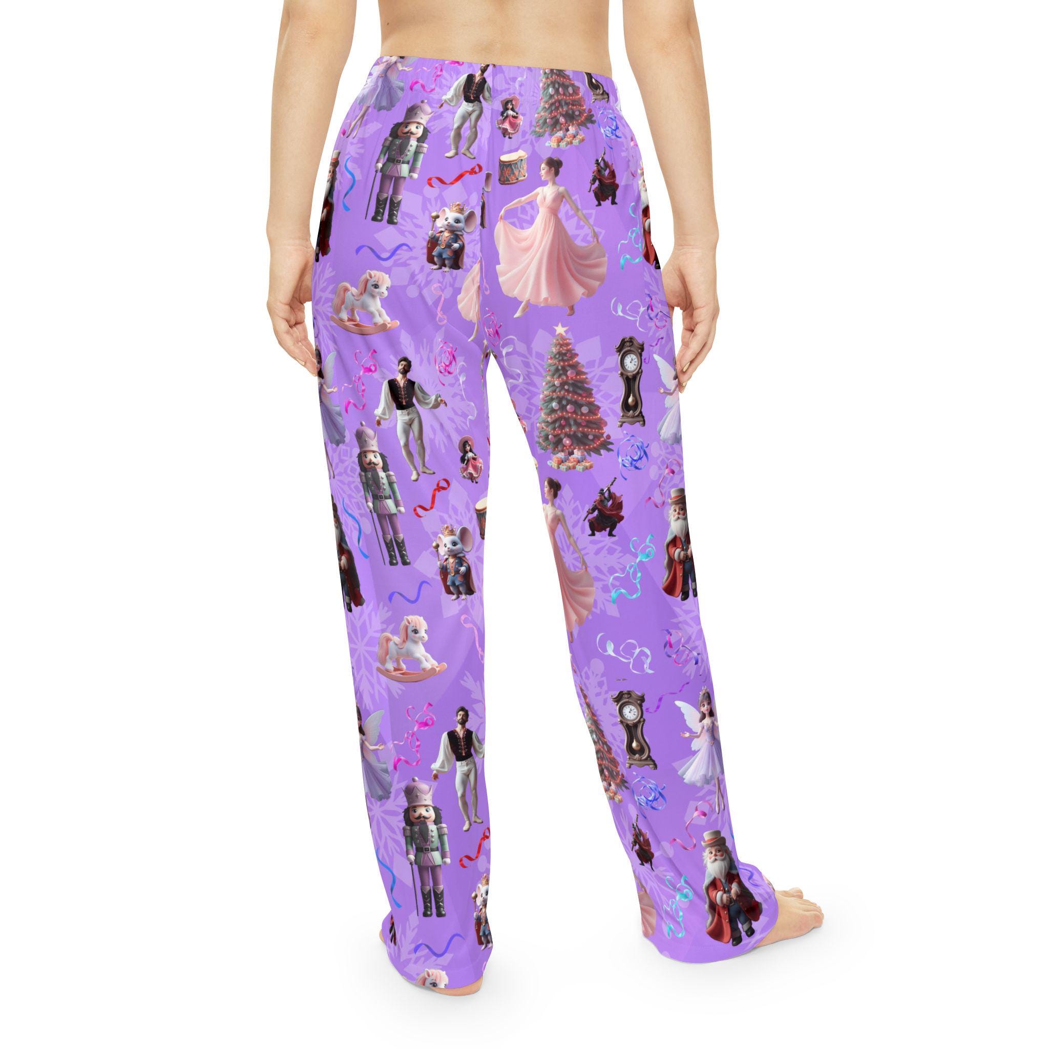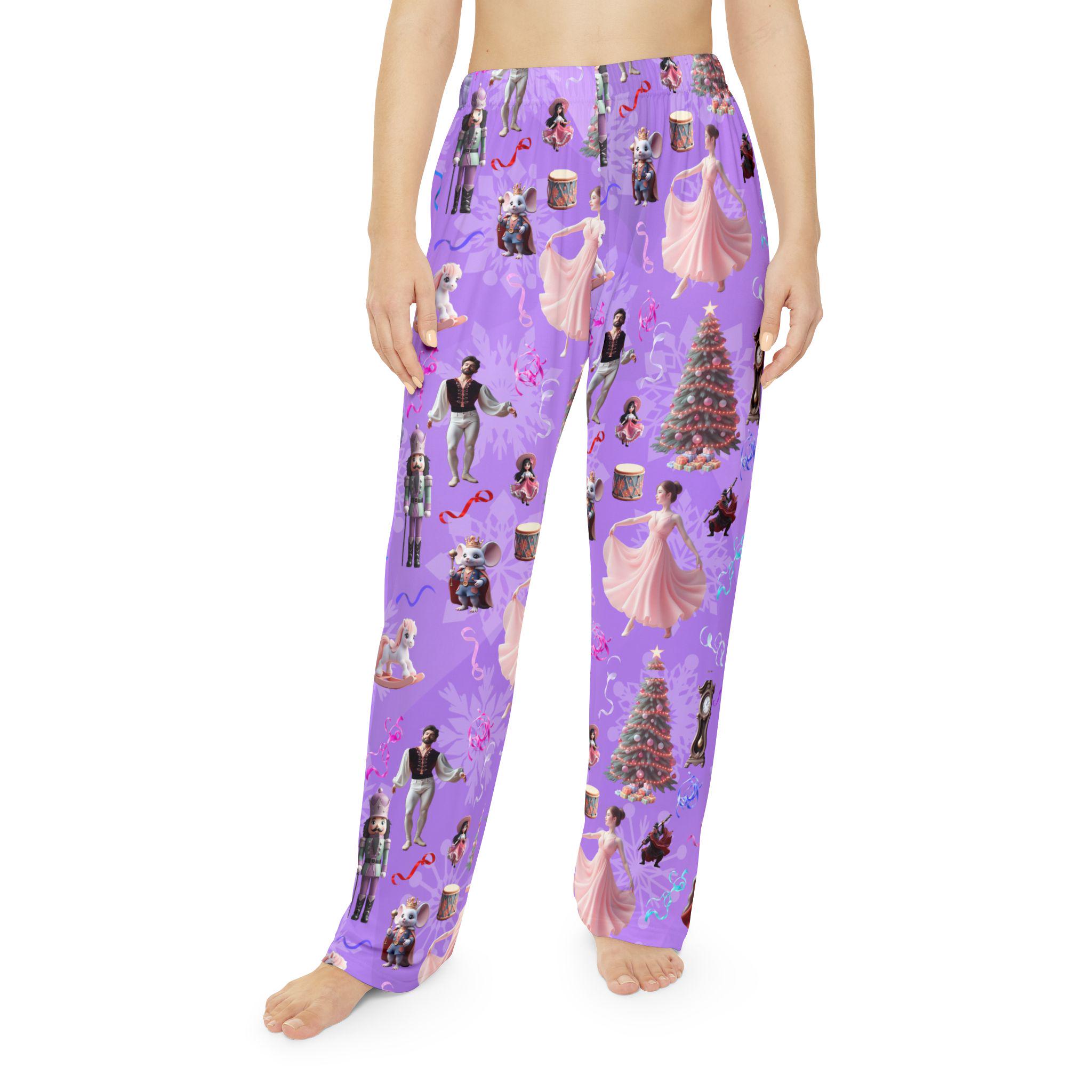Cozy Women's Pajama Pants featuring Nutcracker Suite characters and props on a purple gradient background. Perfect for the holiday season or fans of the classic ballet. Made of 100% brushed polyester for a soft feel and durable quality. Elastic waistband for comfort and convenience.