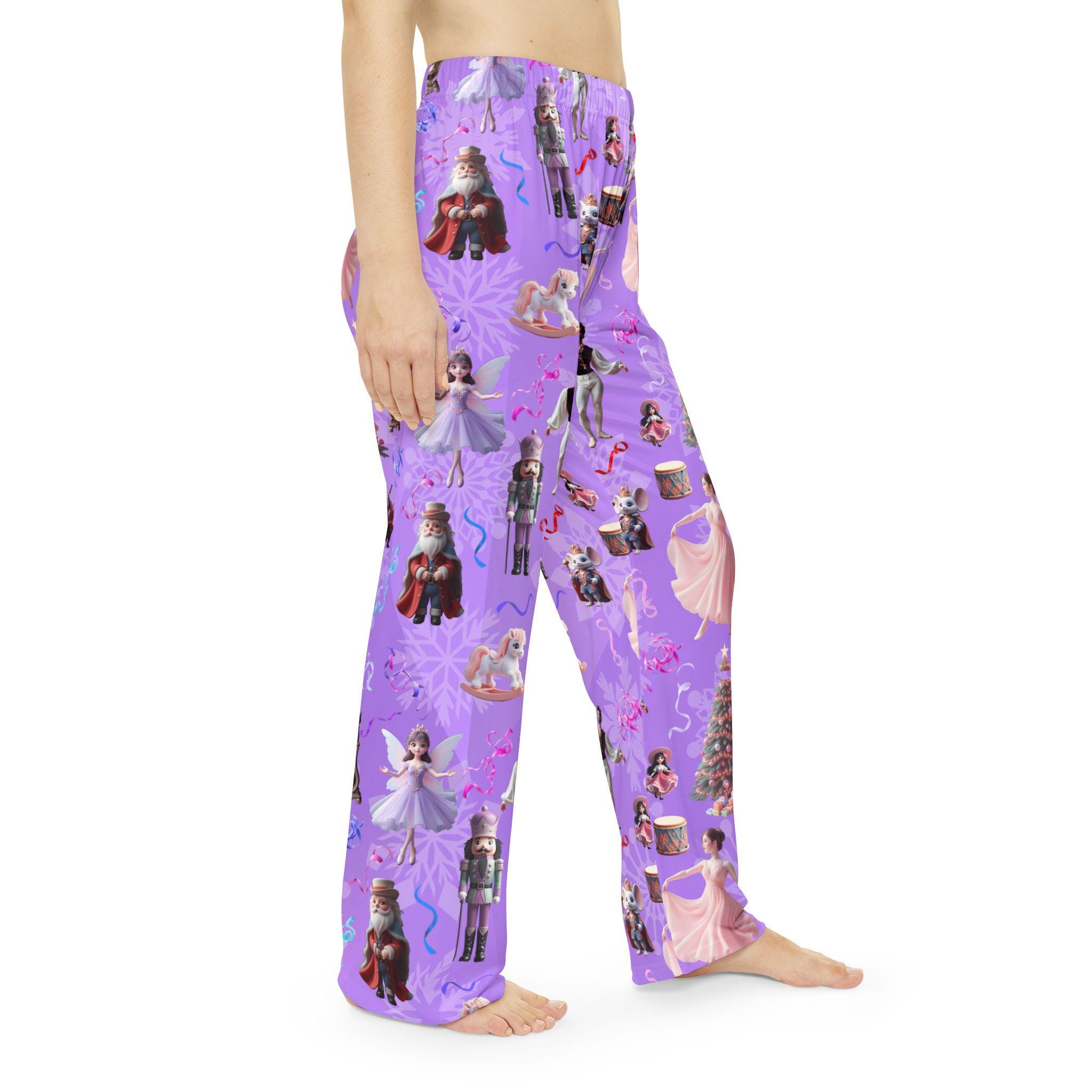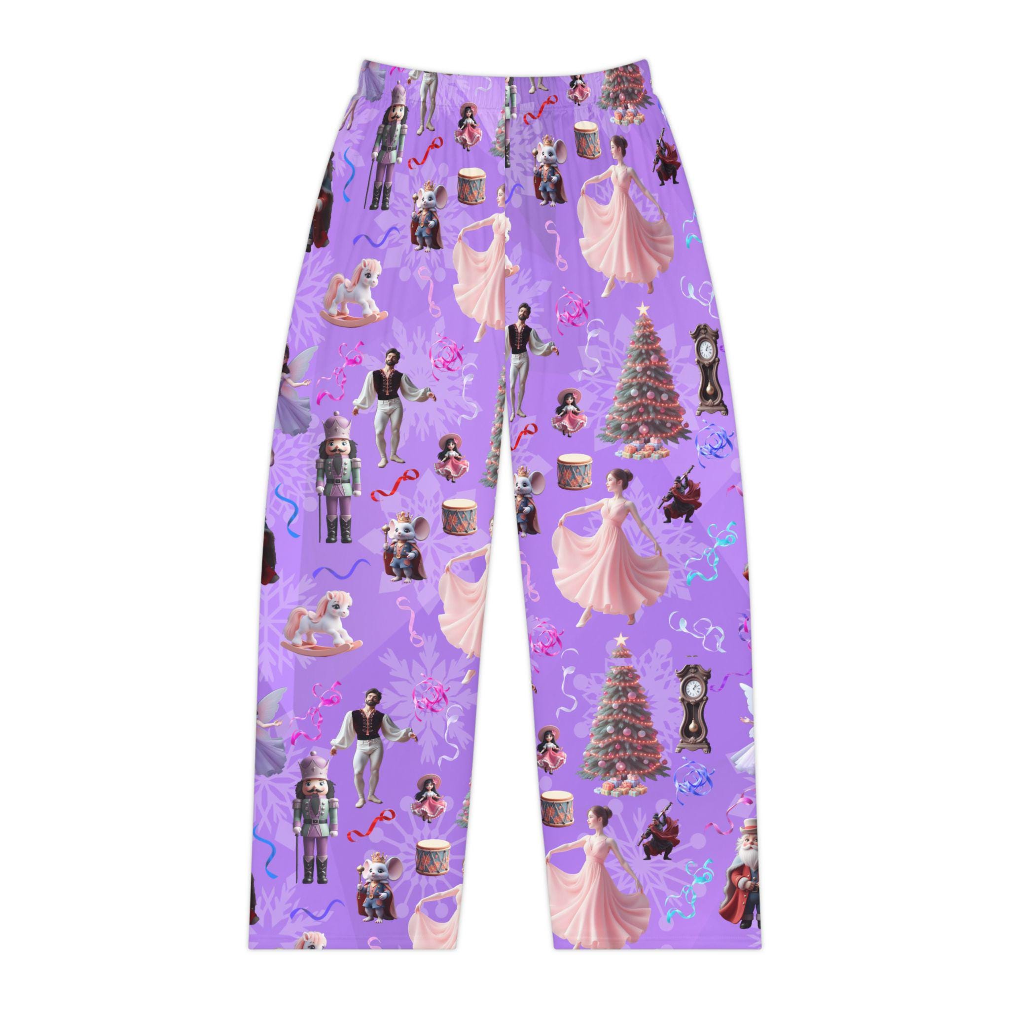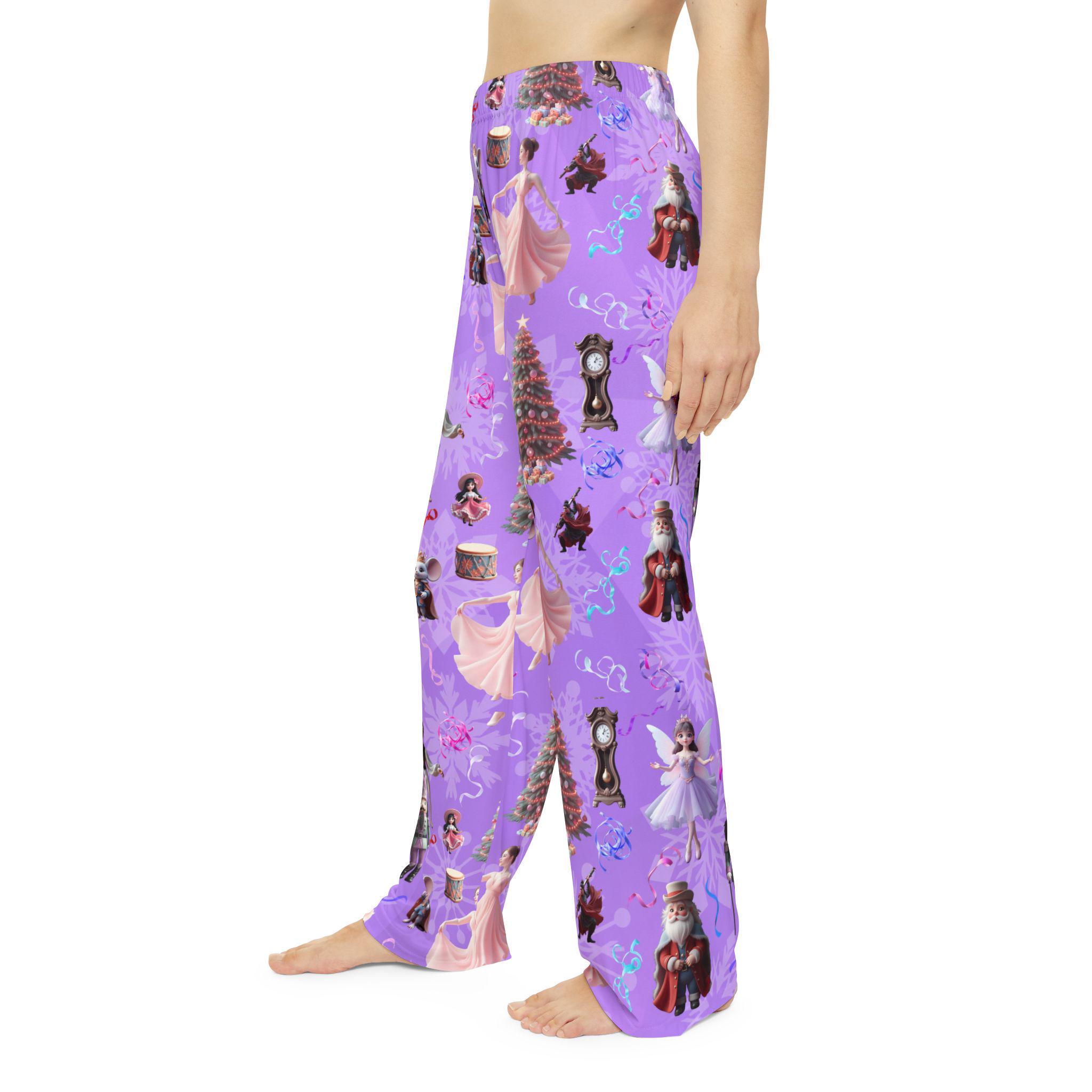 Cozy Women's Pajama Pants featuring Nutcracker Suite characters and props on a purple gradient background. Perfect for the holiday season or fans of the classic ballet. Made of 100% brushed polyester for a soft feel and durable quality. Elastic waistband for comfort and convenience.