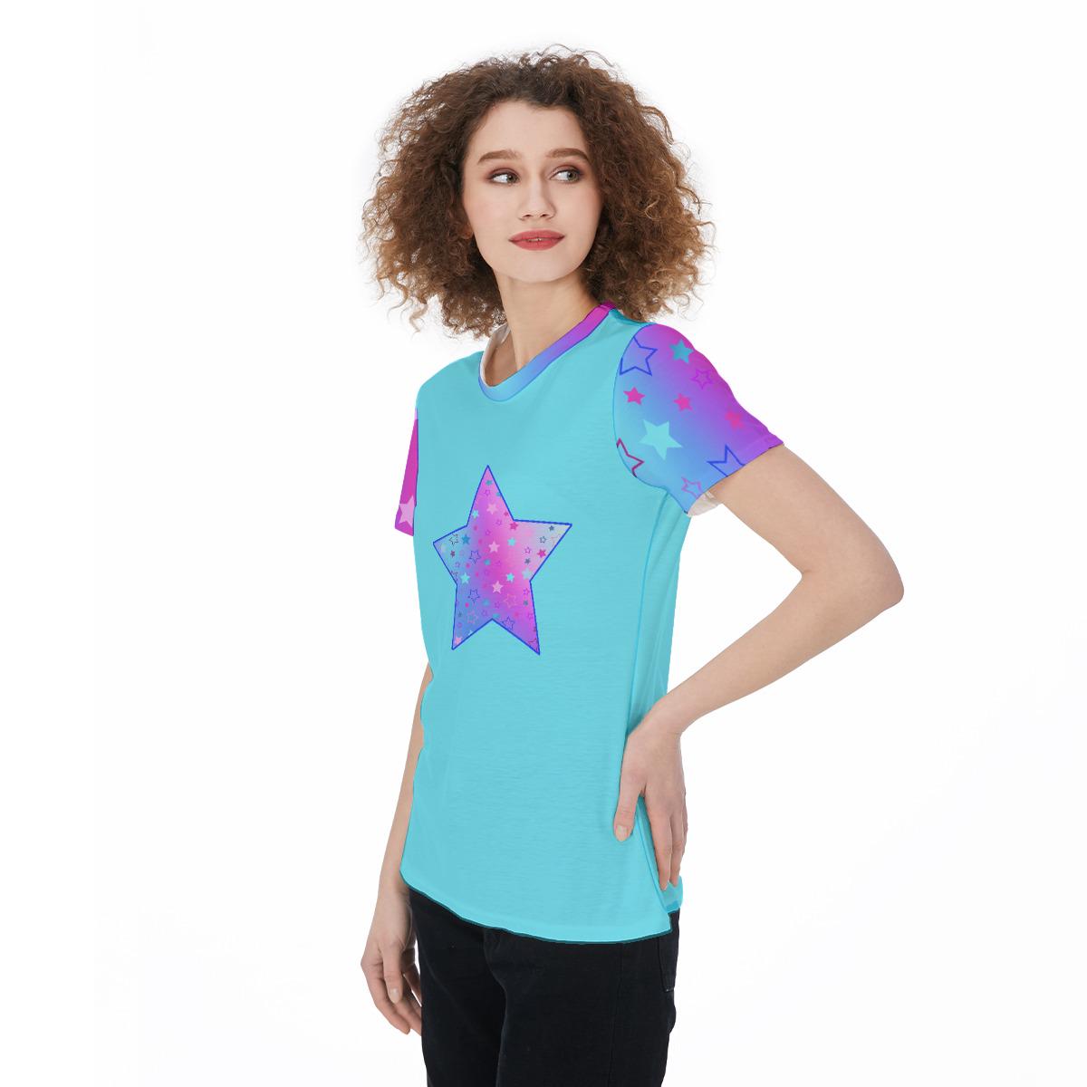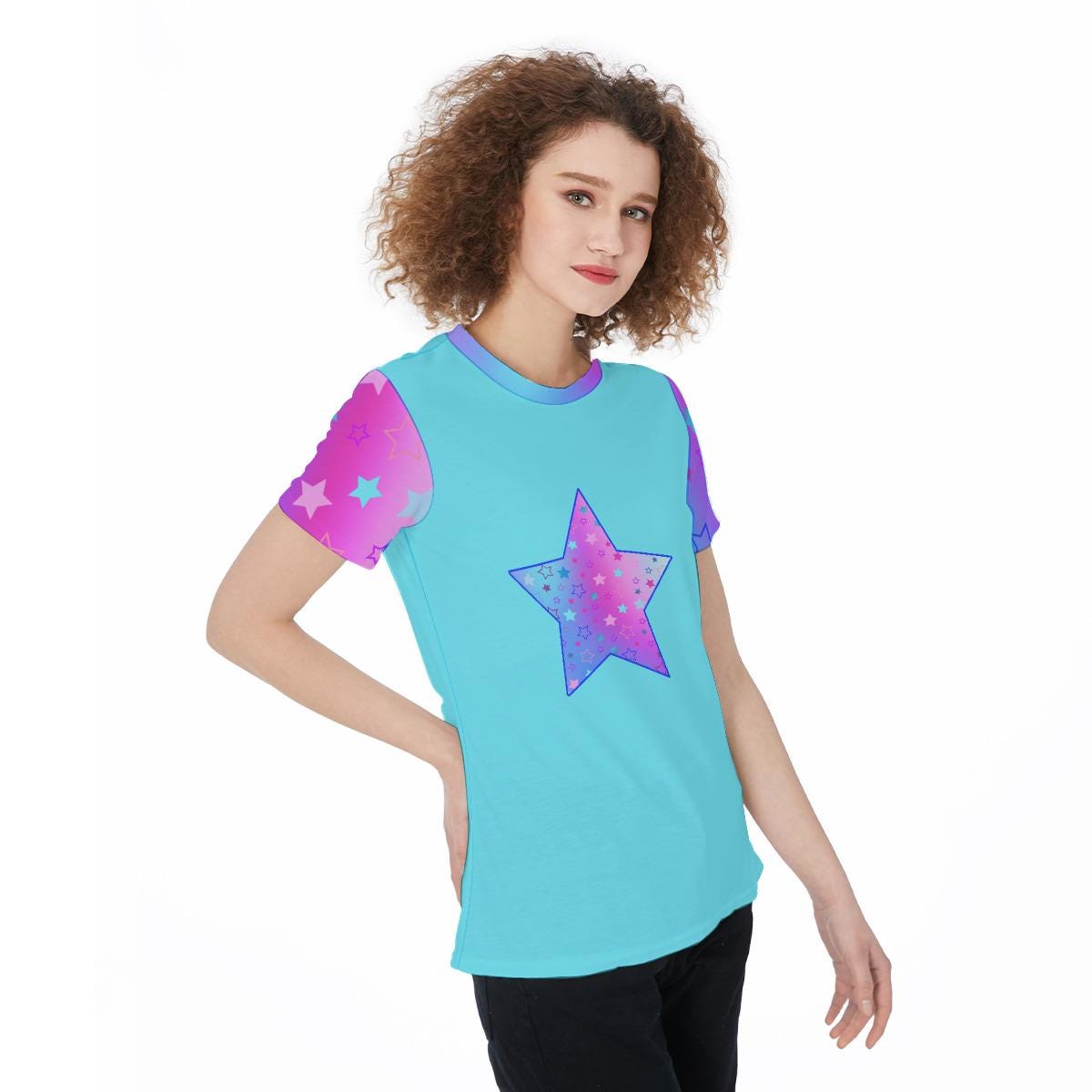 Celestial Blue Pink Purple Pajama Shirt with Stars Round Neck T-Shirt for Women
