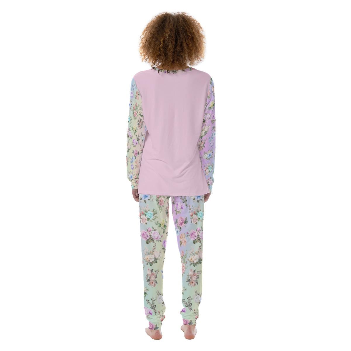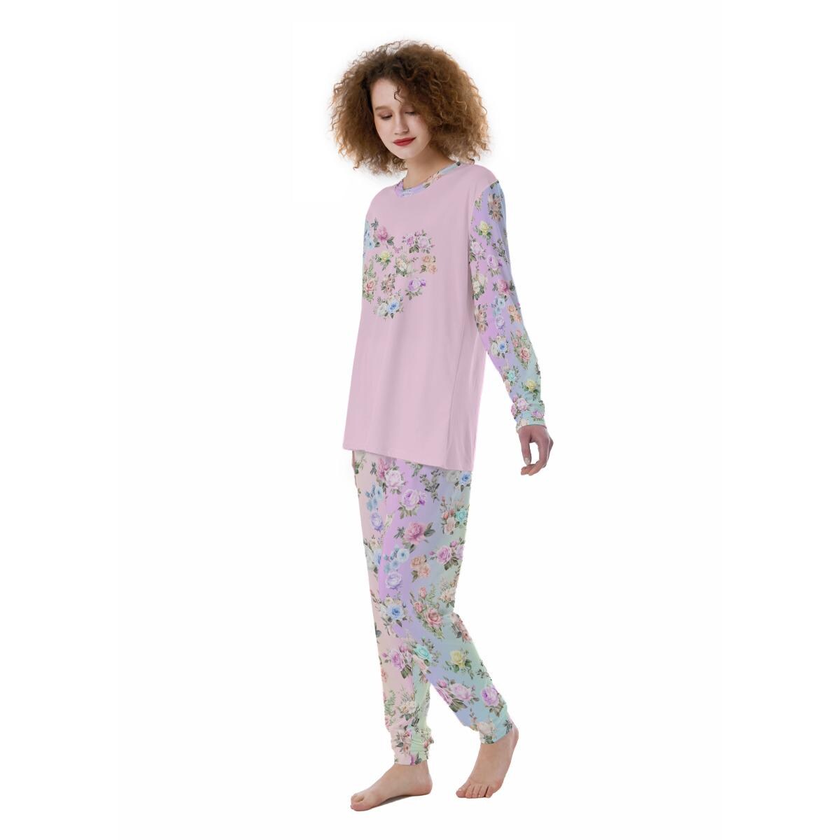 Women’s Pajama Set – Pastel Rainbow Floral Pants with Matching Pink Long Sleeve Top