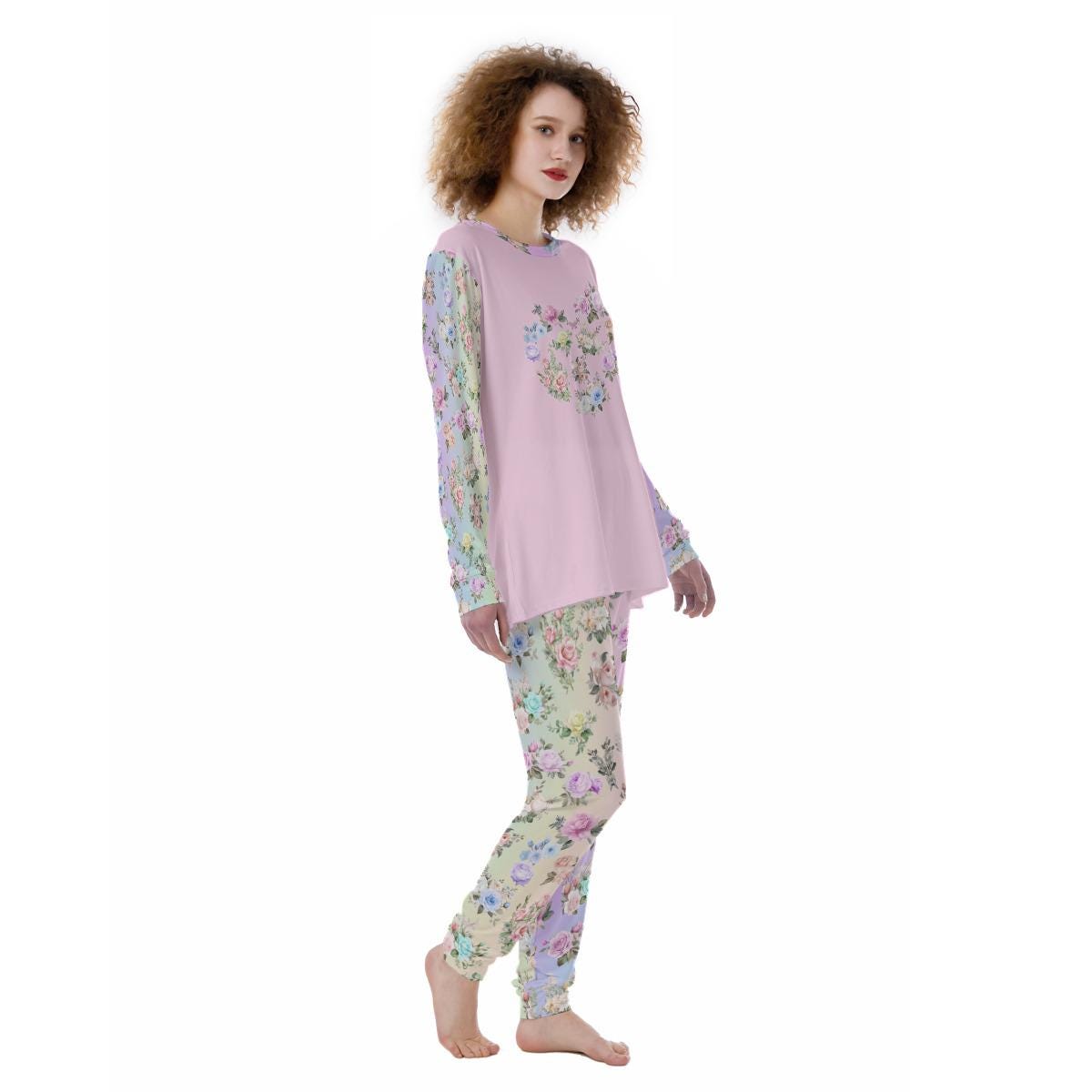 Wrap yourself in softness and serenity with this Women’s Pajama Set featuring dreamy pastel rainbow floral bottoms paired with a matching solid pink long sleeve top. The gentle floral hues add a cheerful yet calming touch, perfect for cozy evenings and peaceful mornings.