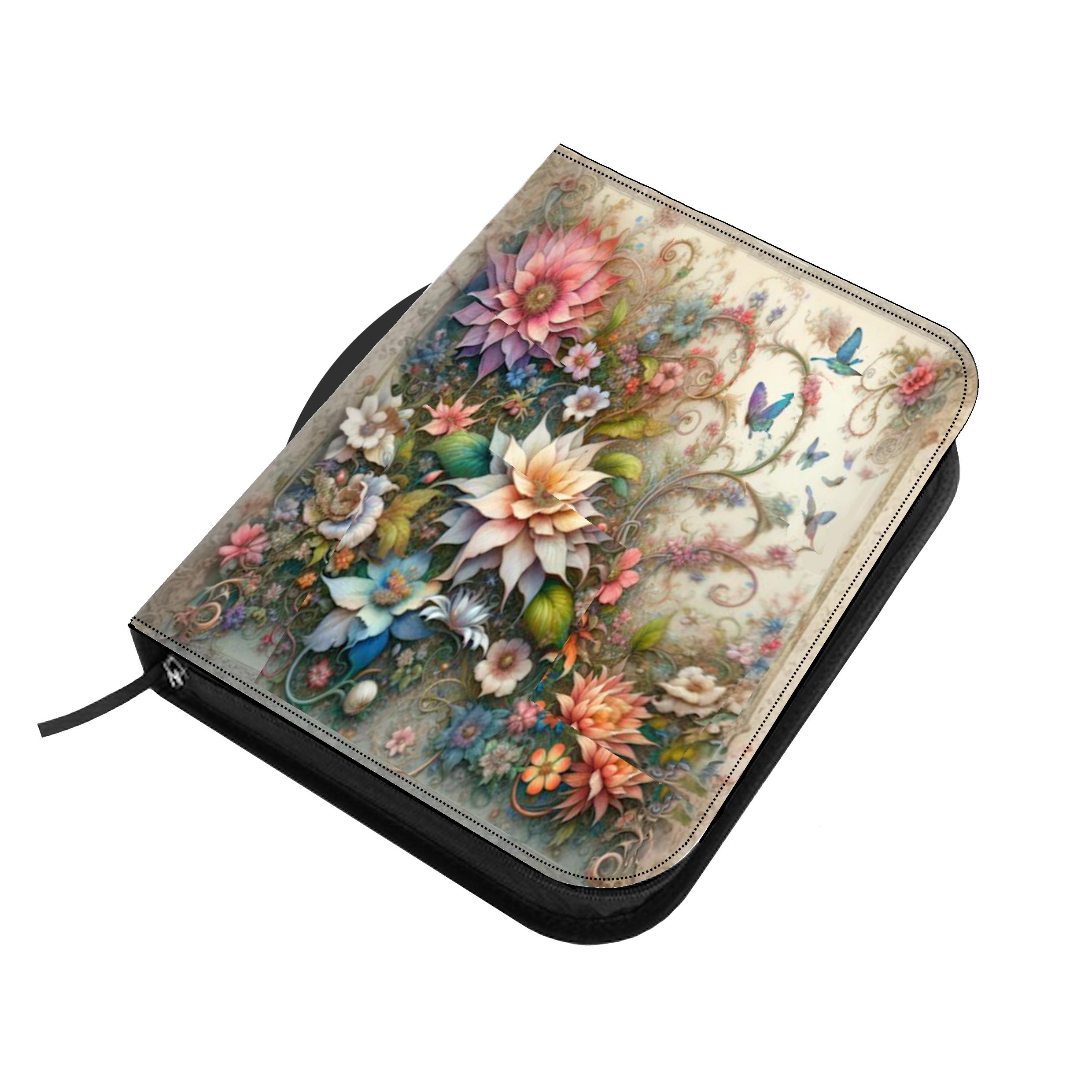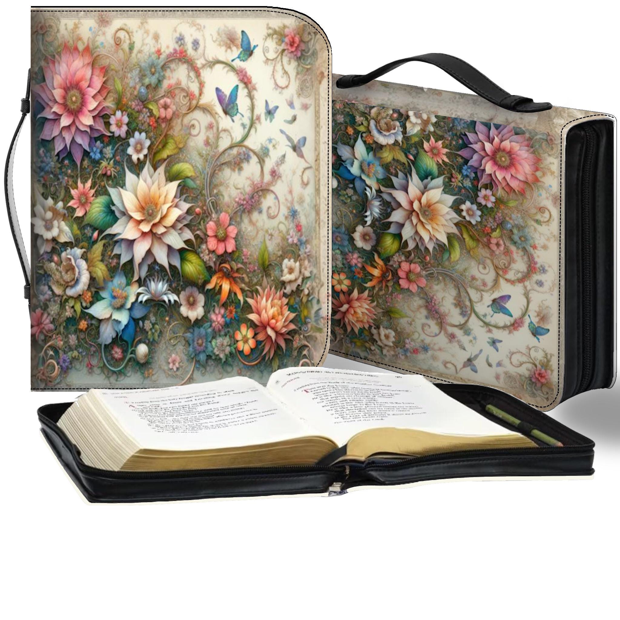 A vibrant and whimsical Bible cover featuring a floral arrangement with pink and yellow dahlia flowers, butterflies, and foliage on a textured, vintage-inspired background. Perfect for those who want to add a touch of color and elegance to their Bible while keeping it protected. Ideal for gift-giving during Easter, Mother's Day, or other special occasions.