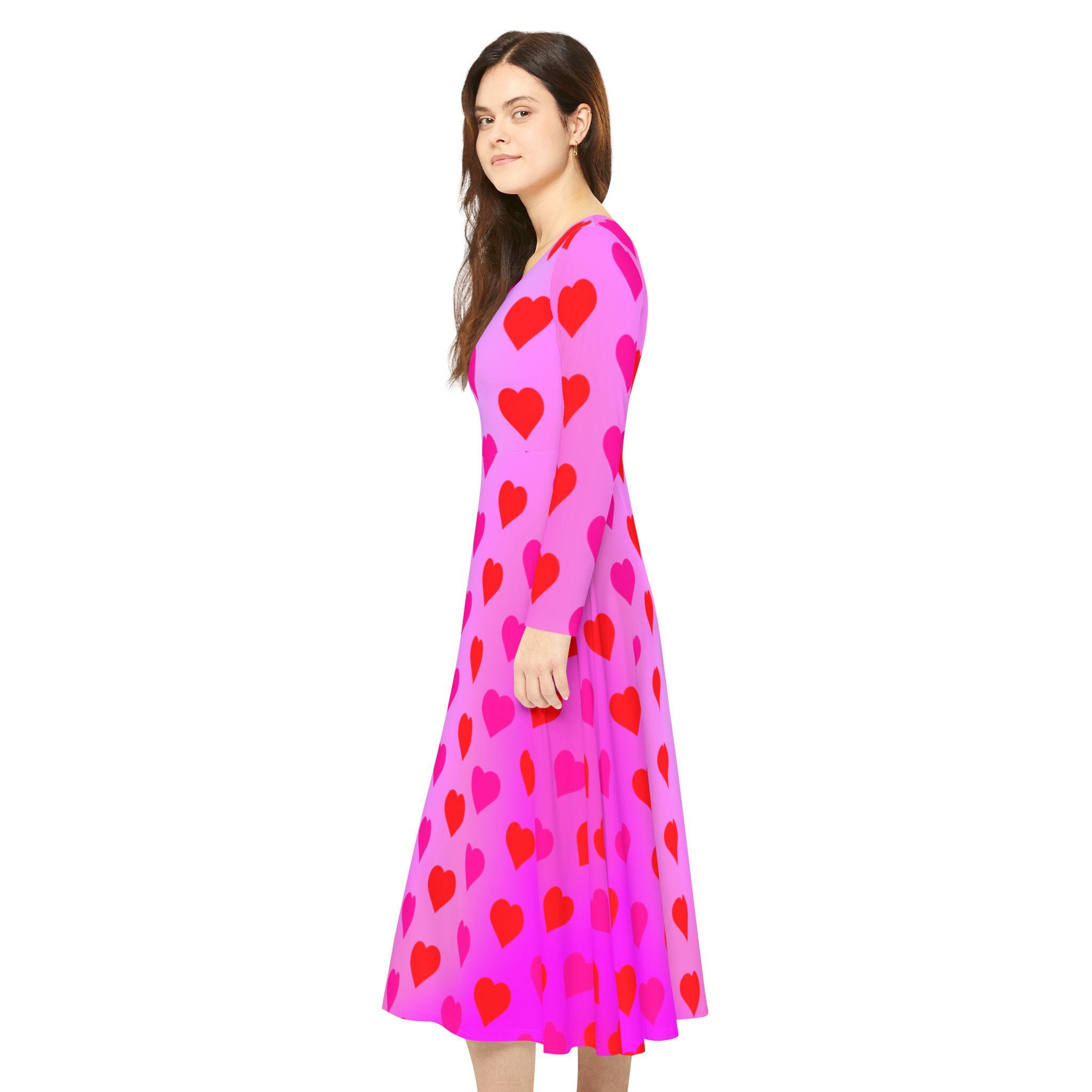 This women's long sleeve dance dress features hearts and swirls on a pink to purplr gradient background, perfect for Valentine's Day. Made of 100% polyester, it is strong, durable, and dries quickly. The high cut neckline and vibrant colors make it a standout piece for dancers and performers. Seam thread color automatically matched to design. Regular fit.