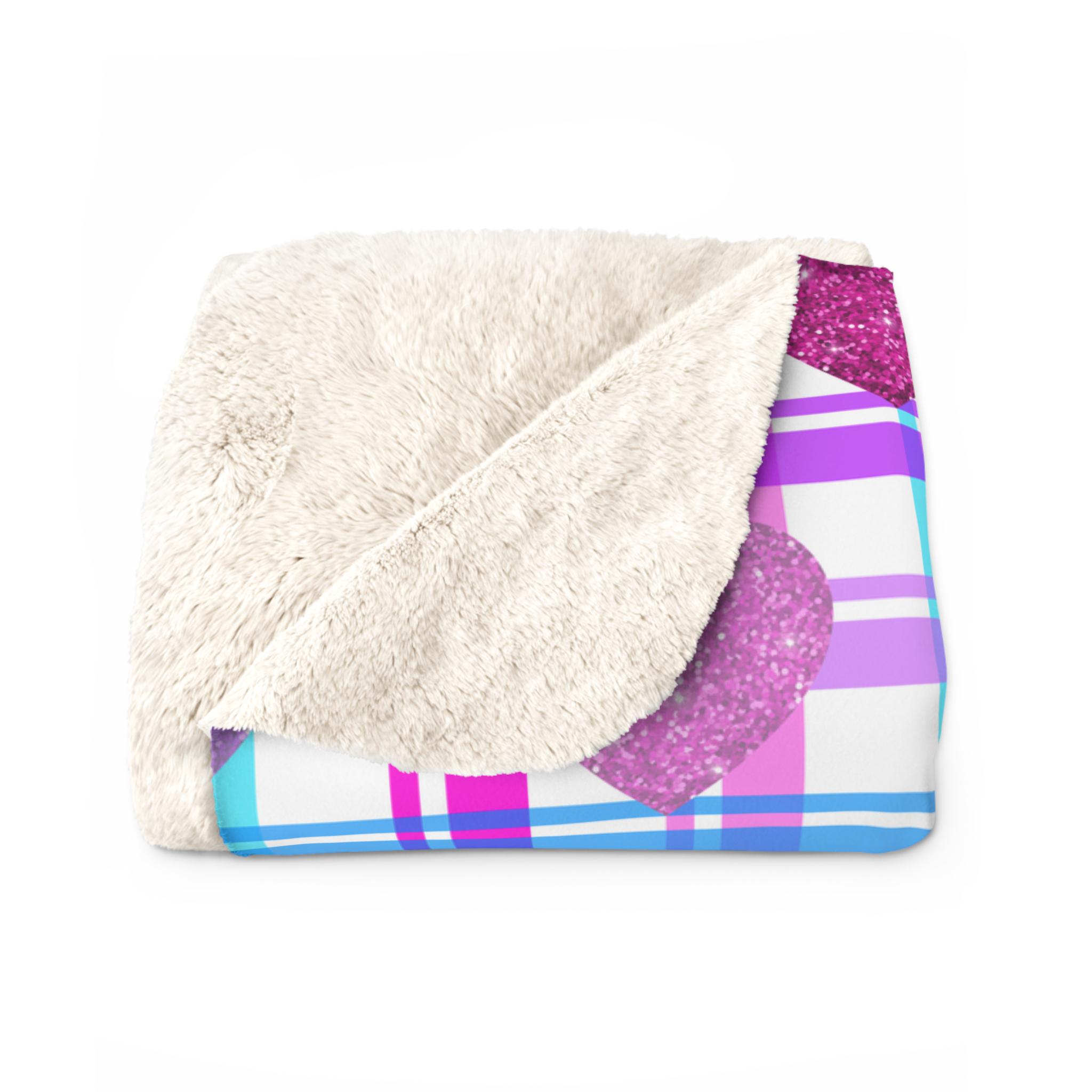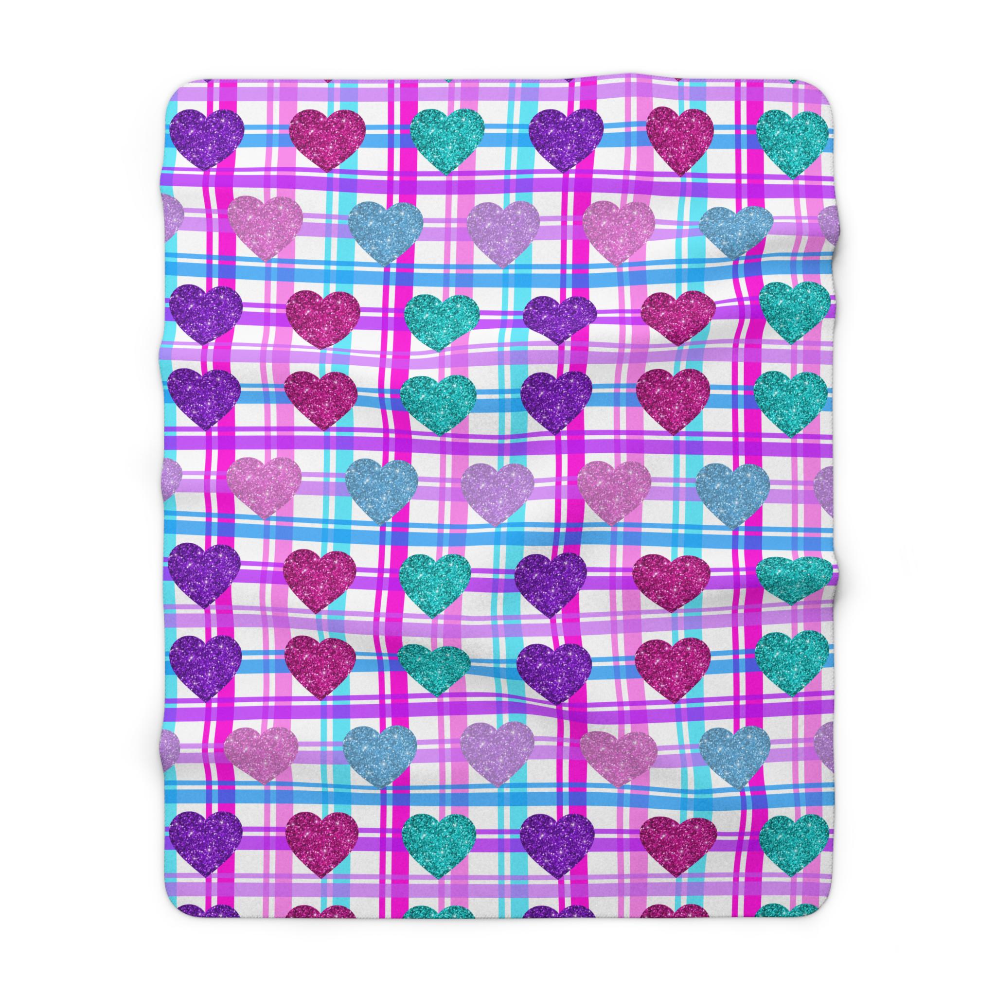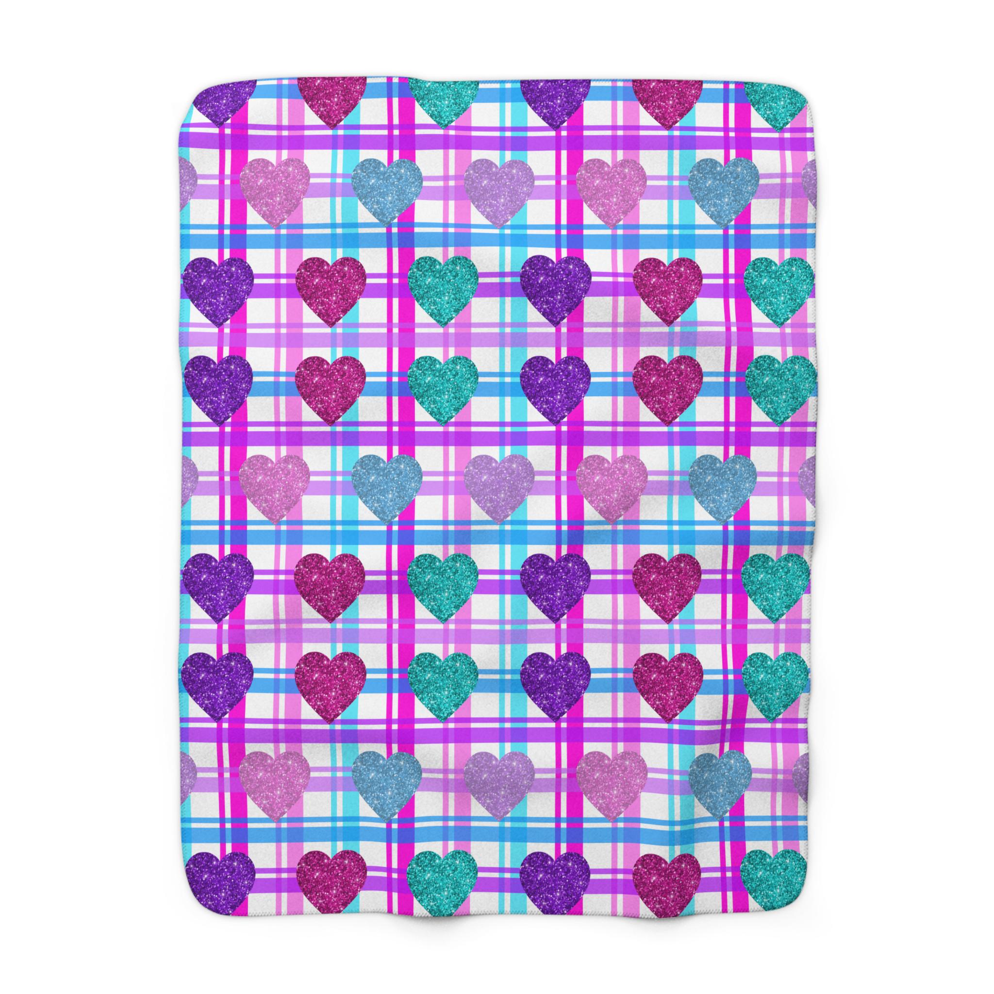 This cozy Blanket features multiple colored hearts on a pink, purple, and blue plaid background. Perfect for snuggling up on the couch or adding a pop of color to a room, this blanket is ideal for anyone who loves warmth and comfort. It's great for gifting on Valentine's Day, anniversaries, or birthdays.