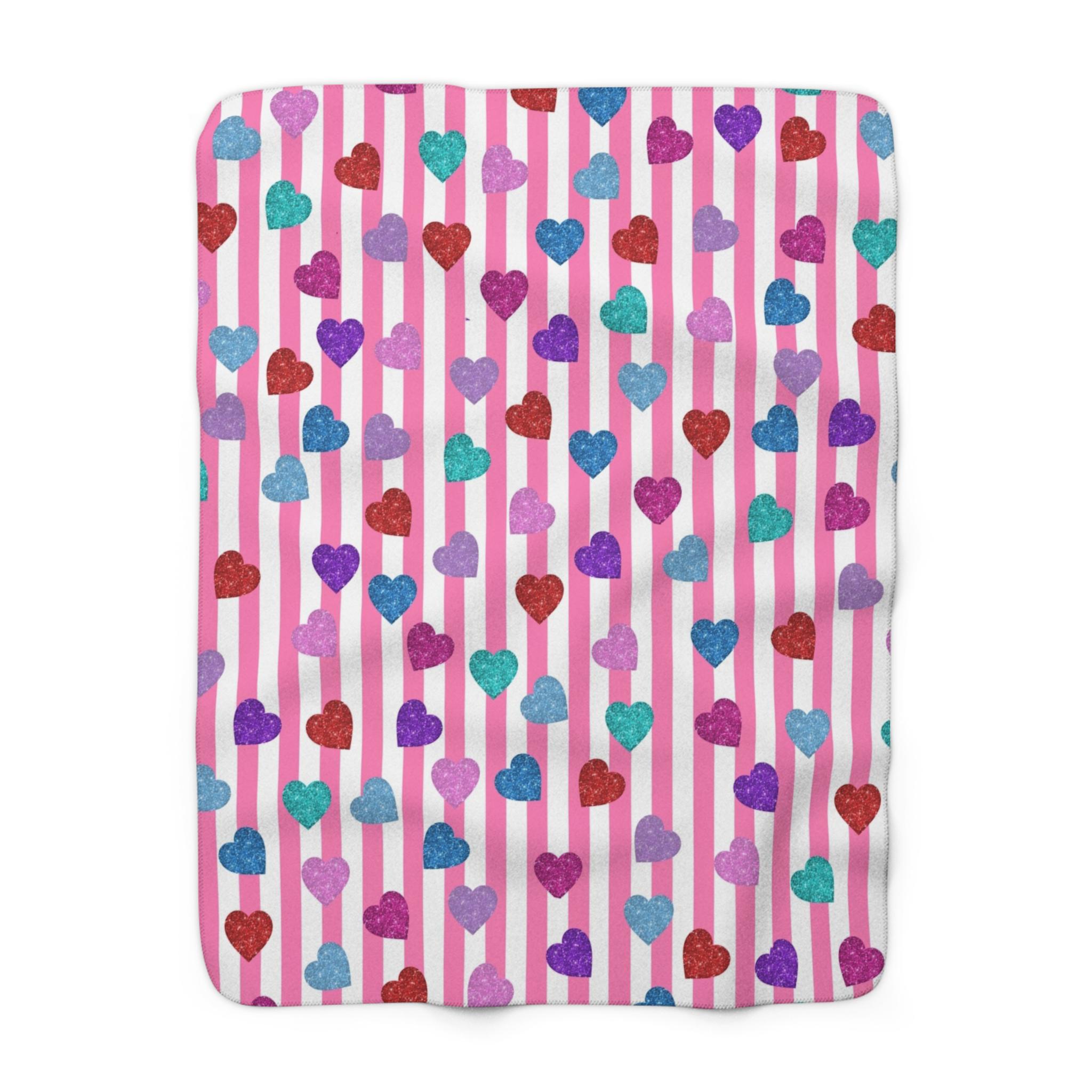A cozy Sherpa Blanket featuring multiple colored hearts on a pink and white striped background, perfect for adding warmth and comfort to chilly nights. Ideal for those who love snuggling up with a soft blanket while watching TV or reading a book. Great for Valentine's Day, birthdays, or as a thoughtful gift for a loved one.