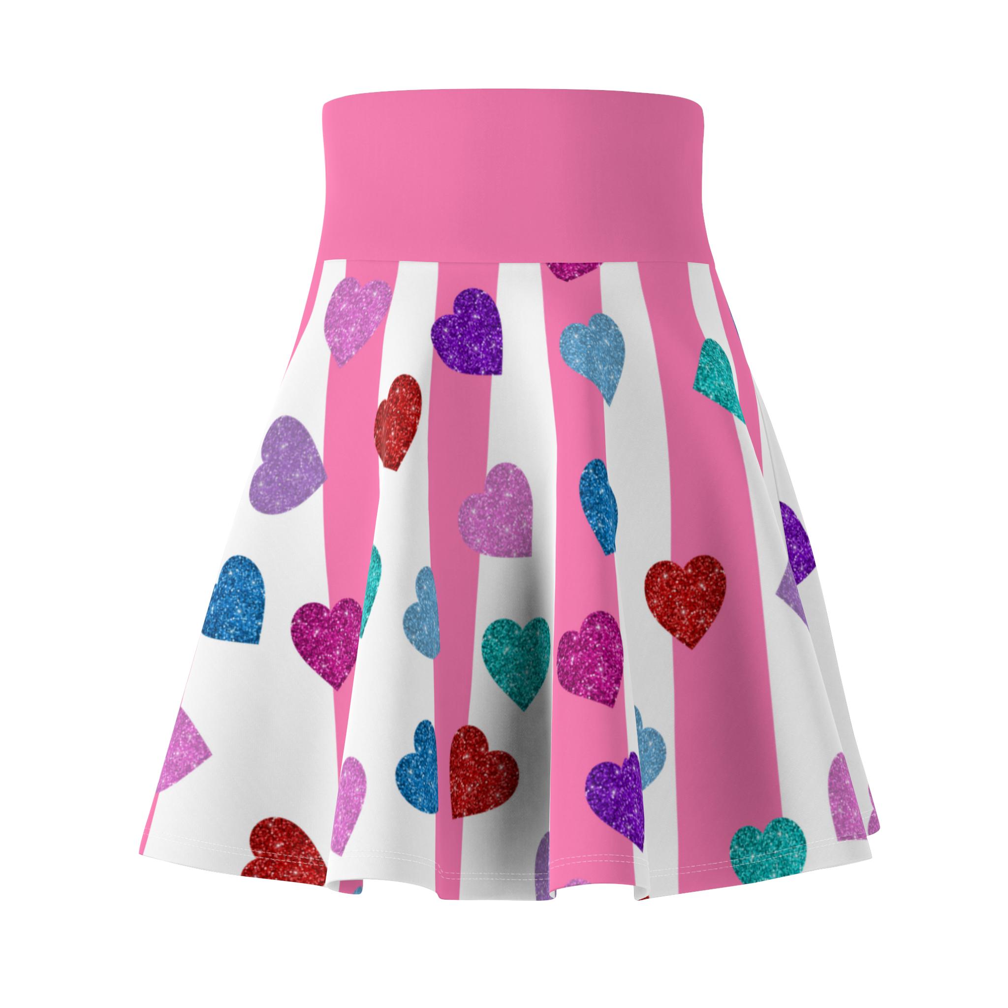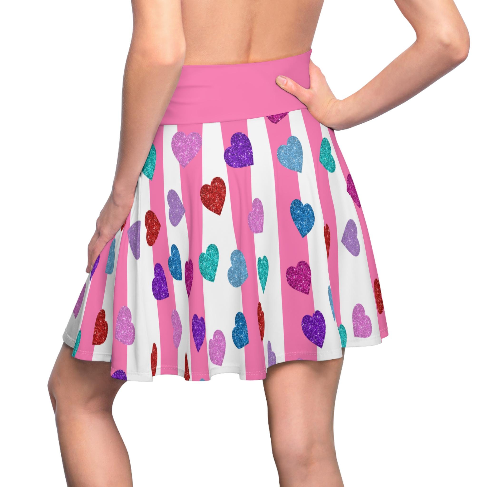 This Skater Skirt features multiple colored hearts on a pink and white striped background, giving off a fun and playful vibe. Perfect for women looking for a versatile and stylish piece to wear on casual outings or special occasions. Great for Valentine's Day, birthdays, or everyday wear.