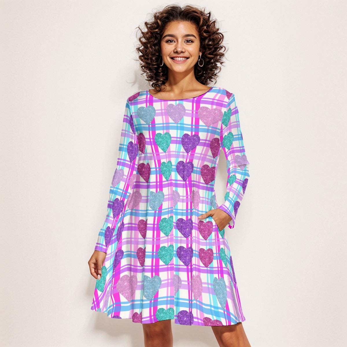 Step into playful elegance with our long sleeve crew neck above the knee flared mini dress, designed to make a statement! This enchanting dress features a vibrant, colorful heart pattern set against a delightful pink, blue, and purple plaid background. Perfect for a day out or a fun evening gathering, its flared silhouette adds a touch of whimsy while ensuring comfort and style. Dress it up with your favorite accessories or keep it casual with stylish sneakers—this versatile piece is a must-have addition to your wardrobe. Celebrate your unique vibe and let your personality shine with this charming dress! Perfect for Valentine's Day.