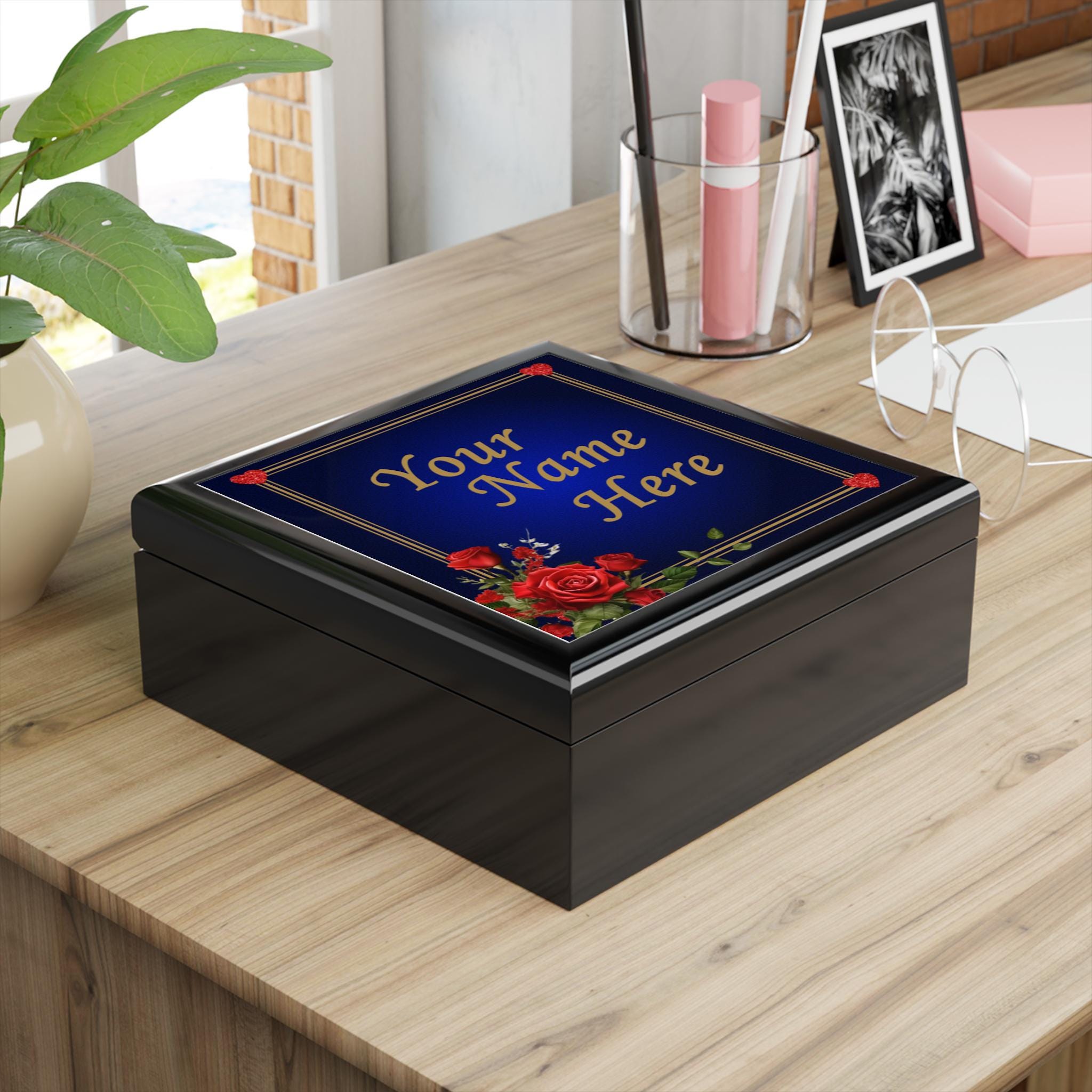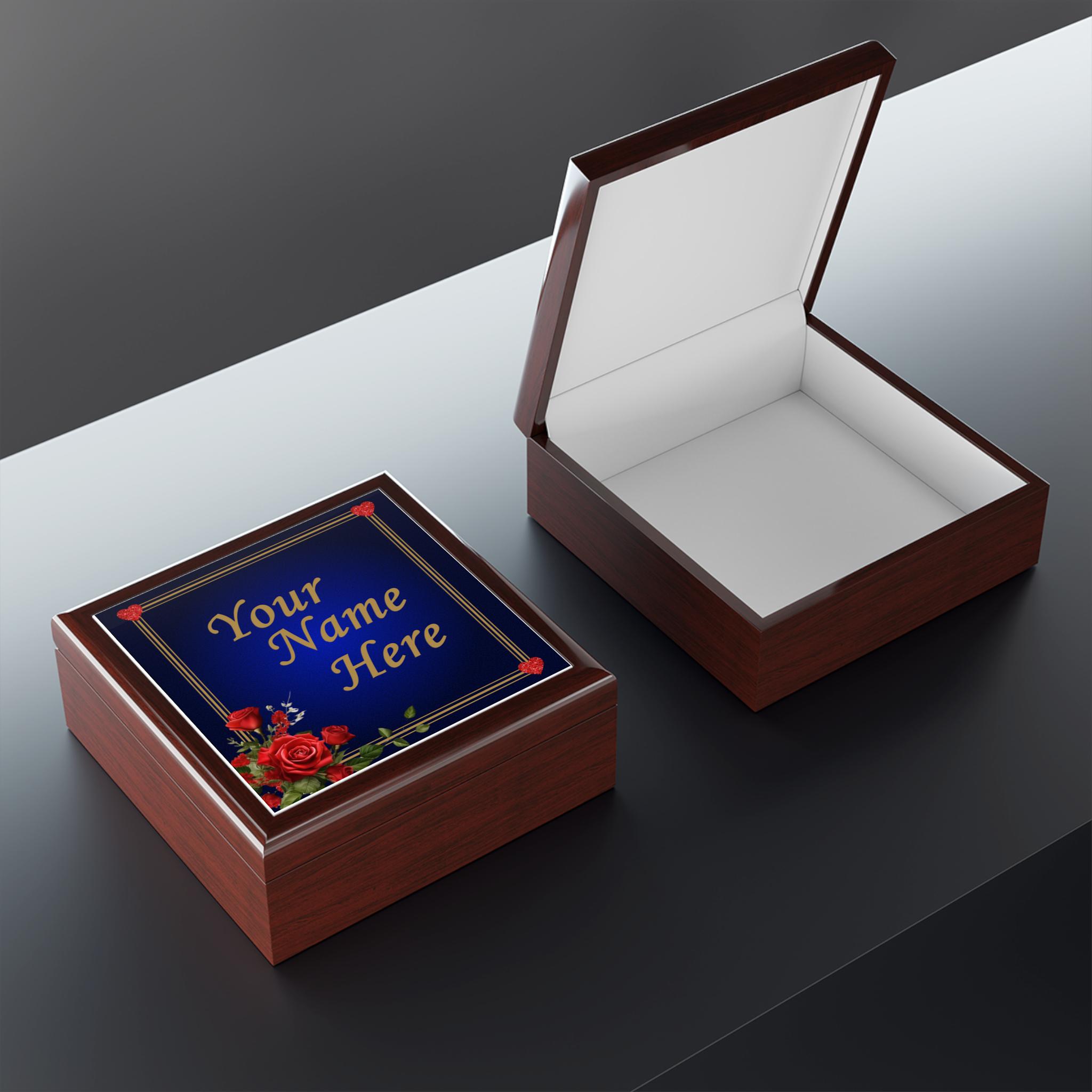 Introducing a beautifully crafted Jewelry Box that serves as a perfect blend of elegance and functionality, personalized with your name. Made from high-quality rubberwood with a glossy finish, this Jewelry Box is not only a stylish storage solution but also a decorative piece for any space. With its soft felt interior lining, it will keep your precious items safe and scratch-free. The charming floral design on the lid, featuring vibrant roses, adds a romantic touch, making it an ideal gift for loved ones. Perfect for special occasions like anniversaries, weddings, or Mother’s Day, this Jewelry Box is a thoughtful present for anyone who cherishes beautiful jewelry and keepsakes. Add a touch of sophistication to your vanity or gift it to a friend, making memories last forever with every piece you store.