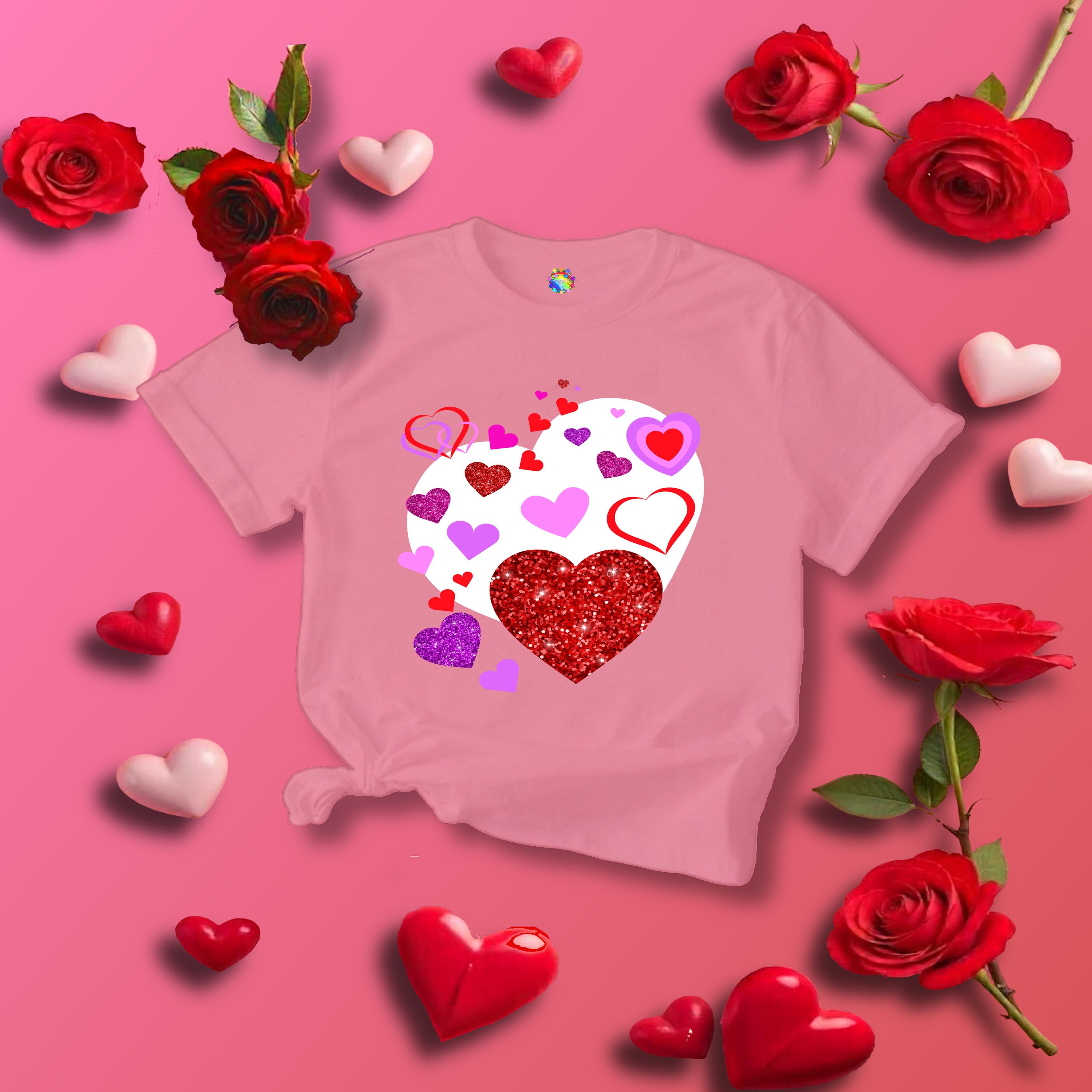 A T-Shirt featuring different sized hearts, giving off a cute and romantic vibe. Perfect for everyday wear or as a casual statement piece. Ideal for those who love expressing themselves through their clothing. Great for Valentine's Day, anniversaries, and casual events.