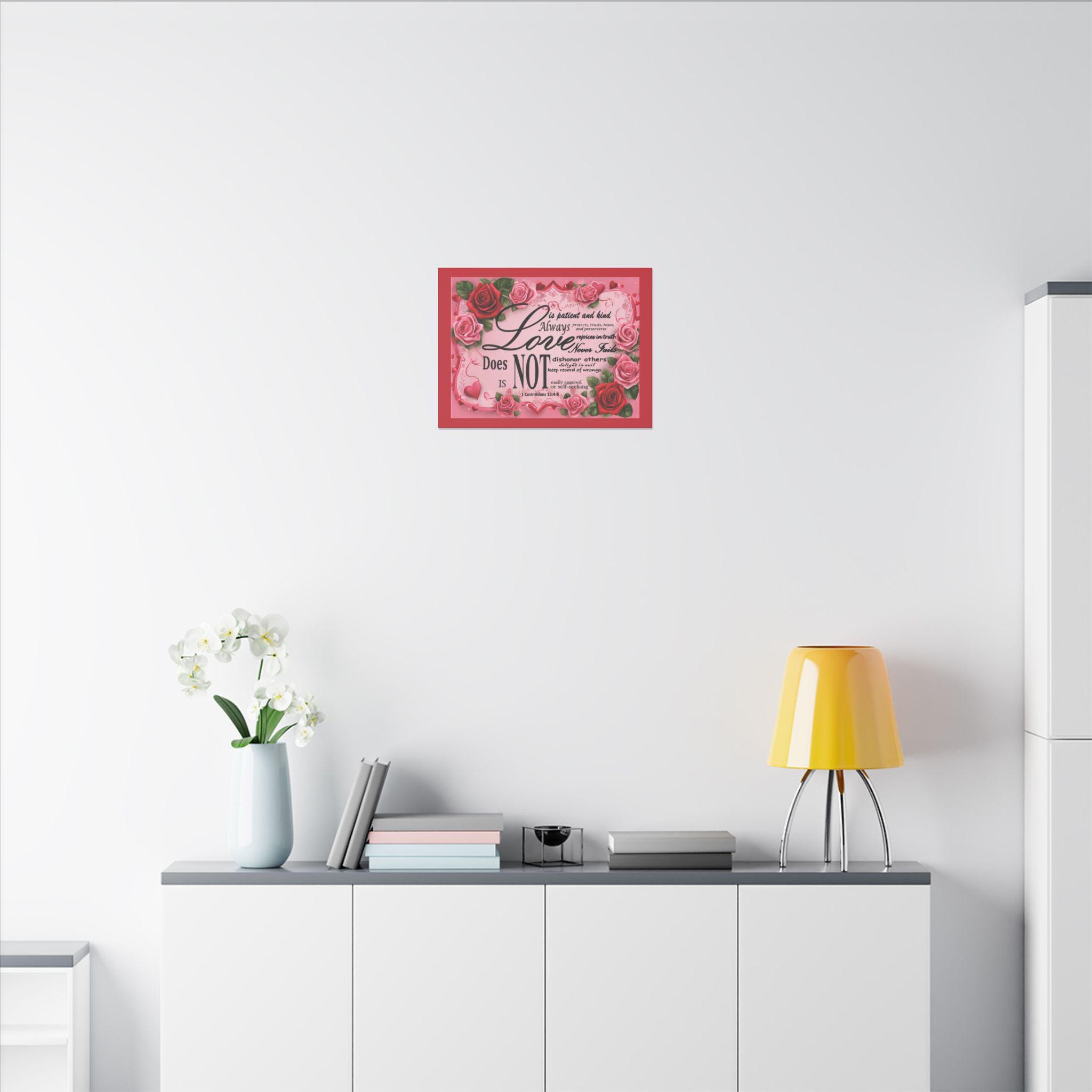A beautiful canvas print featuring 1 Corinthians 13:4-8 bible verse surrounded by a rose border on a pink background. This piece exudes a sense of Christian love and tranquility, perfect for adding a touch of spirituality to any space. Ideal for those who appreciate meaningful decor and spiritual reminders. Relevant for holidays such as Valentine's Day, Christmas, and Easter.
