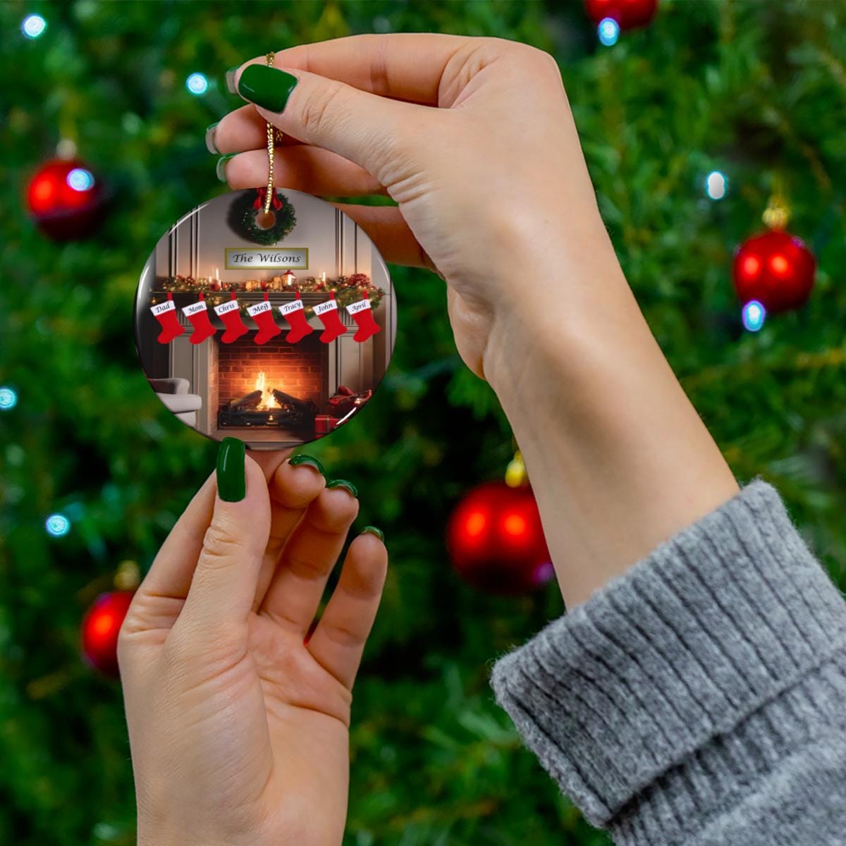 Bring a cozy and festive touch to your holiday decor with this ceramic ornament featuring a fireplace decorated for Christmas with personalized family stockings hanging from the mantle. Perfect for those who love the holidays and enjoy personalizing their decorations. Ideal for Christmas celebrations and gift-giving, these beautifully crafted Ceramic Ornaments bring warmth and vibrancy to your holiday decor. With their stunning glossy finish and vibrant colors, they instantly elevate your Christmas tree or any festive space. Each ornament features the same eye-catching design on both sides, making it a perfect addition to your cherished decorations. Ideal for families looking to add a personal touch during the holiday season, these ornaments also make thoughtful gifts for friends and loved ones. Celebrate Christmas, with these unique ornaments that create lasting memories and bring joy to every celebration. They’re perfect for decorating, gifting, or even as delightful keepsakes to hang around the house.
