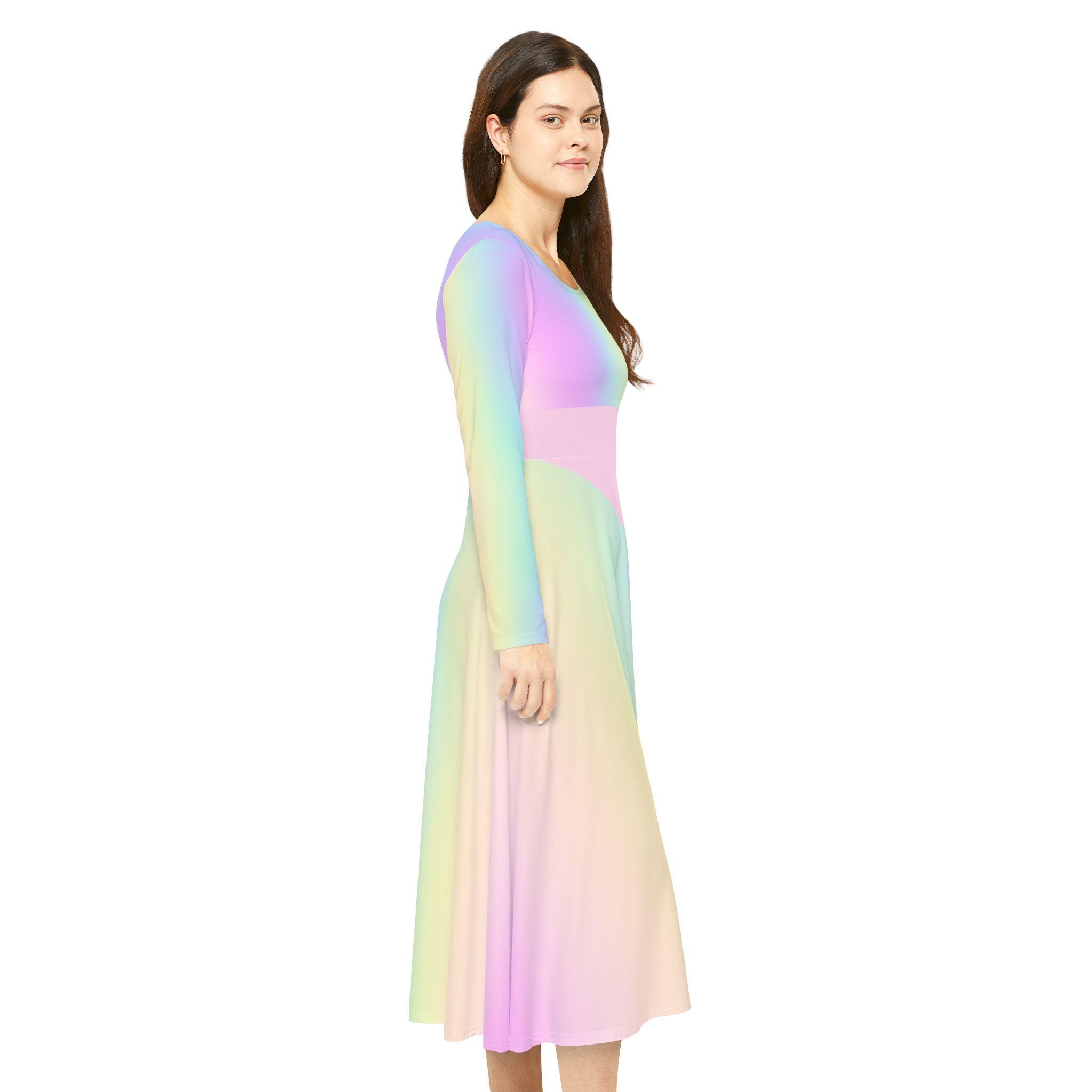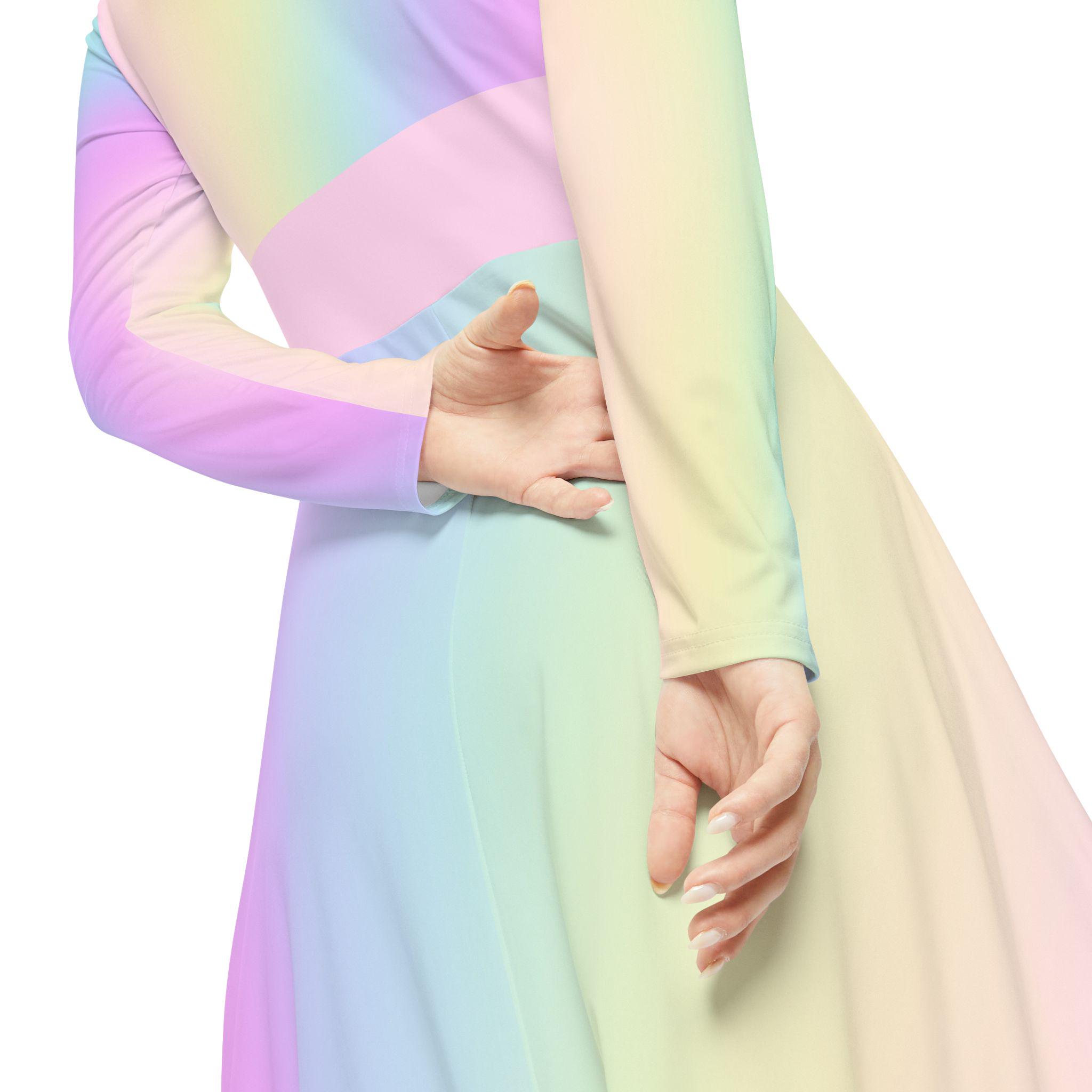 A pastel rainbow gradient long sleeve dance dress perfect for spring, Easter, or Mother's Day. This dress gives off a cheerful and vibrant vibe, ideal for dancers or anyone looking to brighten up their wardrobe for special occasions. It is relevant for spring celebrations and dance performances.