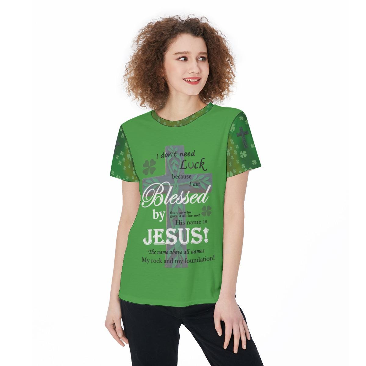 This Women's round neck t-shirt features a bold design that reads 'I don't need luck because I am blessed by Jesus', giving off a confident and empowering vibe. Perfect for female sports enthusiasts and believers, this jersey is ideal for wearing during workouts, games, or simply to make a statement. Relevant for sports events, religious gatherings, and casual everyday wear.