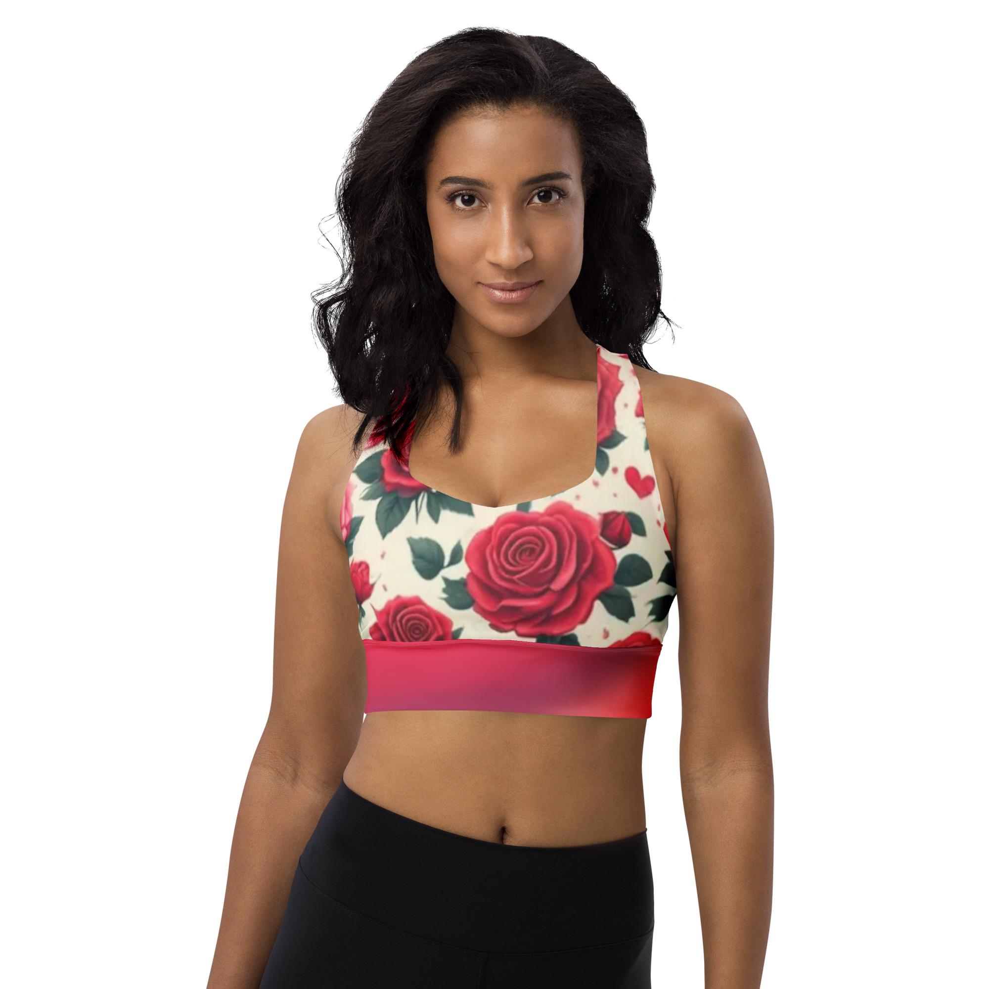Floral Red Rose Longline Sports Bra for Women | Recycled Fabric Activewear Top, Workout & Yoga Crop Tank