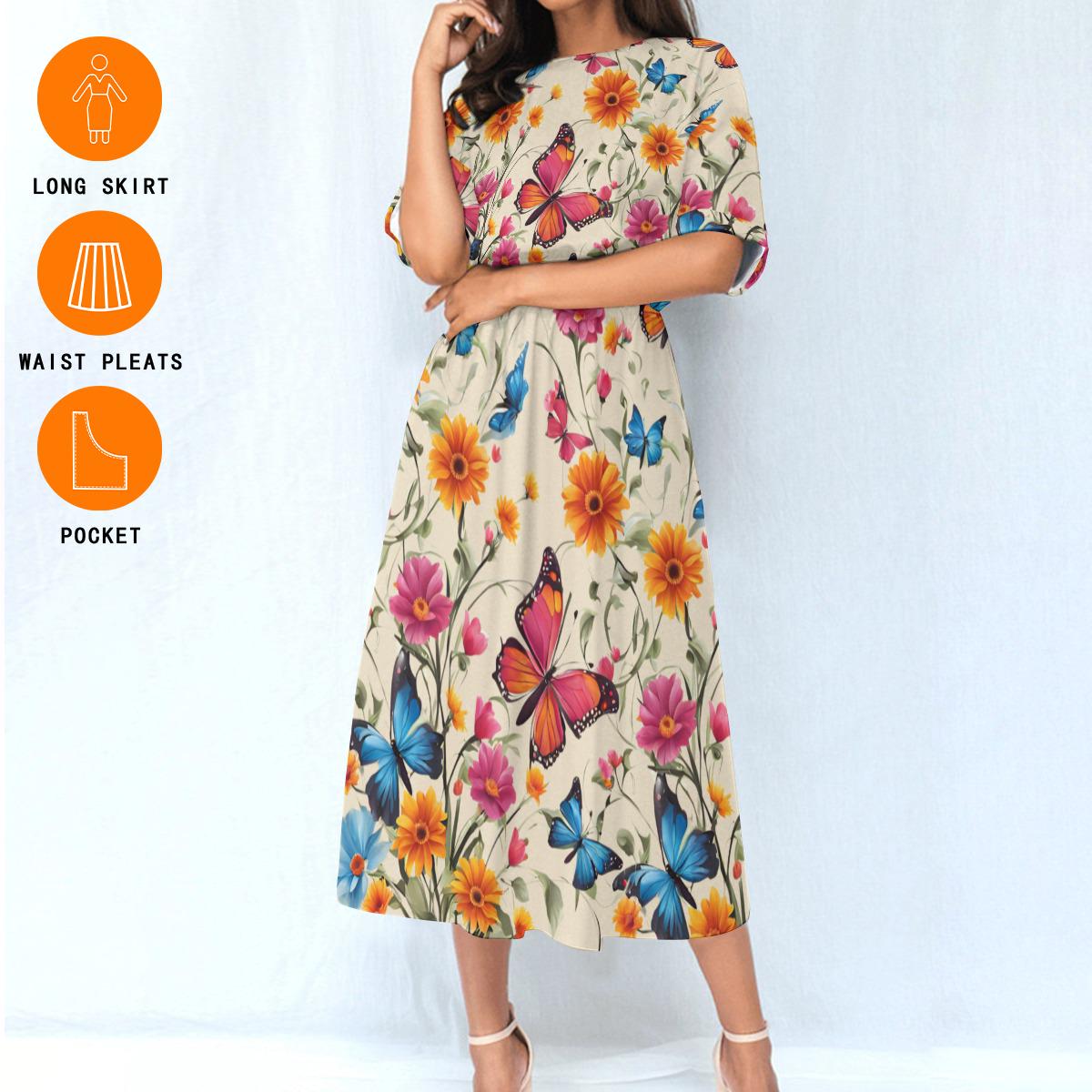 Charming Floral & Butterfly Ankle Length Dress - Comfortable Elastic Waist Design