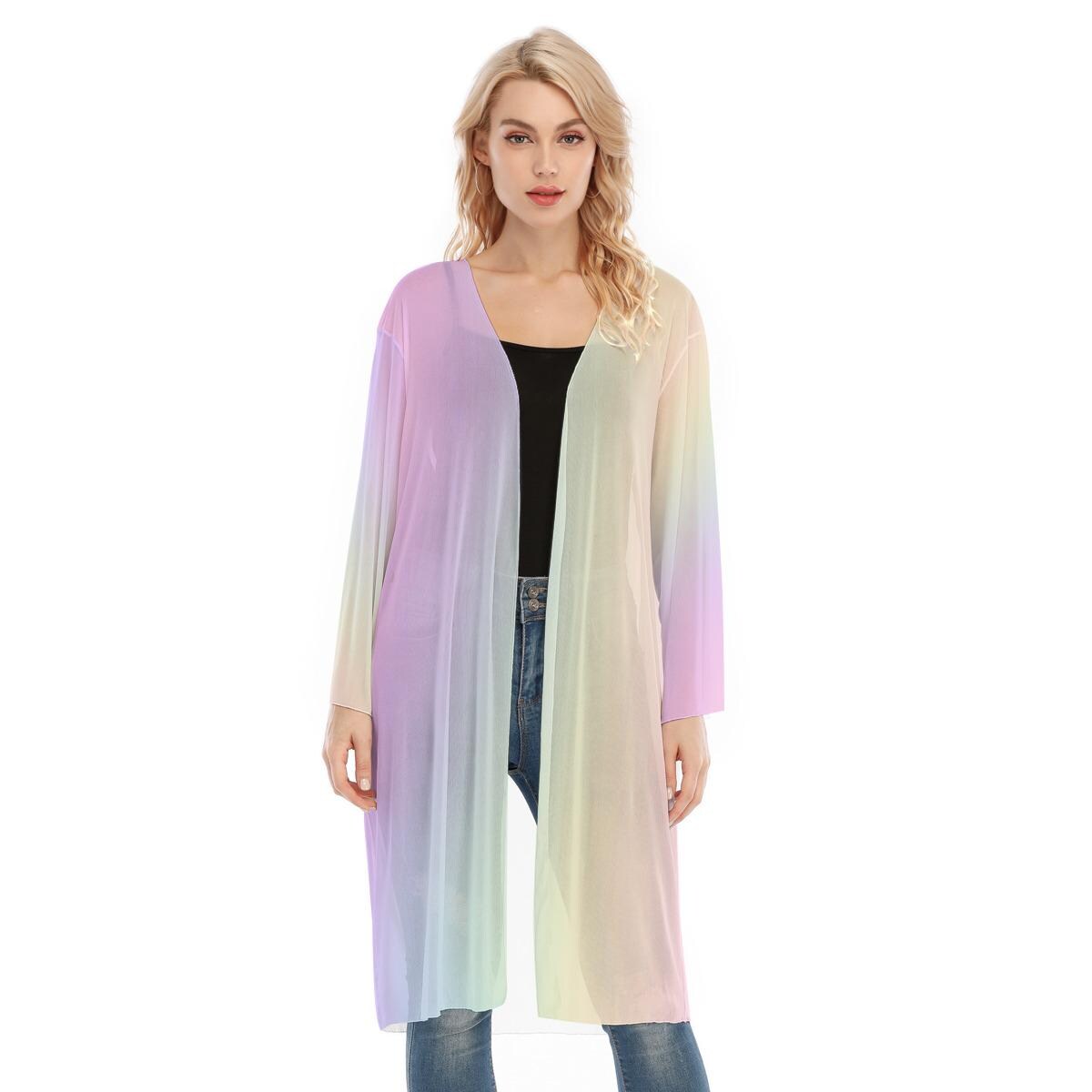 Pastel Rainbow Mesh Transparent Knee Length Cardigan - Lightweight Summer Layering Piece